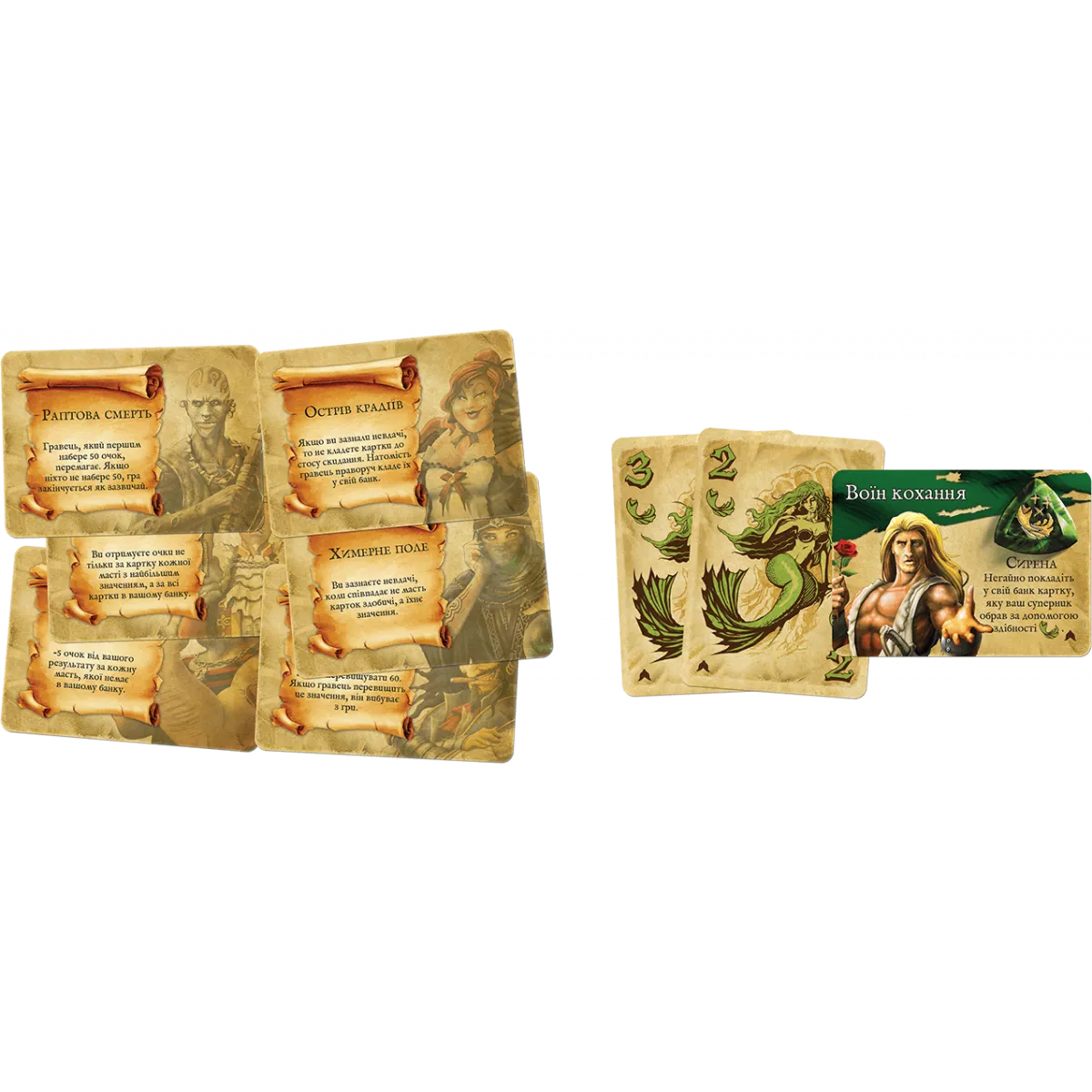 У коробці 1 правила;, 60 карток здобичі;, 17 карток здібностей піратів;, 6 карток варіантів гри;, 4 картки перебігу гри;, 4 картки-пам’ятки., 3 картки варіанта гри «Здібність русалки».