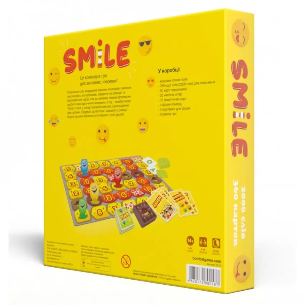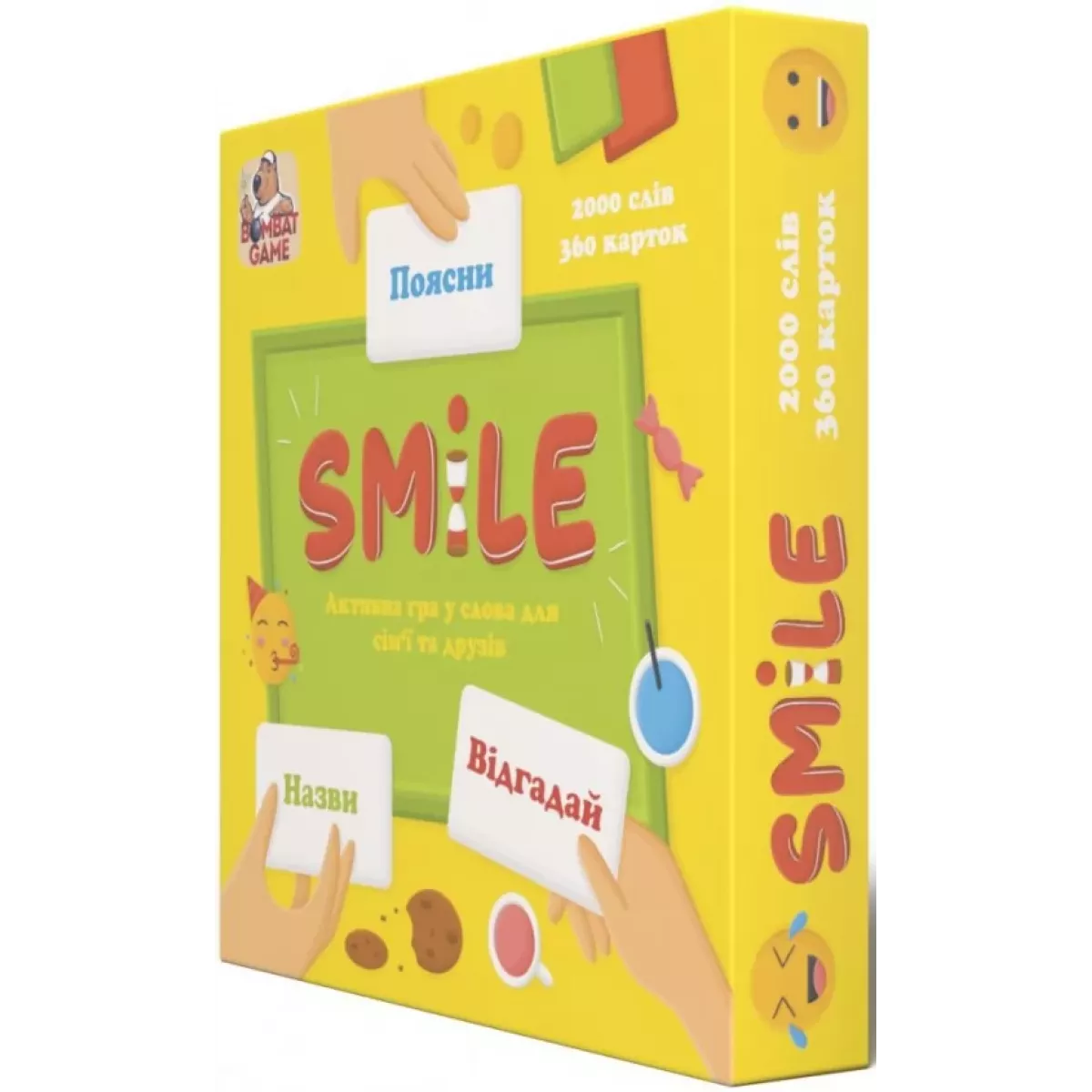 Ласкаво просимо у світ безмежних веселощів та щирих посмішок з настільною грою Смайл (Smile). Оновлена версія! Це не просто гра, це запрошення до захопливої подорожі світом емоцій, де кожна карта, кожен хід наповнений стратегією, інтуїцією та, звісно ж, величезною порцією гарного настрою. Якщо ви шукаєте ідеальний спосіб провести час з друзями чи родиною, поринути в атмосферу легкого суперництва та бурхливих емоцій, тоді оновлена версія легендарної гри Смайл стане вашим беззаперечним фаворитом. Приготуйтеся до незабутніх ігрових сесій, адже "Смайл" – це справжній магніт для позитиву!