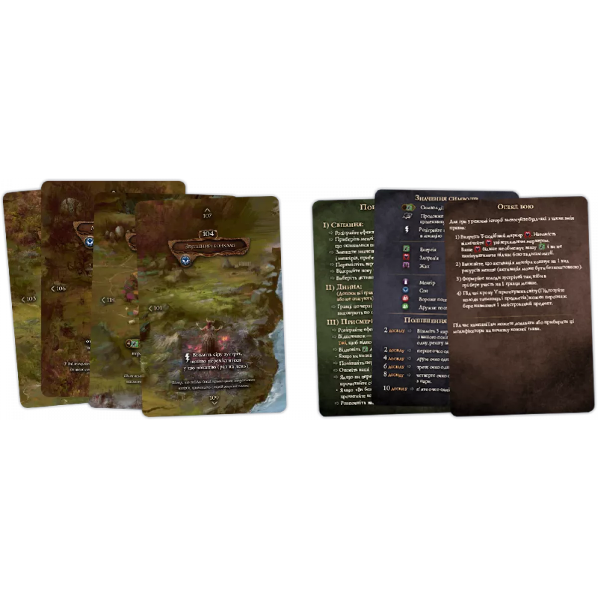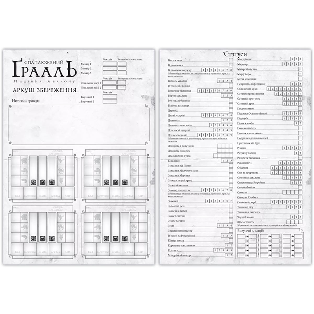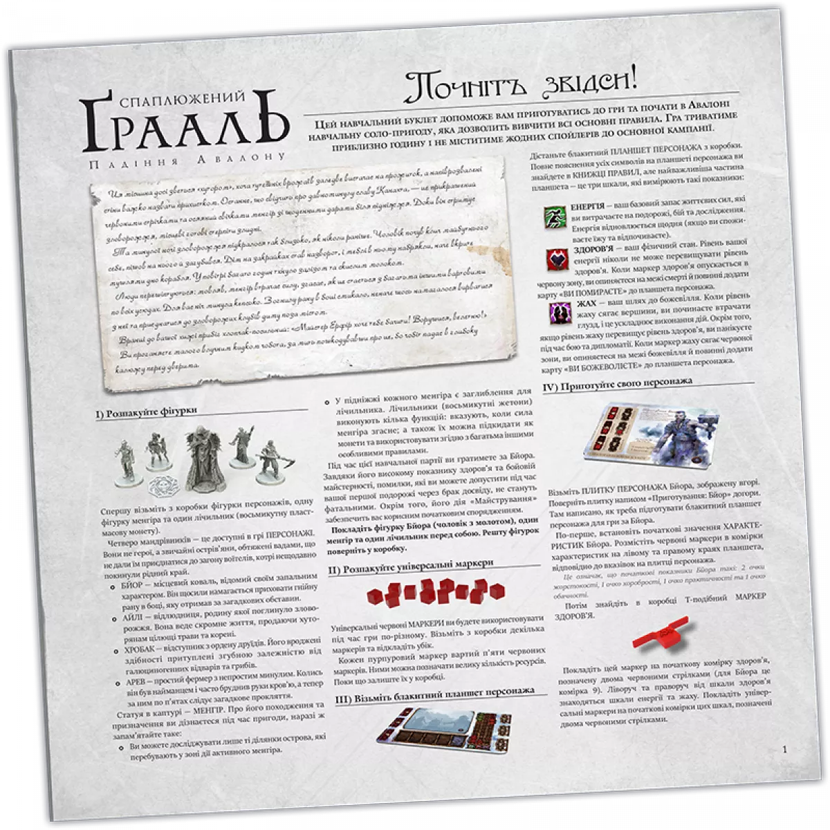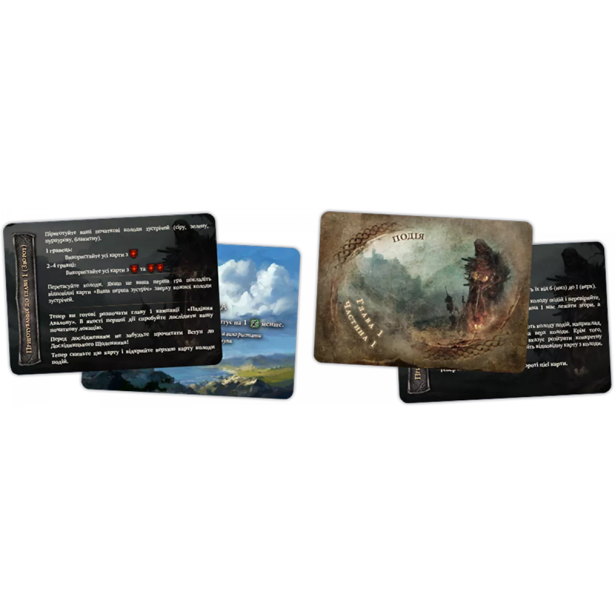 | У коробці | Фігурки (4 ФІГУРКИ ПЕРСОНАЖІВ, 1 ФІГУРКА ПРЕДТЕЧІ, 3 ФІГУРКИ МЕНГІРІВ), 4 вступні листи, 4 мапи пригод, 30 аркушів збереження, Путівник грою, Книжка правил, Падіння Авалону. Дослідницький щоденник, 4 планшети, 4 плитки персонажів, 10 лічильників, 8 жетонів часу, 4 жетонів місій, 4 обмежувачі здоров'я, 90 універсальних маркерів, 25 великих маркерів, 1 звичайний кубик та 1 кубик вартового, 200 карток бою/дипломатії, 92 карти події, 120 карт персонажів - 30 карт Арева, 30 карт Хробака, 30 карт Бйора, 30 карт Айлі, 144 карти зустрічей, 4 карти "Ви божеволієте" та 5 карт "Ви помираєте", 11 карт роздільниць, 63 карти локації та 9 карт пам'яток, 42 карти таємниць, 65 карт предметів та 36 карт навичок |