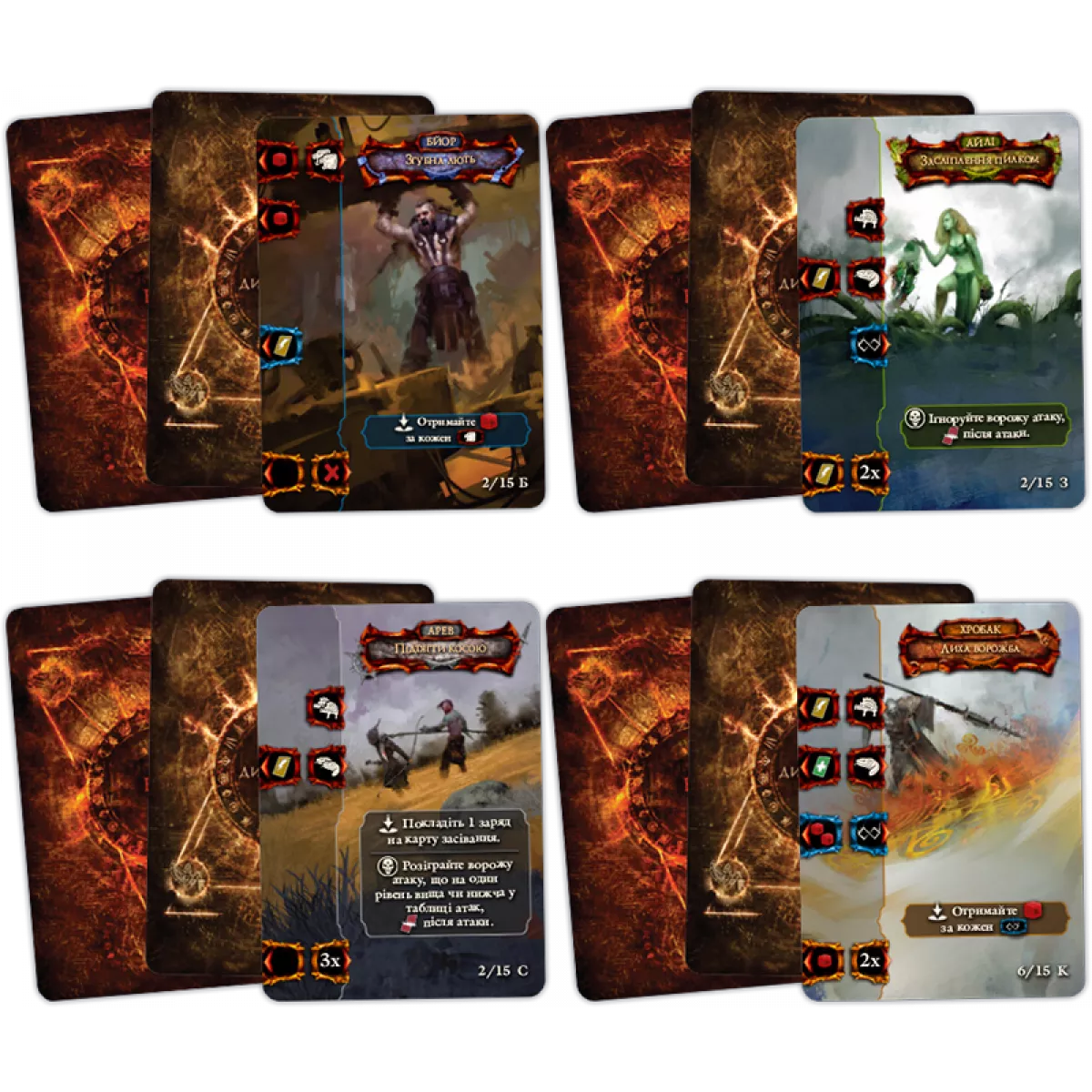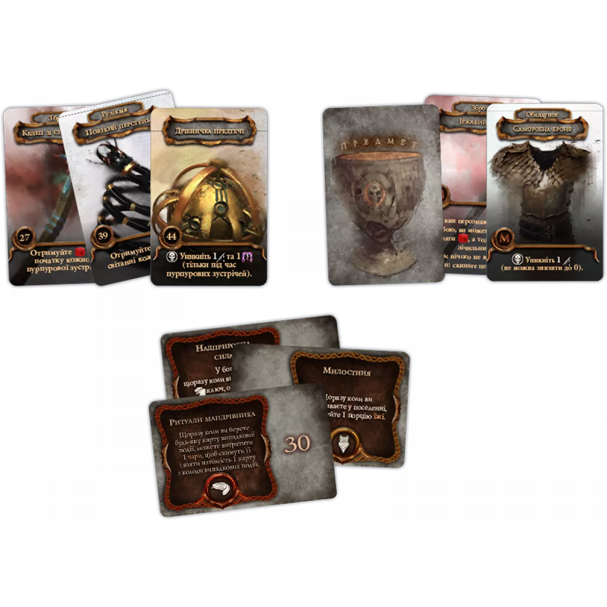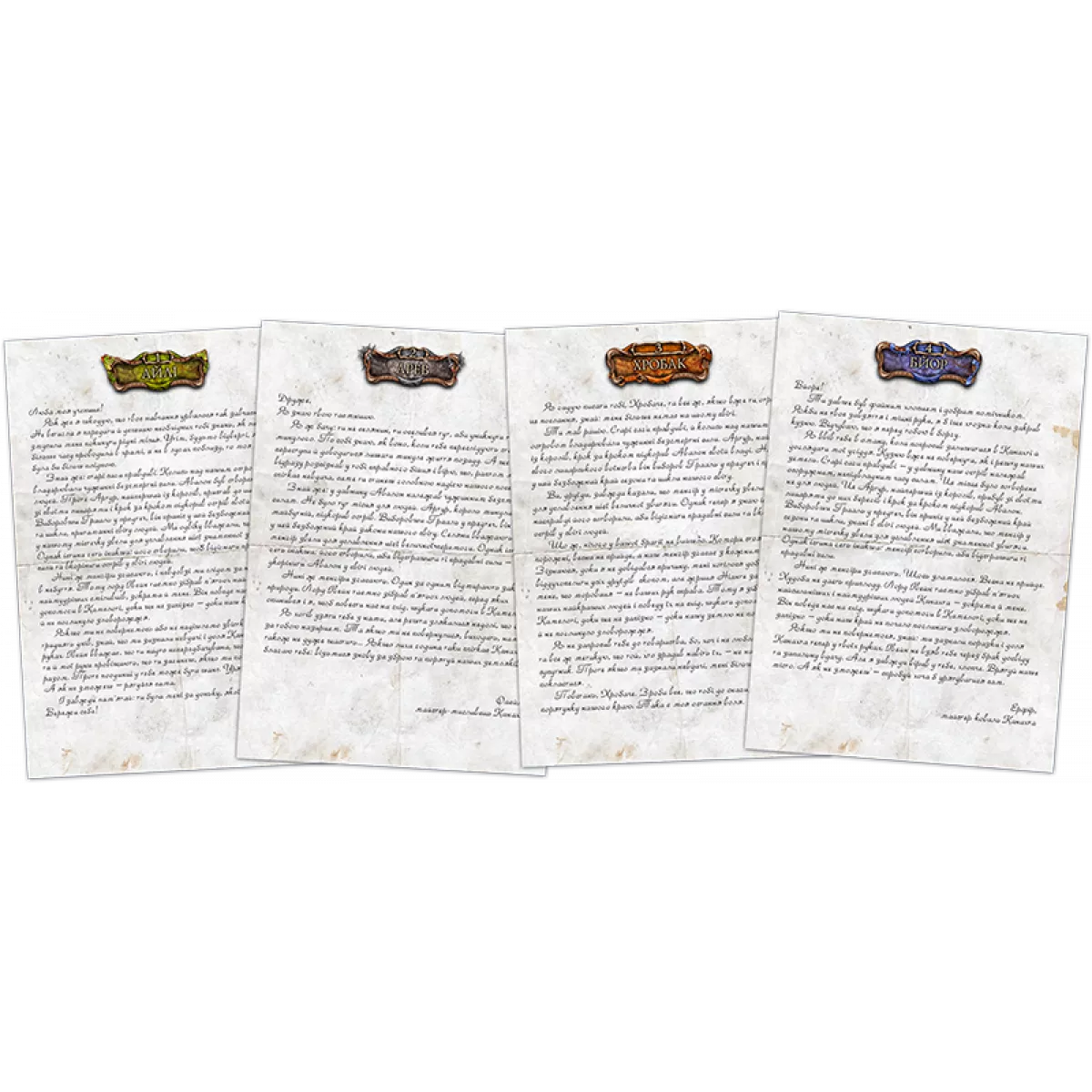 | У коробці | Фігурки (4 ФІГУРКИ ПЕРСОНАЖІВ, 1 ФІГУРКА ПРЕДТЕЧІ, 3 ФІГУРКИ МЕНГІРІВ), 4 вступні листи, 4 мапи пригод, 30 аркушів збереження, Путівник грою, Книжка правил, Падіння Авалону. Дослідницький щоденник, 4 планшети, 4 плитки персонажів, 10 лічильників, 8 жетонів часу, 4 жетонів місій, 4 обмежувачі здоров'я, 90 універсальних маркерів, 25 великих маркерів, 1 звичайний кубик та 1 кубик вартового, 200 карток бою/дипломатії, 92 карти події, 120 карт персонажів - 30 карт Арева, 30 карт Хробака, 30 карт Бйора, 30 карт Айлі, 144 карти зустрічей, 4 карти "Ви божеволієте" та 5 карт "Ви помираєте", 11 карт роздільниць, 63 карти локації та 9 карт пам'яток, 42 карти таємниць, 65 карт предметів та 36 карт навичок |