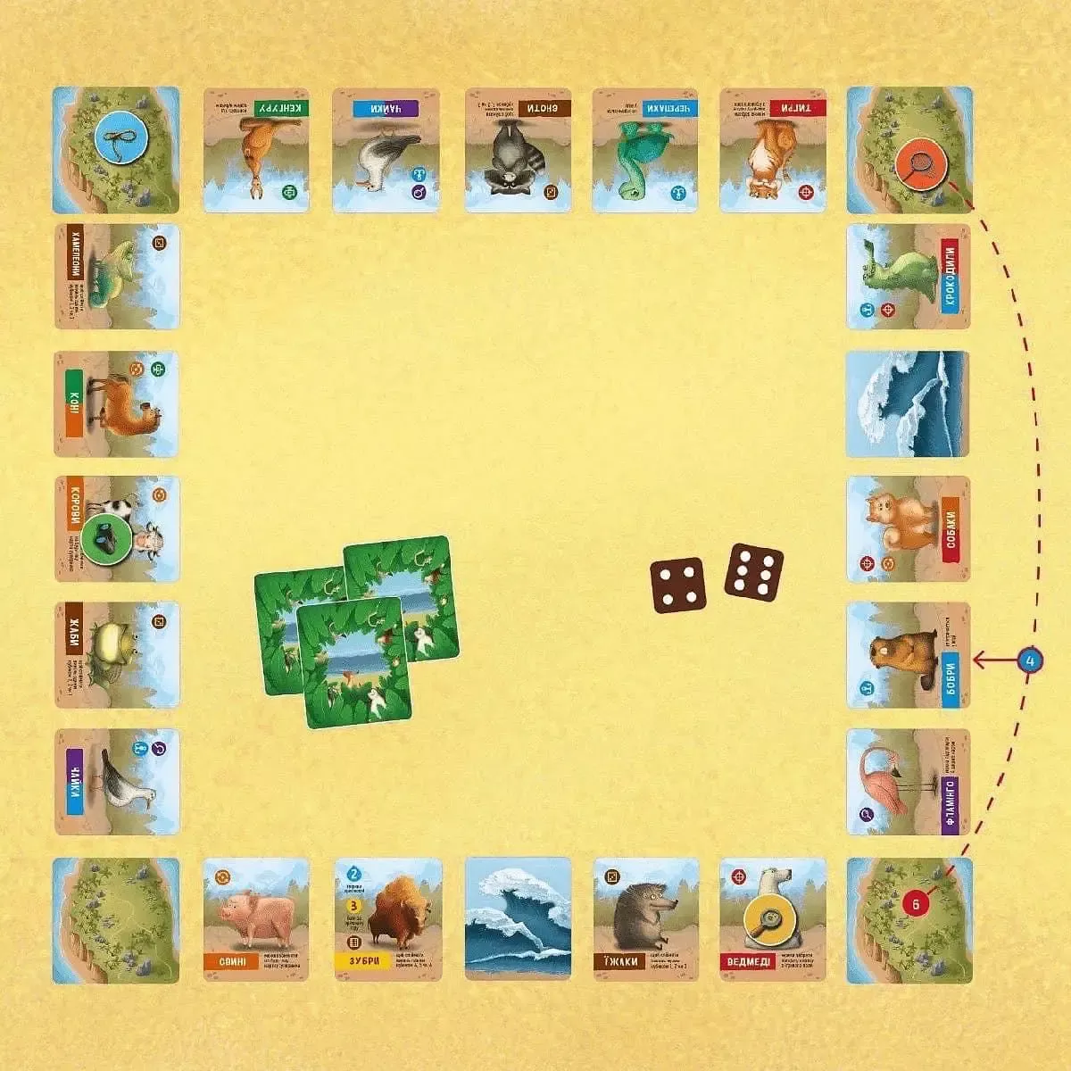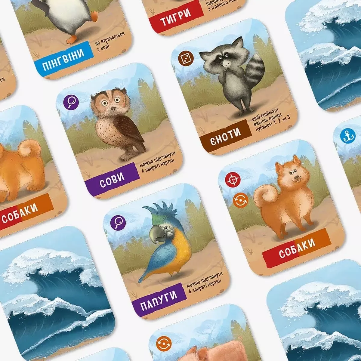 За біблійською легендою, нащадок Адама Ной отримав від Бога завдання побудувати ковчег та зібрати на ньому «кожної тварини по парі». Це дозволило пережити Великий потоп та відродити життя на планеті після нього. У настільній грі Справа Ноя 2-4 гравці зможуть перевтілитись у Ноя та врятувати від руйнівної повені якомога більше тваринок. Врятуйте тварин від повені У стартовій колоді знаходиться 64 картки тварин (32 пари). На початку партії на ігрове поле викладається по чотири картки тварин на кожного гравця та по картці землі. Учасники по черзі кидають два кубики, роблять ходи на число клітинок, що випало, та забирають тваринок до своєї руки. Потрібно зібрати та врятувати якомога більше пар тварин – за кожні дві однакові картки тваринок гравець отримує по одному балу. Також можна отримати додаткові очки за збирання сетів тварин з однієї категорії. Але не все так просто, адже в колоді є шість карток повені, при потраплянні на які гравець змушений кинути один кубик ще раз та повернути до колоди кількість тваринок з руки відповідно до числа на кубику. Кожна тварина має особливі властивості – деякі з них дають змогу походити ще один раз, а щоб піймати інших, потрібно буде викинути певне число на кубику. Використовуйте можливості тварин У грі Справа Ноя представлено декілька категорій тварин. Птахи, звірі, свійські, водоплавні тварини та інші – кожна картка дає гравцеві певні варіанти розвитку подій, якими він може скористатись задля перемоги. У деяких тваринок є відразу дві категорії. Гра завершується тоді, коли будуть розіграні усі картки з колоди або на одній зі сторін поля не залишиться карток. Тоді гравці підраховують отримані пари тварин та визначають переможця. Прості механіки дозволяють грати у настільну гру Справа Ноя усією сім’єю, рекомендований вік для участі – від 6 років. Ной зміг на своєму ковчегові врятувати власну сім’ю та велику кількість тварин. Чи зможете ви повторити його досягнення, або ж руйнівна повінь не залишить звірям шансів на виживання? Настав час перевірити власні сили та дати відповідь на це питання.