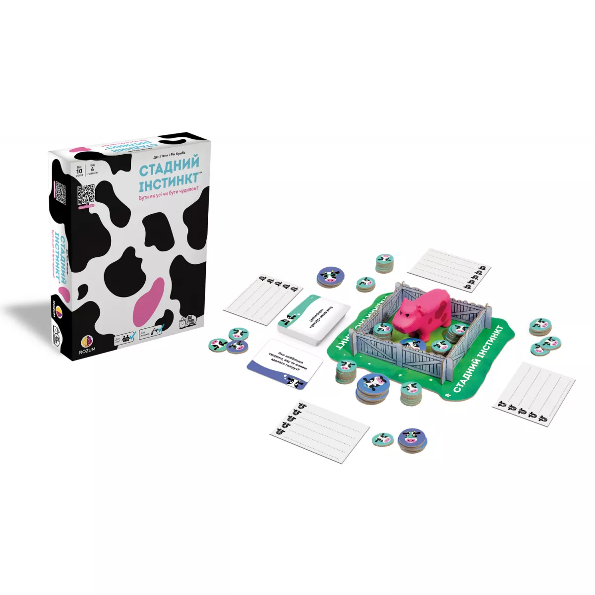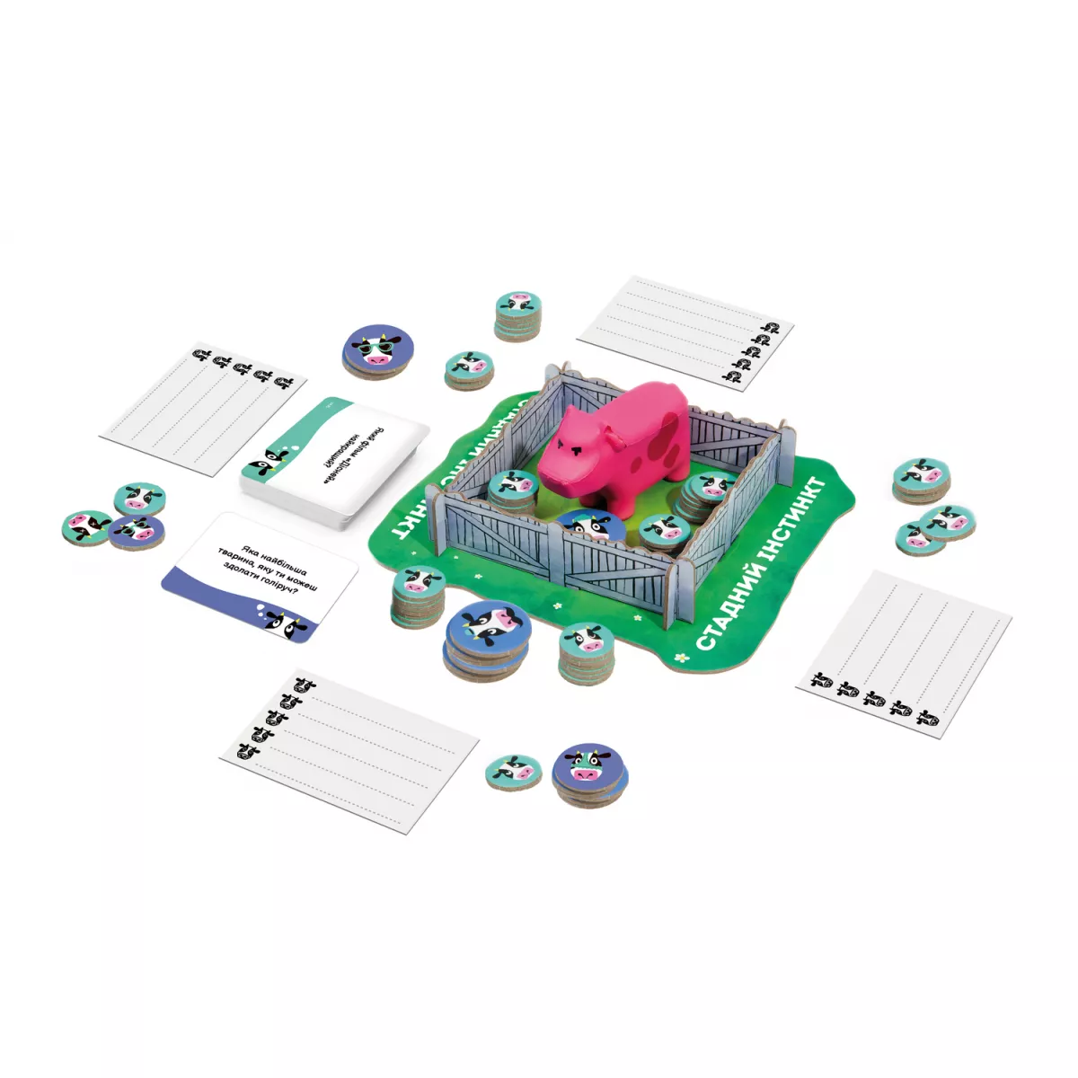 У коробці 1 фігурка рожевої корови, 1 загорожа, 62 жетони корівок, 200 карт запитань, 1 записник для відповідей, Правила гри