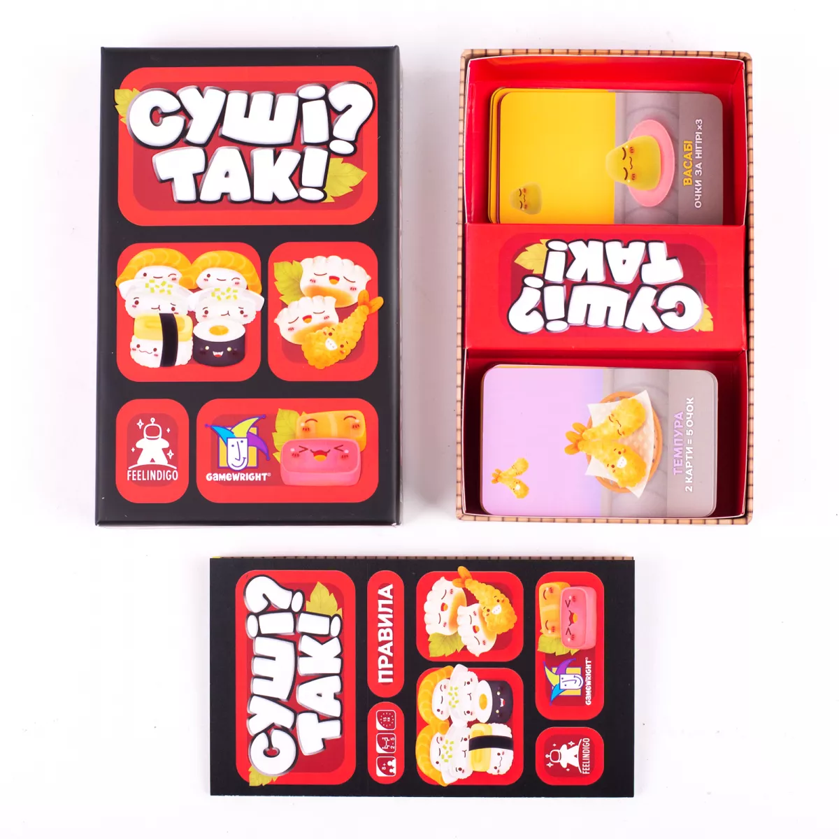 Зверніть увагу: промокартка «Соєвий соус» знаходиться ОКРЕМО від коробки, разом з картками. Тож будьте уважні, розпаковуючи ваші відправлення! Японська та й узагалі східна азіатська кухня з кожним роком набирає все більше популярності. Важко знайти людину, яка ніколи в житті не пробував хоча би суші. А скільки існує різноманітних супів, локшини і всілякої іншої смакоти! Ми про все це тільки почали згадувати, а слинка вже потекла! А ви як, готові стати найкращим шефом у світі японської кулінарії в настільній грі Суші? Так! Тоді запасайтеся найкращими стравами та переженіть усіх інших кухарів у гармонійності ваших страв. З васабі та соєвим соусом усе смачніше Суші? Так! – це швидка карткова гра для всієї сім’ї, у якій потрібно заробити якомога більше переможних балів. Даються вони за всі страви, що будуть вами розіграні протягом трьох раундів. У свій хід ви обираєте з отриманих карток одну та розігруєте її долілиць перед собою. Коли всі гравці готові, можна їх перевертати. Тепер ви знаєте, що планує зробити кожен із учасників! Але гра триває далі: передайте картки наступній людині, після чого це все триває по колу. Як тільки ви розіграли останню картку, раунд закінчується, а отже можна переходити до підрахунку переможних балів. Саме тут і відбуваються найбільші веселощі, адже кожна картка у грі дає особливі очки: Футомакі принесуть 6 очків тому, у кого їх найбільше, а також 3 власнику другого місця. Темпура працює тільки в парі – 2 карти дають 5 очок. Але ж ніхто не забороняє зібрати декілька наборів. Із Сашімі ще складніше – їх потрібно мати аж 3 для 10 очок. Пельмені Гьодза просто дають очки в залежності від їх кількості перед вами – чи більше, тим краще. Різні види Нігірі дають 1, 2 або 3 очка, які можна потроїти, якщо покласти на раніше зіграну карту Васабі. Пудинг працюватиме тільки наприкінці гри. Він принесе 6 очок тому, у кого їх найбільше, але й забере стільки ж у того, хто про десерти думав в останню чергу. Ми ще не сказали про один тип карт – це Палички. Куди ж без них у японській кухні, правда? Вони самі по собі нічого не приносять. Якщо ж ви їх розіграли, то в один із наступних ходів матимете можливість обміняти їх одразу на дві картки з отриманих. Наприкінці раунду бали за всі карти підраховуються, після чого все, окрім пудингів, скидається. Наприкінці 3 раунду визначте, хто ж набрав сумарно найбільше очок – це й буде переможець! Хочете трішки Суші? Настільна гра Суші? Так! проходить надзвичайно швидко. Ви не встигаєте й помітити, як партія вже закінчилася! А ви тільки ввійшли в кураж. Що ж, доведеться грати ще одну партію, аби знову заробити якомога більше переможних балів. Маємо щось смачненьке і для прихильників більш традиційної кухні. У настільній грі Салат удачі ви зможете зготувати із овочів стільки усіляких нарізок, що серед цих переможних балів можна буде загубитися. Просто тут вони даються буквально за все! Нагороди ★ 2015 UK Games Expo Awards Best General Card Game Winner ★ 2015 Origins Awards Best Card Game Nominee ★ 2015 Nederlandse Spellenprijs Best Family Game Nominee ★ 2015 Boardgames Australia Awards Best Australian Game Winner ★ 2014/Fall Parents’ Choice Recommended ★ 2014 Boardgames Australia Awards Best Australian Game Nominee ★ 2013 Golden Geek Best Family Board Game Nominee ★ 2013 Golden Geek Best Card Game Nominee ★ 2013 Board Game Quest Awards Best Card Game Nominee