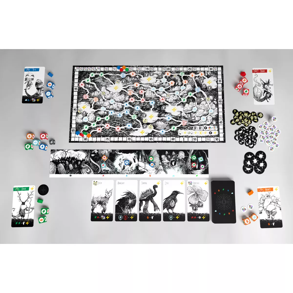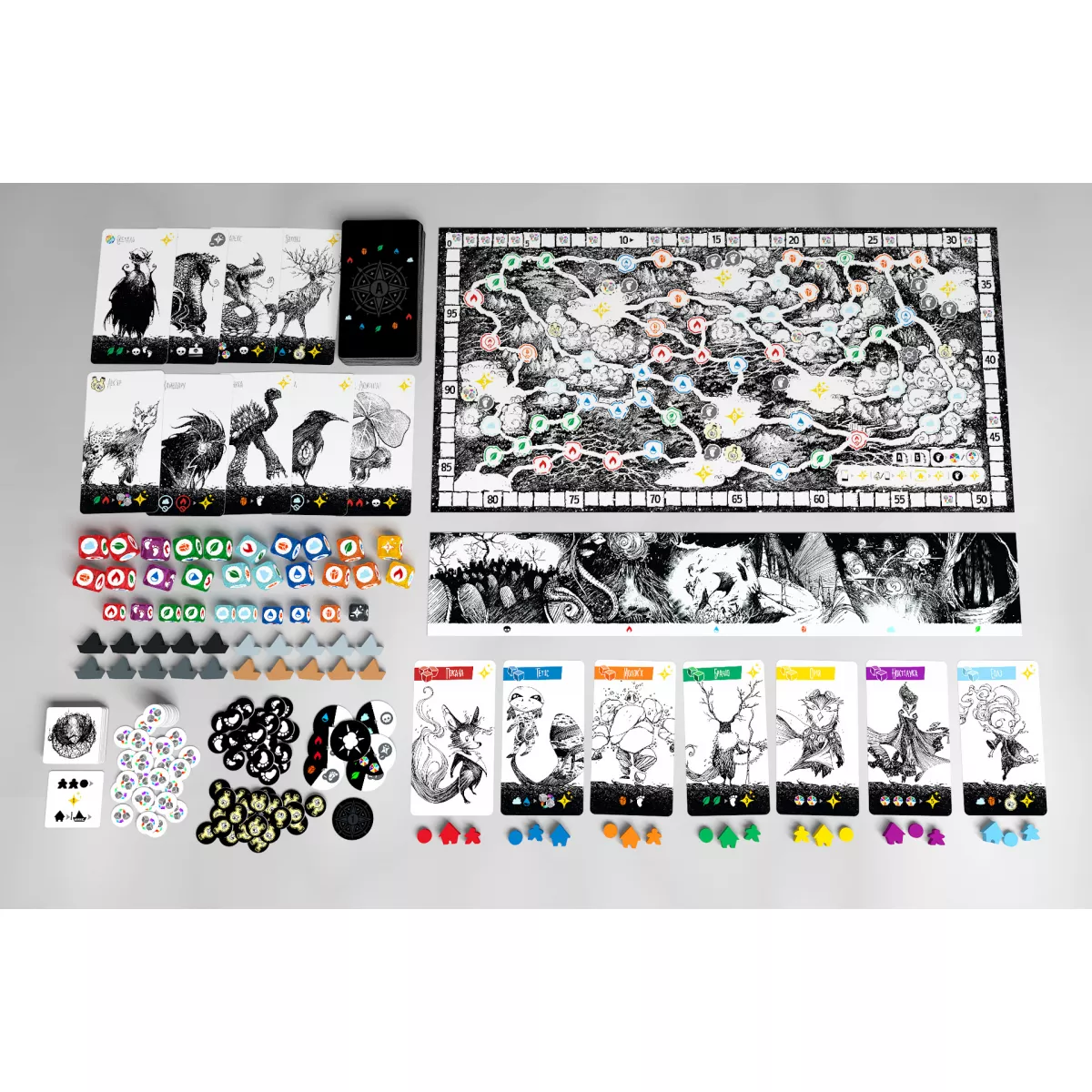 У коробці ігрове поле, планшет, 30 кубиків, 53 картки, 96 картонних жетонів, 41 дерев’яна фішка, 8 плиток для соло-гри