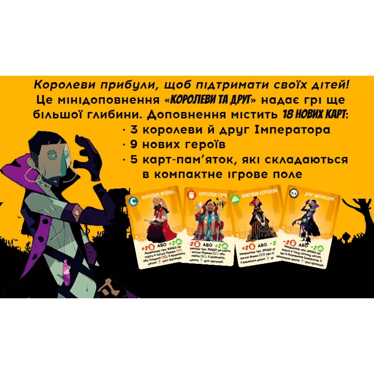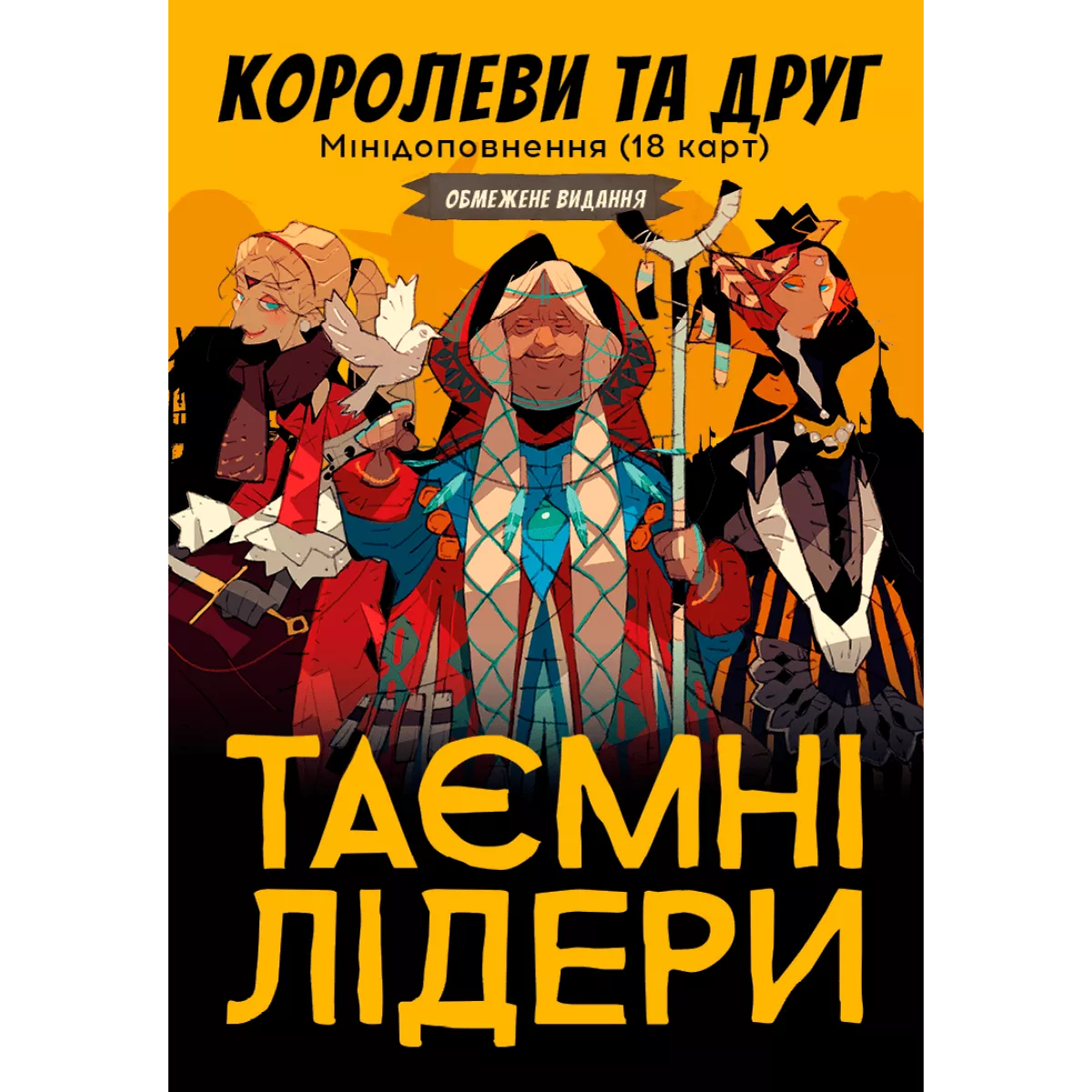 Увага! Це доповнення. Для гри вам знадобиться базова версія Таємні лідери.   Конфлікт між гірськими племенами, Імперцями, нежиттю та народом води й досі триває, адже кожен народ бажає отримати владу над Імперією. Та разом із доповненням Таємні лідери. Королеви та друг до кожної з фракцій надійшла підмога – три величні королеви та старий друг Імператора. Саме їм під силу змінити баланс у протистоянні народів! Також кажуть, що разом з ними прибули ще 9 героїв, з якими можна відкрити для себе нові стратегії та шляхи досягнення перемоги! Тож якщо вам здавалося, що настільній грі Таємні лідери не вистачає ще зовсім трішки різноманіття – доповнення Королеви та друг точно стане вам у нагоді!