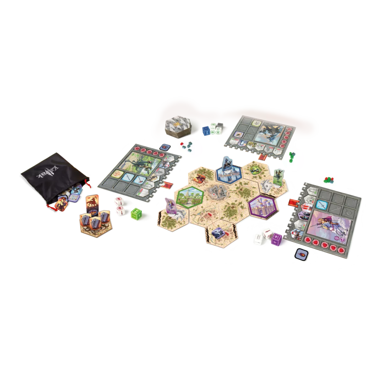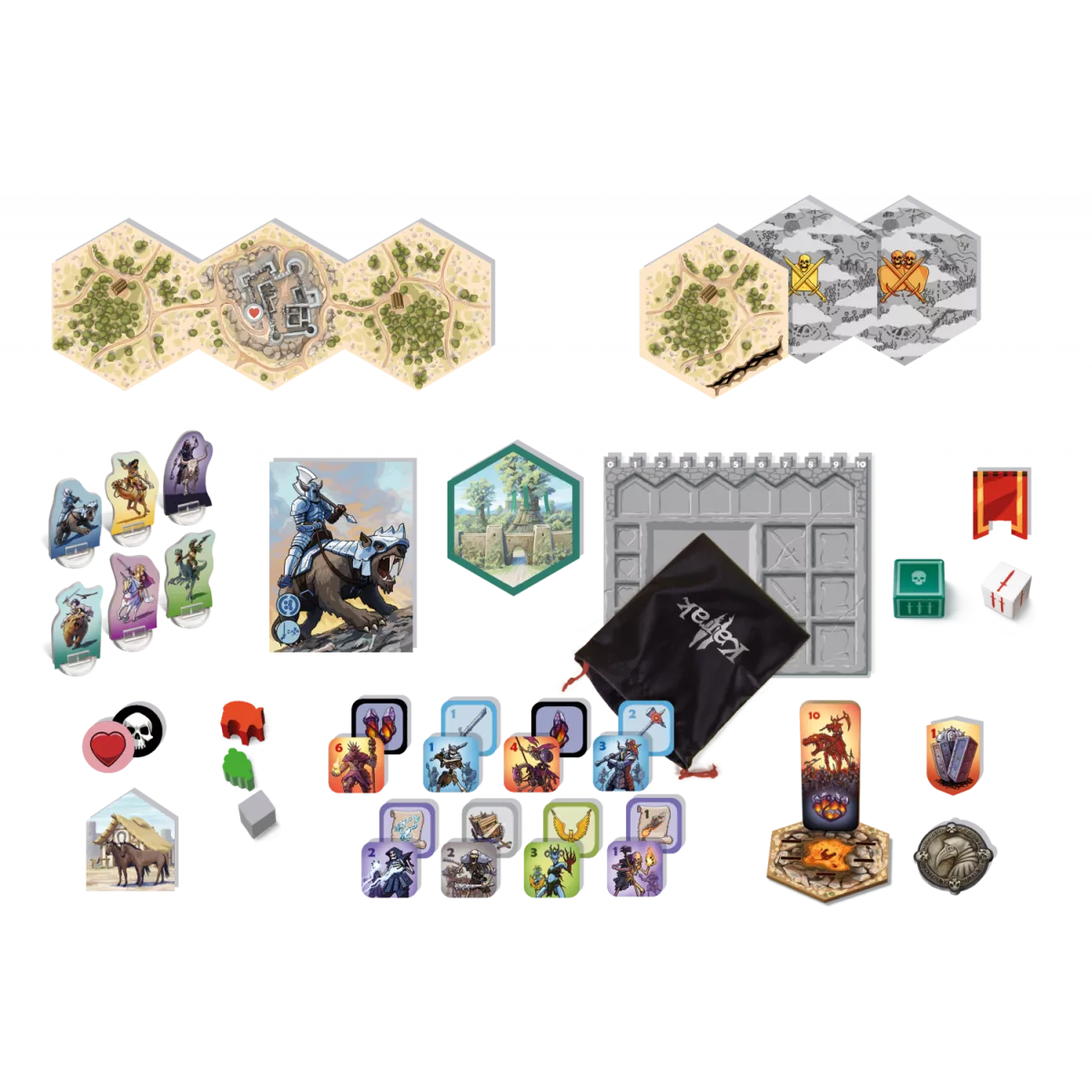 У коробці 1 початкова плитка, 28 плиток місцевості (18 плиток рівня I та 10 плиток рівня II), 6 картонних фігурок героїв, 6 пластикових підставок, 6 карт героїв, 6 жетонів міста, 5 планшетів інвентарю, 5 стягів слави, 6 великих кубиків, 35 маленьких кубиків для загонів армії героя, 30 жетонів здоров’я, 30 жетонів будівель, 40 фішок їжі, 40 фішок дерева, 40 фішок каменю, 1 мішечок для жетонів армії чудовиськ, 36 жетонів армії чудовиськ, 1 фігурка Темного Генерала з особливою підставкою, 5 жетонів преторіанців, 1 жетон чуми, Правила