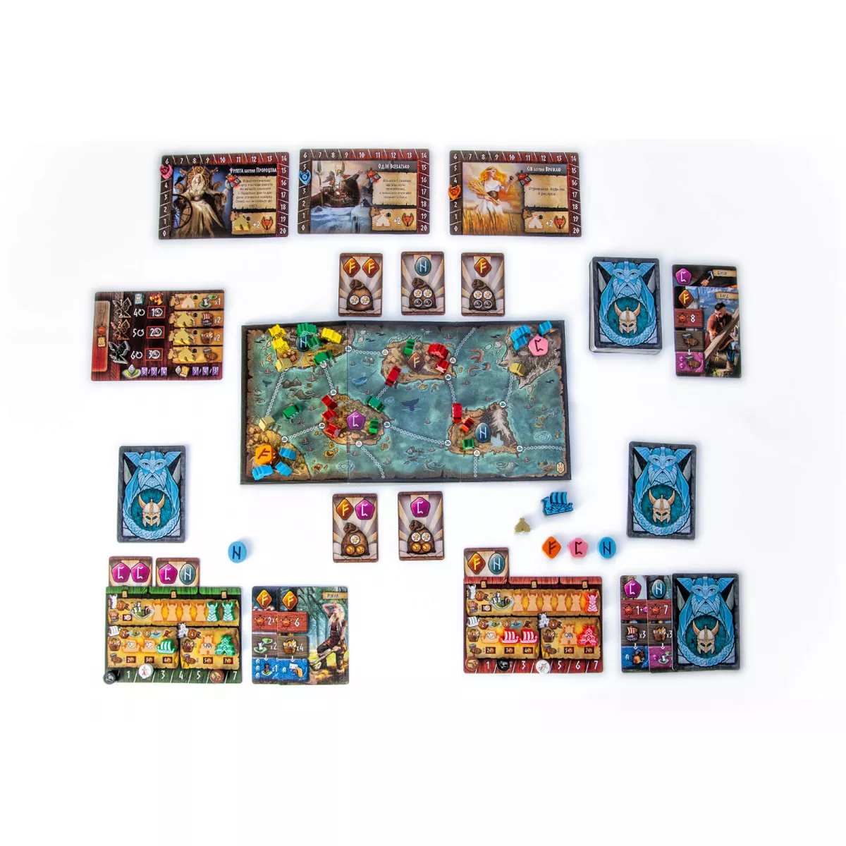 У коробці двостороннє ігрове поле, 4 планшети кланів, 48 карт вікінгів , 18 карт підтримки богів, 6 планшетів богів, двосторонній планшет епохи, 24 поселенці, 16 кораблів, 8 храмів, 13 селищ, 9 рун, 3 токени люті, 12 жетонів ресурсів, маркер ворона, маркер вождя, 4 жетони підрахунку очок