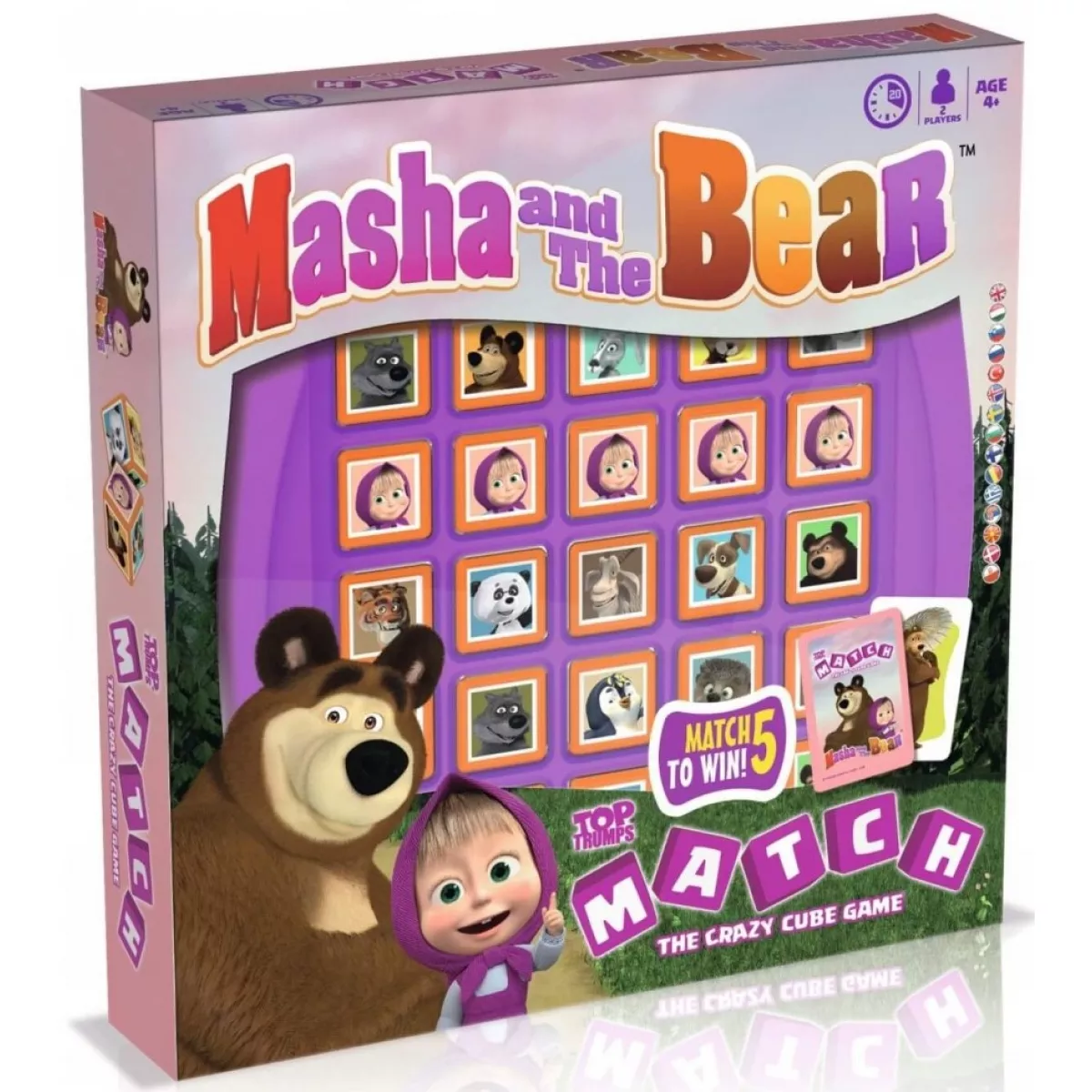 Мета гри Top Trumps Match Masha and the Bear полягає в тому, щоб зіставити 5 кубиків в ряд горизонтально, вертикально або діагонально. На вибір є 15 персонажів. Після того, як усі 25 кубиків були вставлені в ігрову сітку, і кожен гравець отримав 2 картки персонажів із верхніми козирями, закритими обличчям донизу, кожен гравець по черзі обмінюється одним кубиком, щоб отримати п’ять рядків із однаковими символами. Перший гравець, якому це вдається, «переміг». Переможений ще має шанс перетворити свою поразку на перемогу. Якщо одна з двох прихованих карт переможеного збігається з 5 картками гравця-переможця, він отримує серію і виграє.