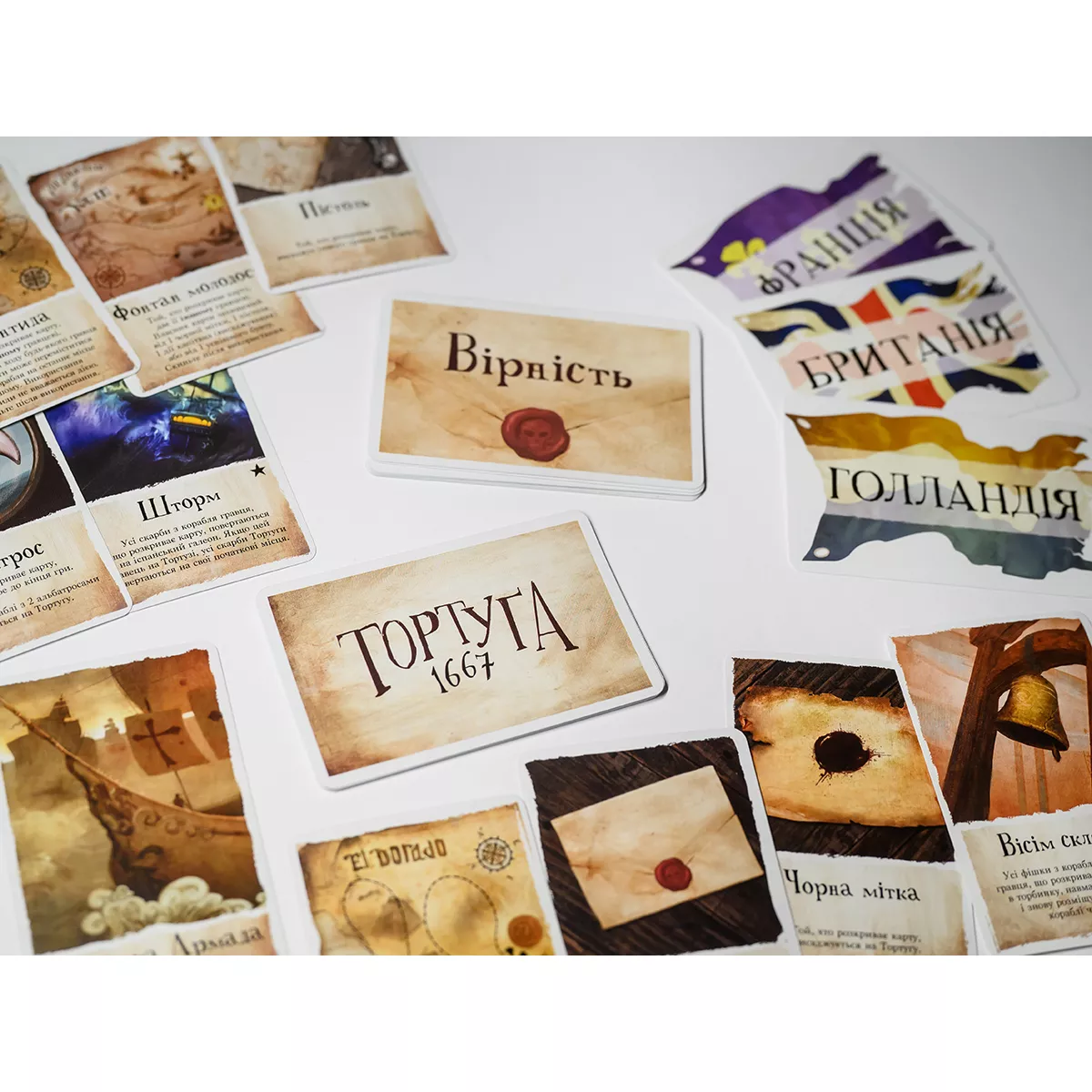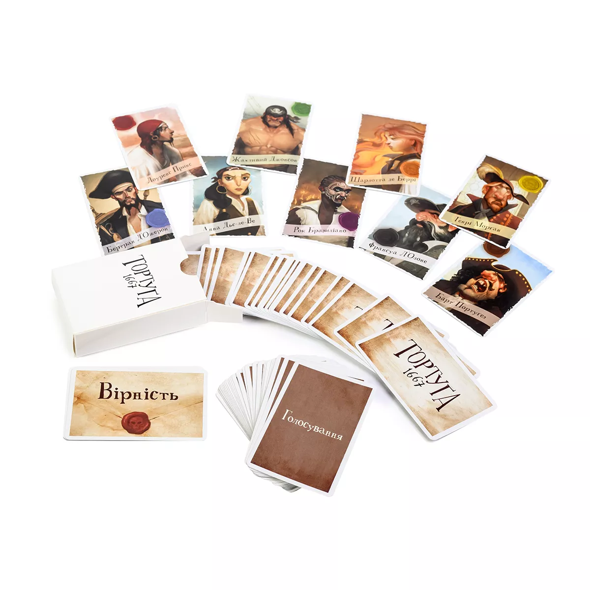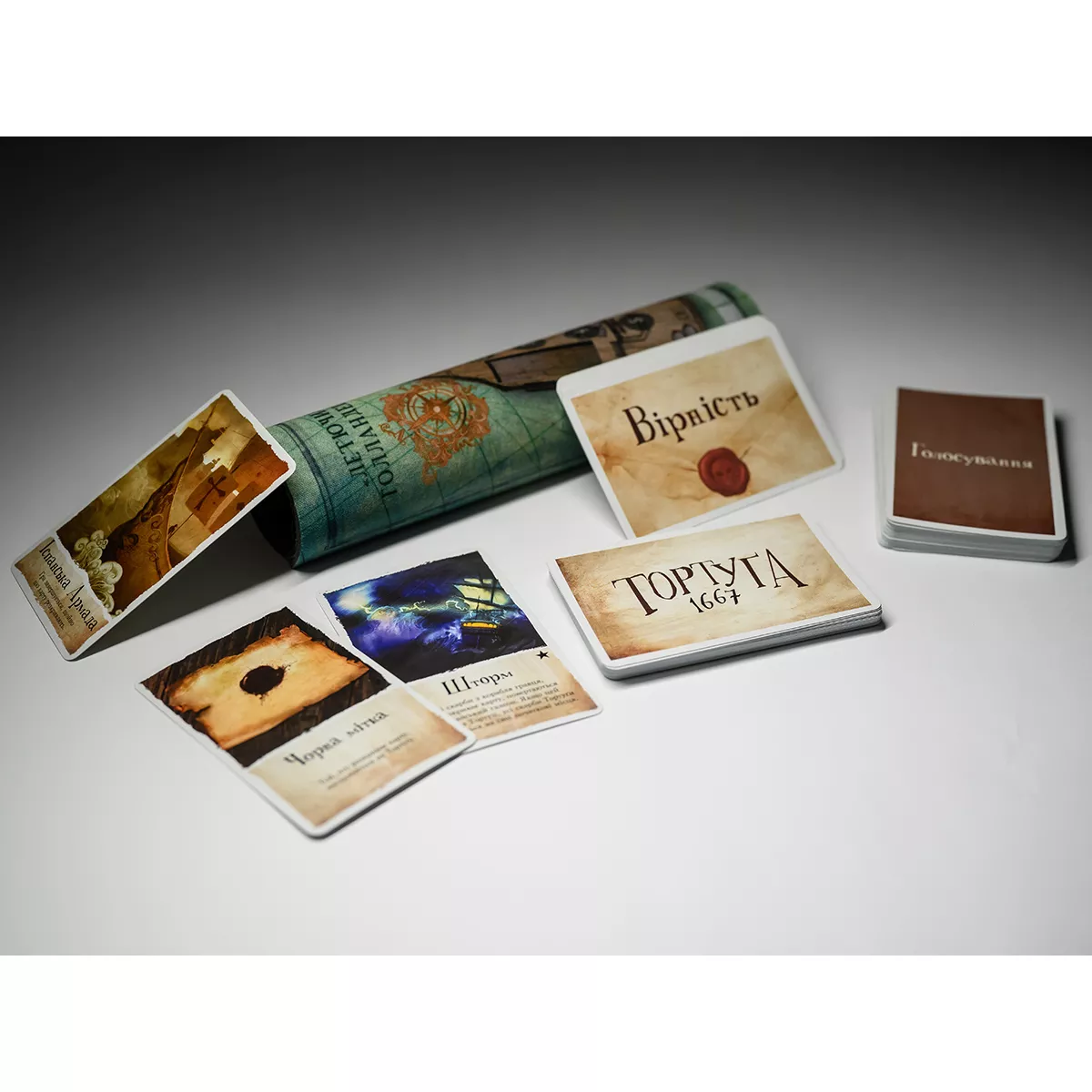 «Тортуґа 1667» — психологічна гра з прихованими ролями, в якій гравці у ролі піратів змагаються за скарби. Дві команди шляхом запальних сутичок, заколотів і бійок виборюють золото під свій прапор. Ви будете використовувати блеф і дедукцію, аби вижити у світі піратських інтриг.