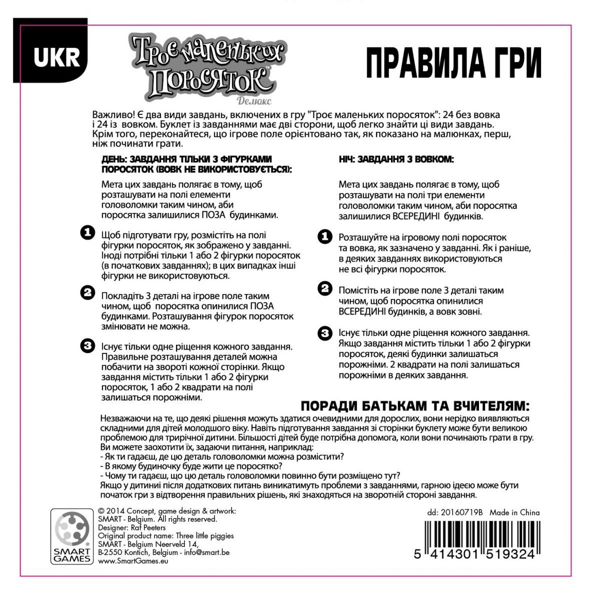| У коробці | ігрове поле, 3 деталі головоломки, 3 поросят, 1 вовк, буклет з 48 завданнями, книга-казка з ілюстраціями |