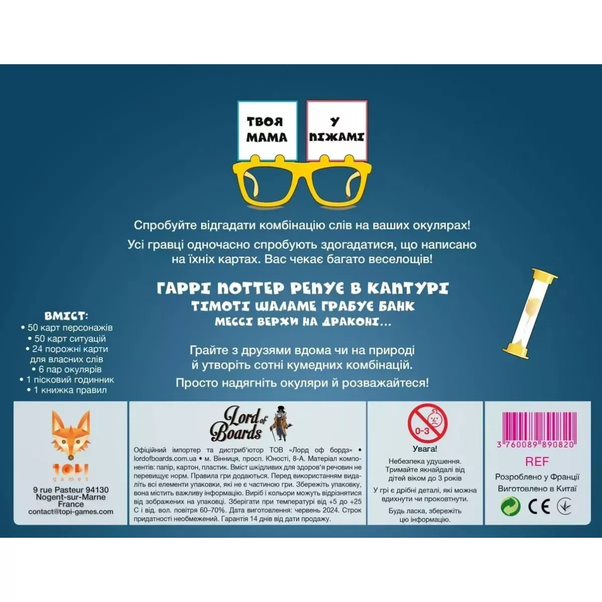 «Твоя мама у піжамі» — це динамічна та надзвичайно кумедна карткова гра для компанії, яка перетворює будь-яке зібрання на справжнє комедійне шоу. Правила прості, інтуїтивно зрозумілі і освоюються за лічені хвилини, що робить її ідеальною для новачків у світі настільних ігор та тих, хто цінує швидкі партії. Кожен раунд один з гравців стає суддею. Інші учасники отримують на руки карти персонажів та картки ситуацій. Завдання гравців — об'єднати одну карту персонажа (наприклад, «Твоя мама» або «Мій начальник») з однією картою ситуації (наприклад, «...у піжамі» або «...танцює стриптиз на столі»), щоб створити максимально смішну, абсурдну або просто геніальну фразу. І все це потрібно зробити всього за 30 секунд, поки сиплеться пісок у годиннику! Суддя обирає найсмішнішу комбінацію, і гравець, який її створив, отримує переможний бал. Переможцем стає той, хто першим набере певну кількість балів. Головне тут – не перемога, а процес створення безглуздих, але дуже веселих поєднань, які викликають неконтрольований сміх.