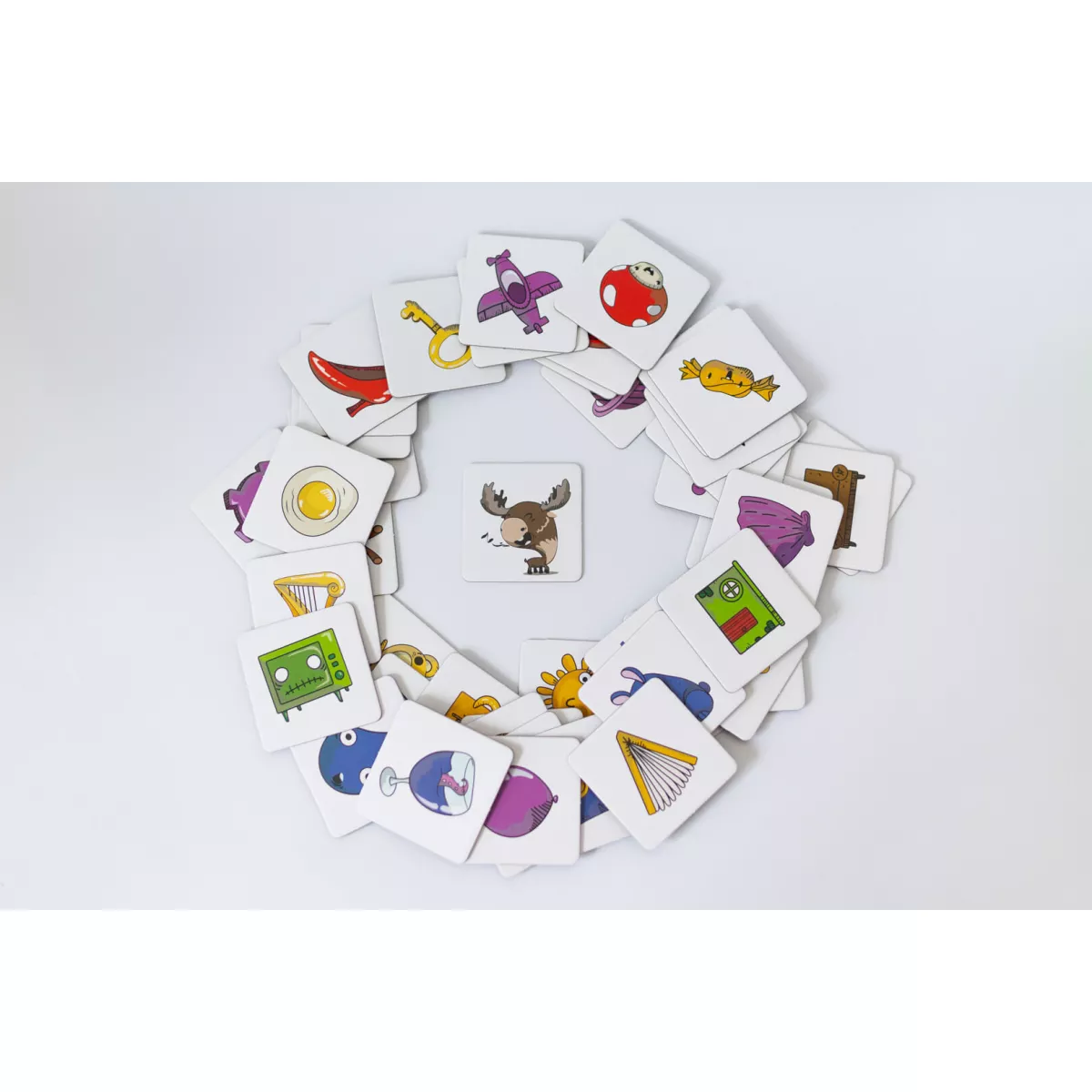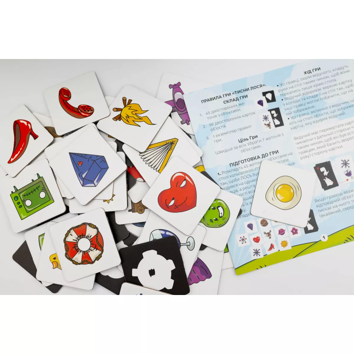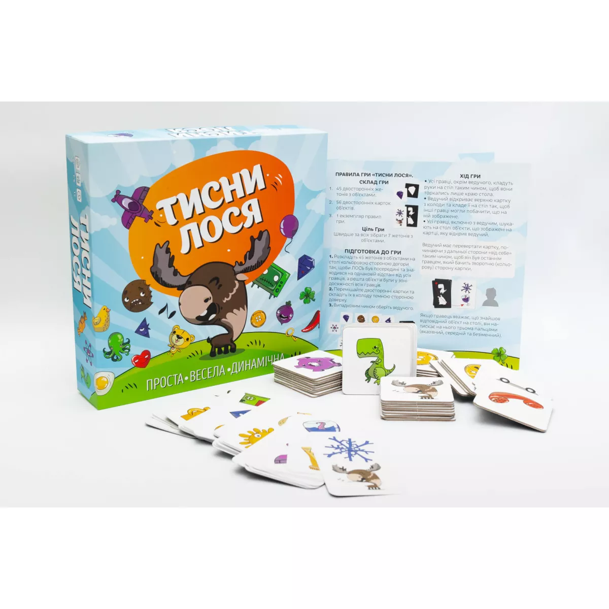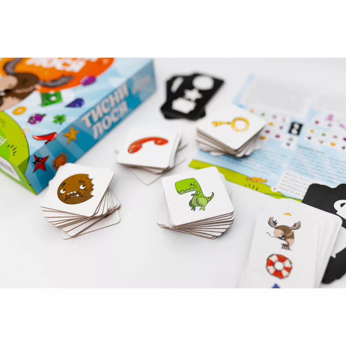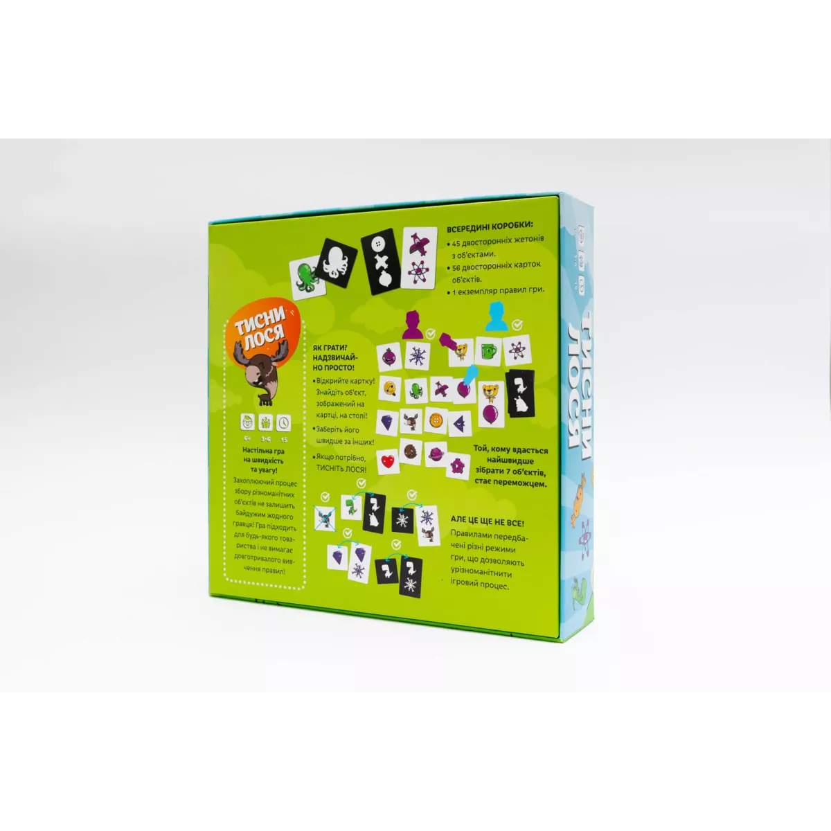Всі натренували уважність та поїли моркви для кращого зору? Бо тепер баритися вже нема часу, треба бути спритним та уважним, аби хутко шукати потрібні предмети, або навіть знайти цілого лося! Гра Тисни лося! це швидка та весела настілочка на перевірку уважності, яка чудово підійде компанії від 3 до 6 гравців, а головне, що цікаво буде навіть наймолодшим настільщикам, які можуть не тільки пограти, а й розвивати власну увагу та спритність! Я точно клав ключ сюди, куди він подівся! Під час підготовки до гри на стіл викладається сила-силенна карток із найрізноманітнішими малюнками. Після цього ведучий відкриває картку, на якій зображено кілька предметів. Хто перший знайде хоч один з них та натисне на нього трьома пальцями – той отримує переможне очко! Назбирає аж сім таких очок – значить можна святкувати перемогу! Стривайте, а до чого тут взагалі Лось? А Лось – це ключовий елемент пригоди, адже якщо на карті з завданням буде ця тварина, то гравець, який перший його «тицьне», отримує переможне очко, як завжди, проте всі інші втратять ціле очко, тому тепер ставки зростають! Тож якщо ви шукаєте настілочку, в якій можна тренувати пам’ять, увагу та реакцію дитини під час веселих партій, то гра Тисни лося! абсолютно точно стане вам у нагоді! А вивчати кольори та тренувати уважність ви разом з вашою дитиною також можете у серії сімейних ігор Привид Розумака.