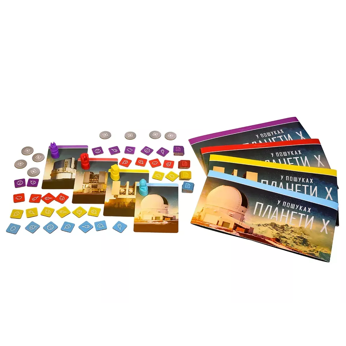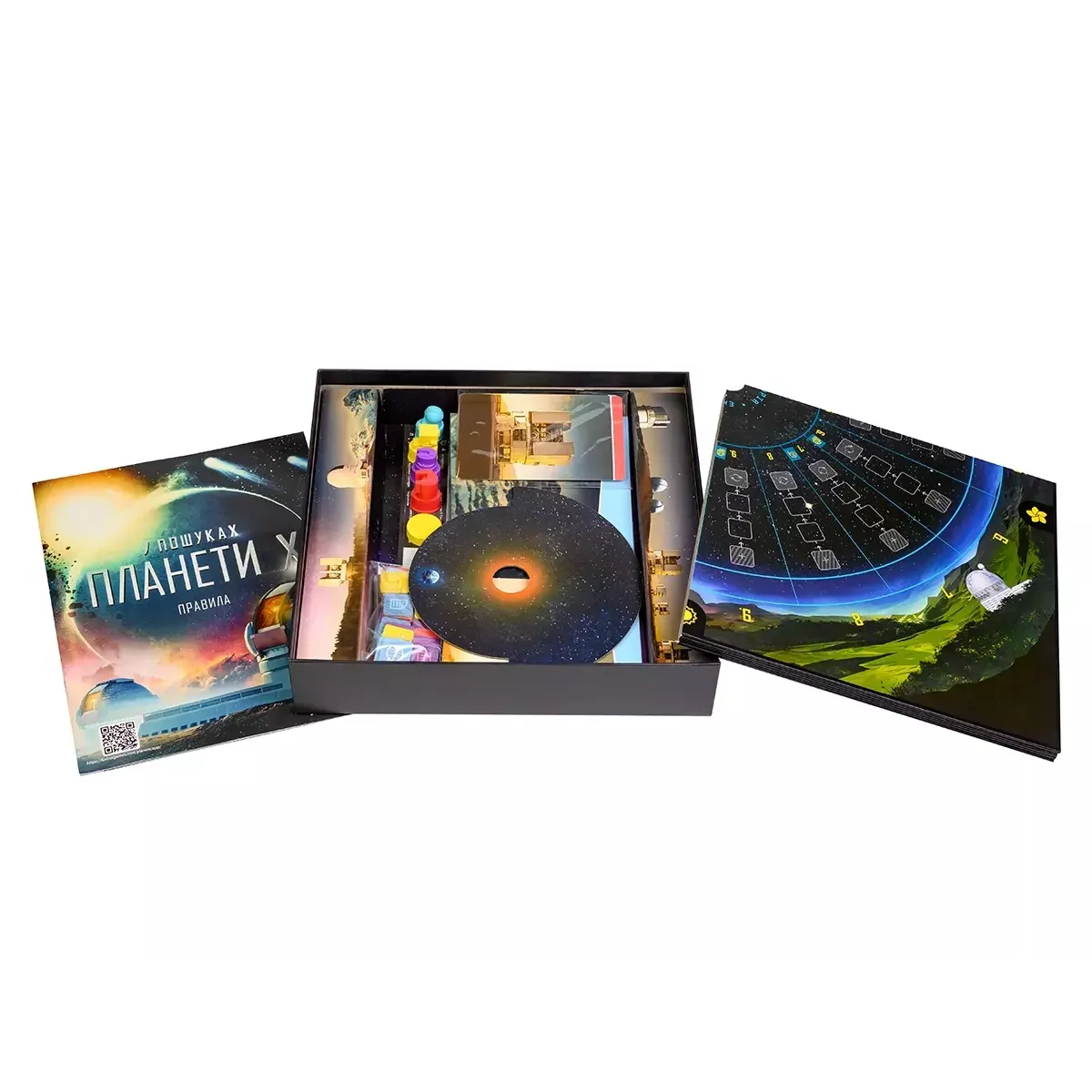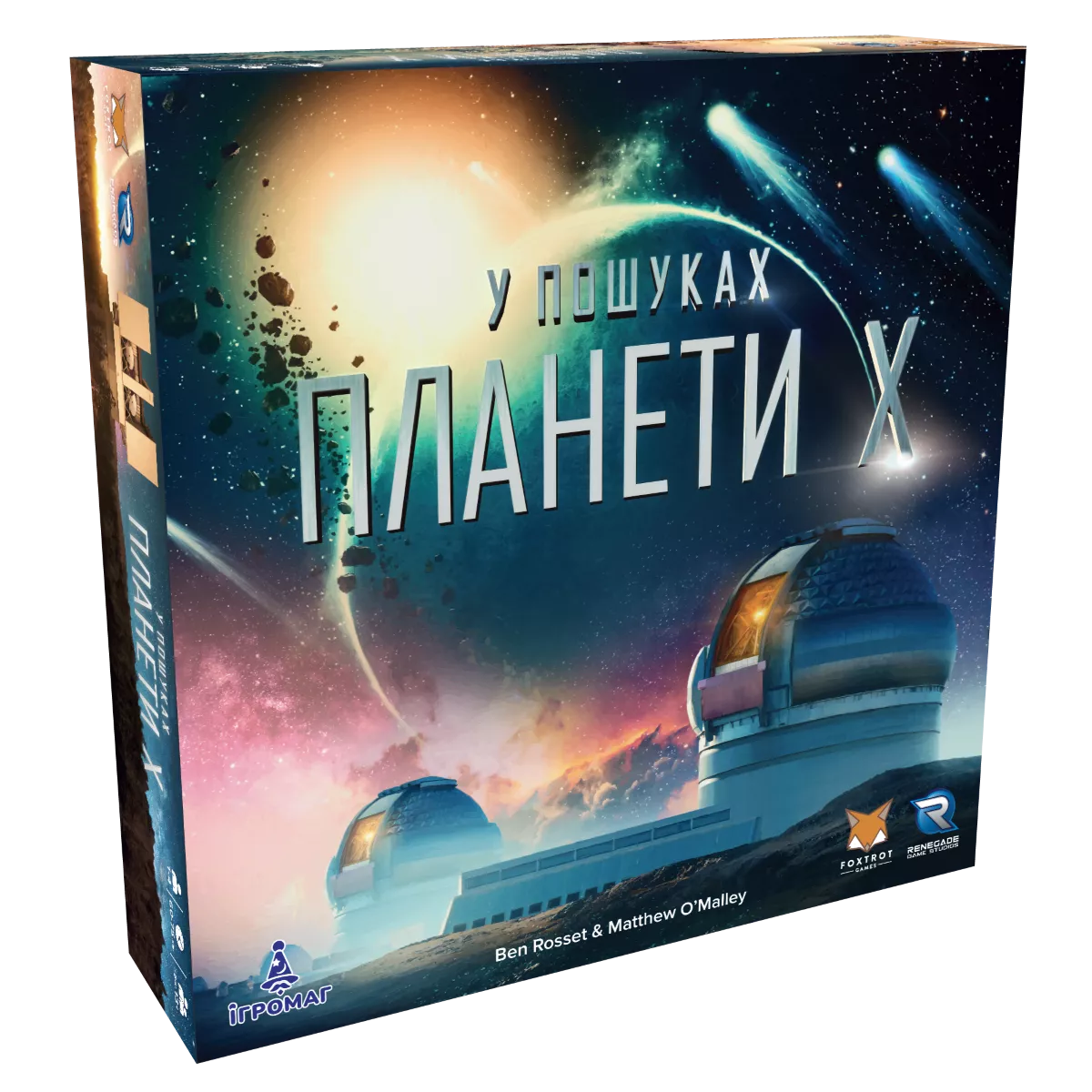 The Search for Planet X – це захоплива настільна гра, у якій гравці виступають у ролі астрономів, що ведуть наукові дослідження та прагнуть першими знайти загадкову планету. Для перемоги потрібно заробити найбільшу кількість очок, будуючи правильні теорії та розкриваючи місцезнаходження небесних об’єктів. Кожна партія унікальна, адже розташування Планети Х випадковим чином визначається спеціальним мобільним додатком.