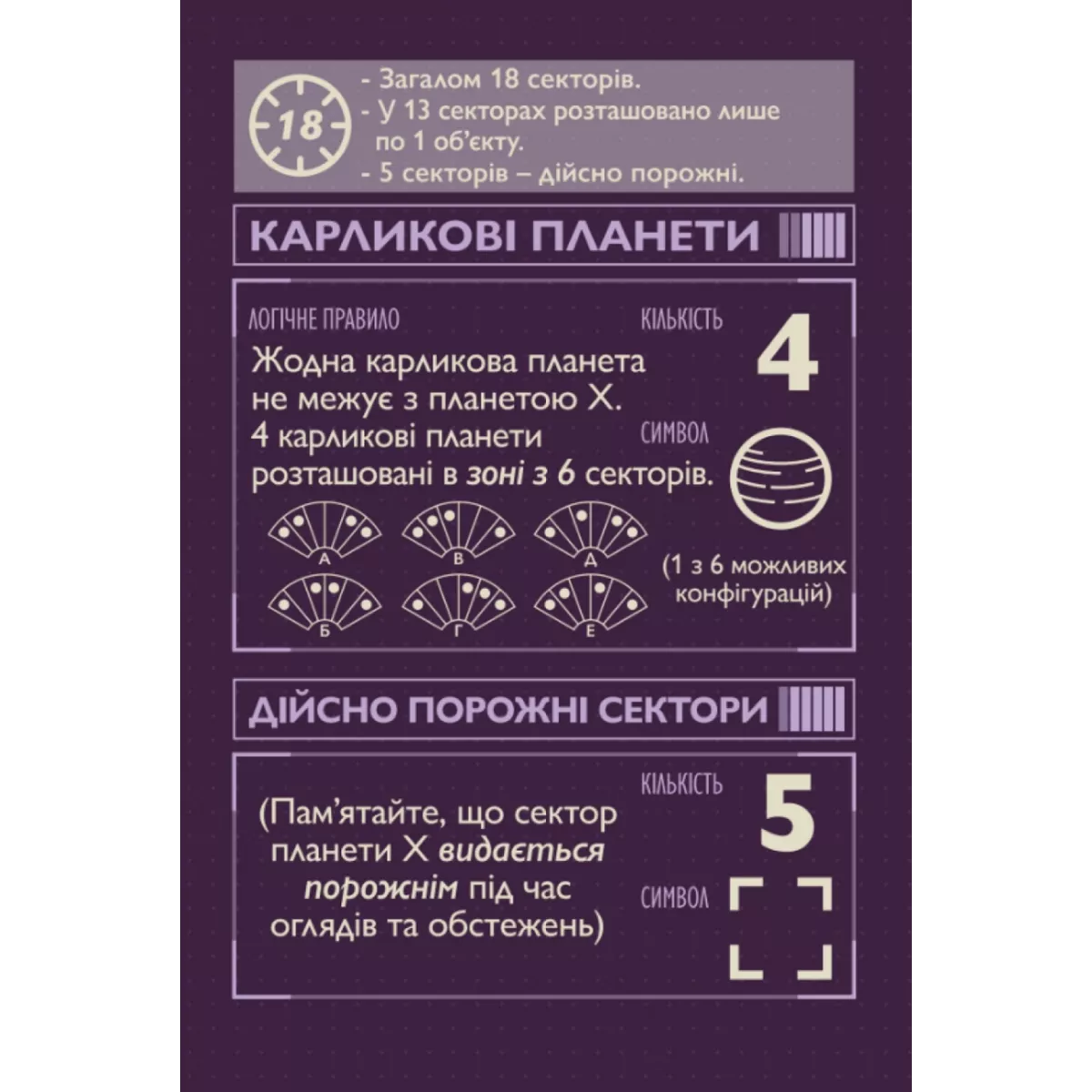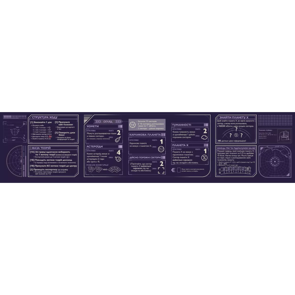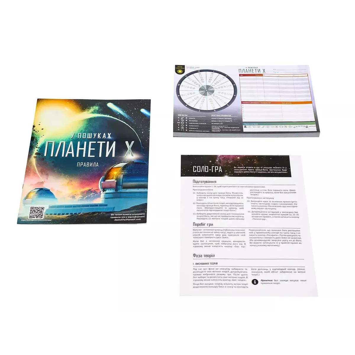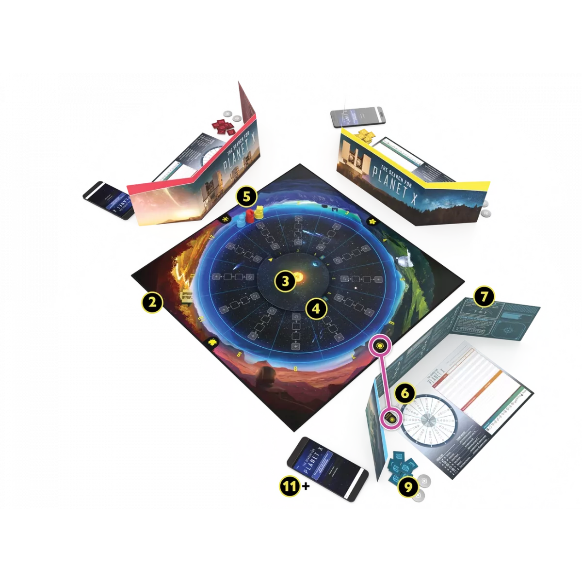 The Search for Planet X – це захоплива настільна гра, у якій гравці виступають у ролі астрономів, що ведуть наукові дослідження та прагнуть першими знайти загадкову планету. Для перемоги потрібно заробити найбільшу кількість очок, будуючи правильні теорії та розкриваючи місцезнаходження небесних об’єктів. Кожна партія унікальна, адже розташування Планети Х випадковим чином визначається спеціальним мобільним додатком.