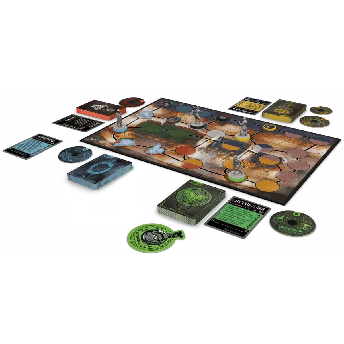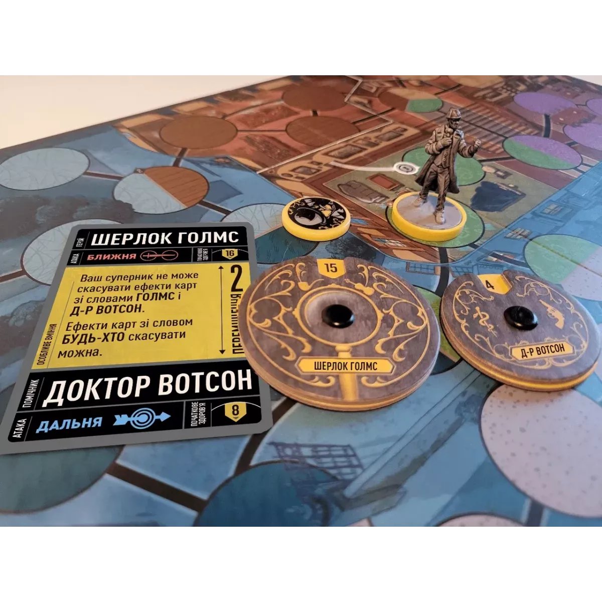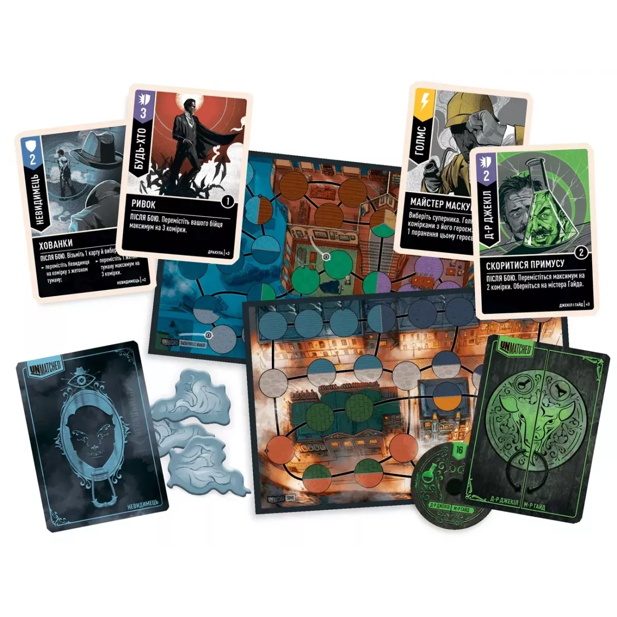 Ігрове поле гри "Unmatched: Місто туманів" двостороннє: одна сторона зображує туманний Лондон, інша – болота Баскервілей. Комплект включає фігурки персонажів, фішки та колоди карт для кожного героя.