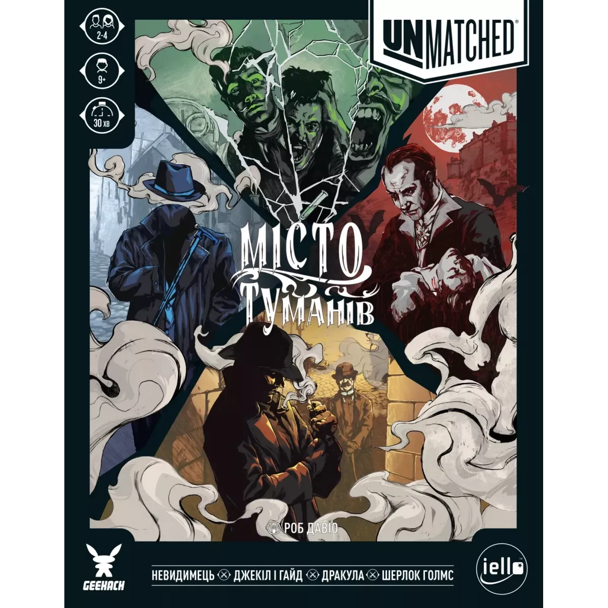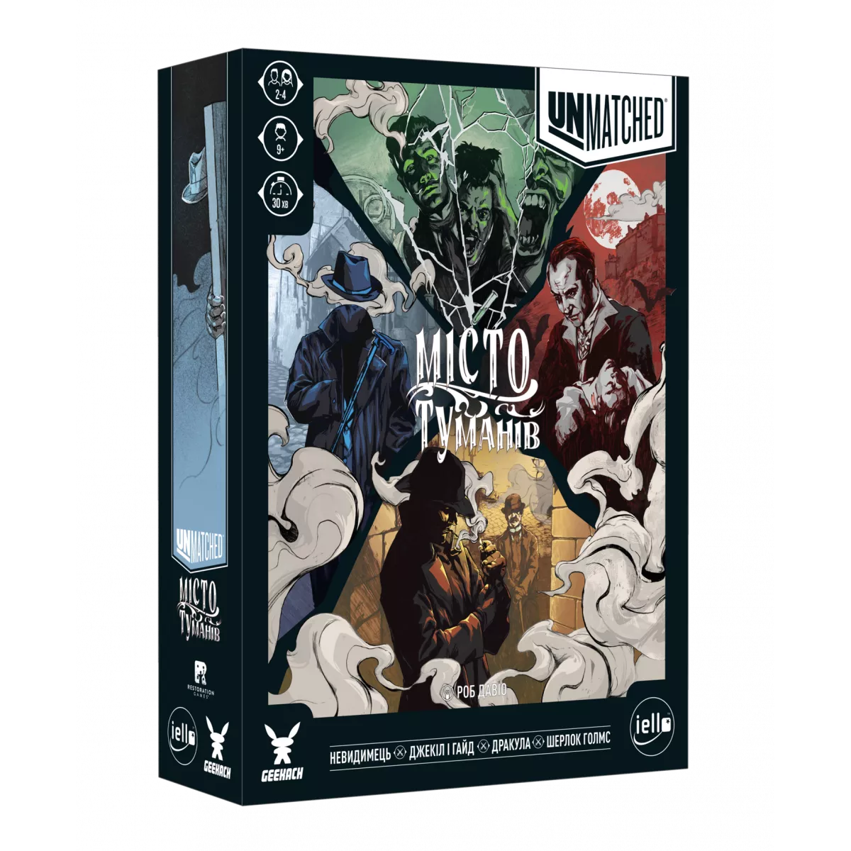 "Unmatched: Місто туманів / Cobble & Fog" — це настільна гра з унікальним кросовером, з унікальним набором персонажів з різних всесвітів. Дія гри розгортається в атмосферному Лондоні, де вулиці вкриті бруківкою, а повітря наповнене смогом.