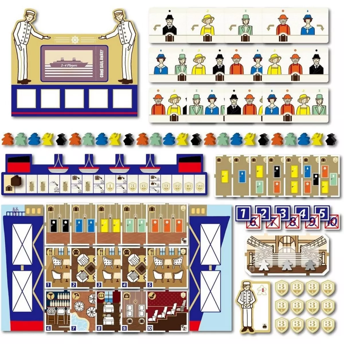 У коробці 125 дерев'яних фігурок пасажирів, 4 дерев'яні валізи, 1 спільний планшет гравців, 8 плиток бортів, 4 багажні стрічки, 84 картонні плитки приміщень, 4 плитки незадоволених пасажирів, 12 жетонів додаткових очок, 10 жетонів номерів закладів, 60 карт пасажирів, 1 пластиковий контейнер-пристань, 1 записник для підрахунку очок, правила гри