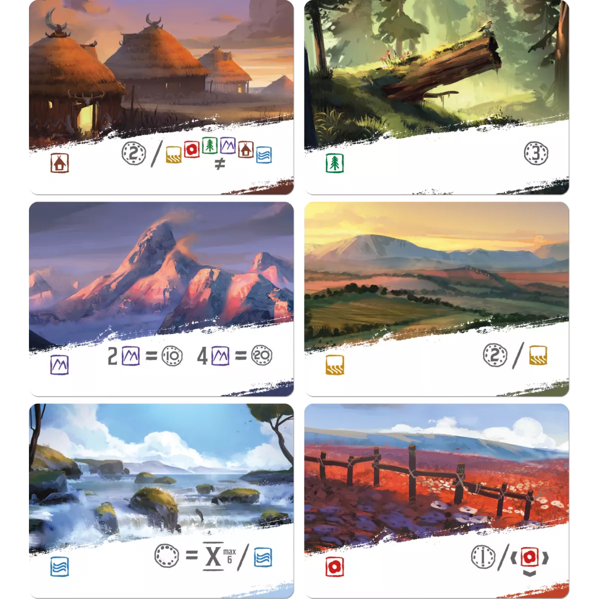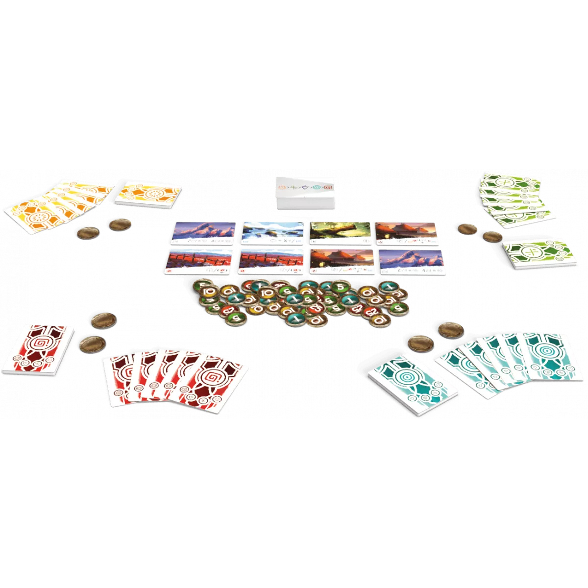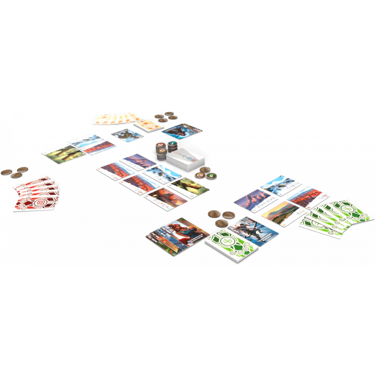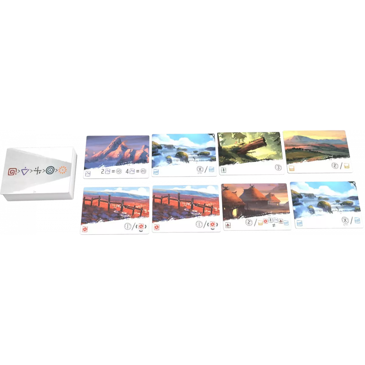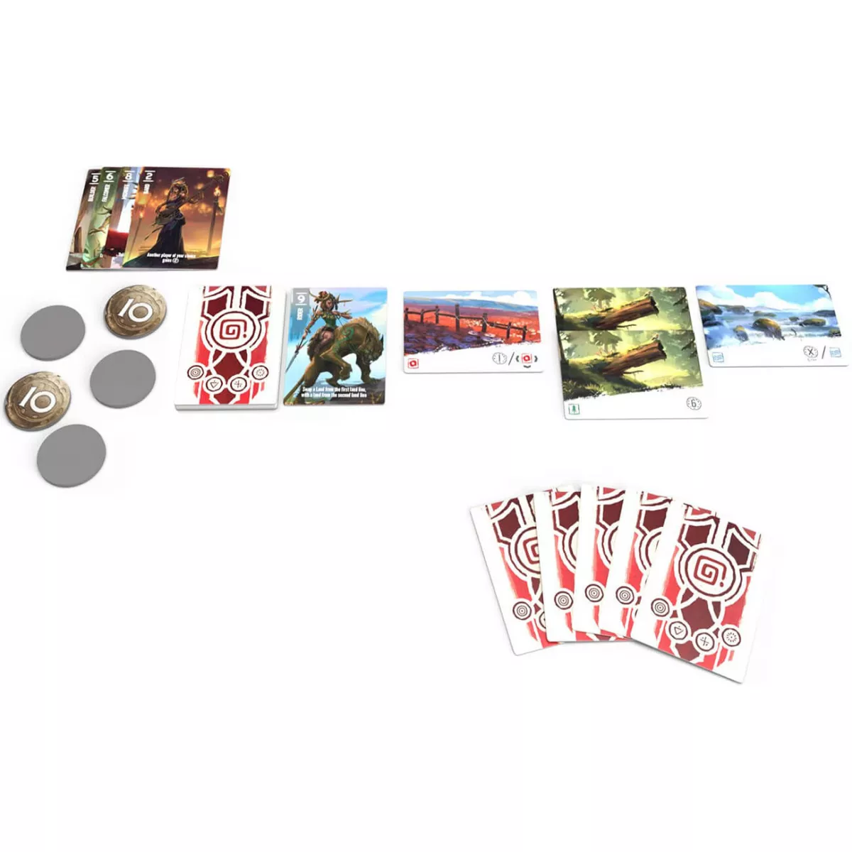 У коробці 51 картка земель, 5 карток-підказок, 60 карток персонажів (5 x 12), 75 жетонів (значенням 1, 5, 10 і 25)