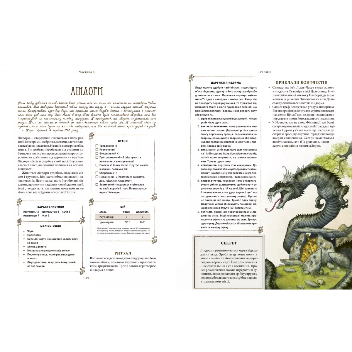 «Vaesen. Таємничі істоти півночі» – це популярна рольова гра в жанрі містики, готики, фольклору й атмосферних жахів. Вона познайомить вас із моторошним нордичним фольклором і старими скандинавськими мітами й легендами. Основні ігрові механіки використовують нагородоносну систему «Year Zero» – цей адаптований варіант ідеально пасує до атмосферної складової ігроладу.