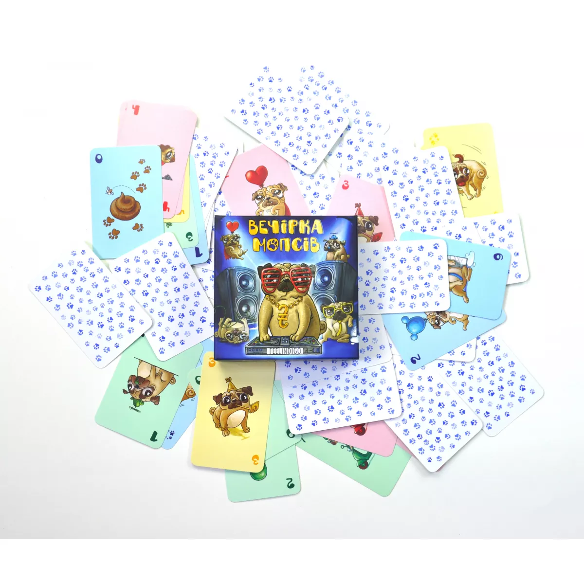 Згадайте себе, коли ви збираєтесь на якусь вечірку. Напевне, тоді ви витягуєте з шафи свій улюблений одяг, шукаєте підхожі до нього аксесуари, ретельно підбираєте всі кольори та подібне. Можливо, це все відбувається по декілька разів, поки все ж знайдеться ідеальний образ. Ви не повірите, але так усе відбувається не тільки в людей, а й у мопсів! Допоможіть вашим улюбленцям бути зірками вечору на найкрутішій тусовці. Мопси вміють відриватись Вітаємо в настільній грі Вечірка мопсів. Тут декілька милих песиків намагаються виглядати максимально круто, аби підкорити серця публіки. Їм потрібно багато уваги, тож краще їх кудись відправити в гості, поки вони не почали влаштовувати безлад прямо у вас удома. Для підготовки необхідно розмістити перед кожним учасником 3 картки сорочкою догори, а на них по одній картці обличчям догори. Ще тріо карток потрапляють вам прямо до рук. Позбудьтесь їх якомога швидше, щоби відправити всіх галасливих мопсиків в гості до суперників – нехай вони там влаштовують безлад. У свій хід, а всі виконують дії по черзі, гравець повинен викласти одну зі своїх карток до центру. Опісля не забудьте отримати нового мопсика із загальної колоди. Завдання наступного учасника трохи ускладнюється – його карта повинна бути такого ж номіналу або більшого. Таким чином можна позбутися одразу декількох тваринок із однаковим значенням! Не вдається цього зробити? Тоді всі песики біжать прямо до вас! Є й варіант, як викидати картки назавжди. Для цього потрібно, щоби серед розіграних підряд ішли 4 мопси однакового номіналу. Тоді весь стос відкладається вбік до кінця партії. Як тільки завершиться загальна колода, карт ви більше не добираєте. Не буде мопсів у руках? Тоді вам буде дозволено розігрувати відкритих песиків. А наступний етап – і закритих, хоч це буде справжня рулетка. Кому вдасться раніше за інших позбутися всіх тваринок, той і вважатиметься переможцем у партії. Є ще й декілька особливих карток, які ігнорують всі значення. Так Мегамопс відправляє весь розіграний стос до коробки, Брейкдансер може перетворити гру на збільшення номіналів на зменшення, а нулик просто дозволяє почати рух із початку. Ось так виглядає крута собача тусовка Вечірка мопсів – це доволі проста карткова настільна гра для всієї сім’ї. Водночас партії проходять весело, адже завжди виникають якісь кумедні ситуації. Передбачити переможця неможливо ні в який момент, що тільки додає азарту кожному ходу.