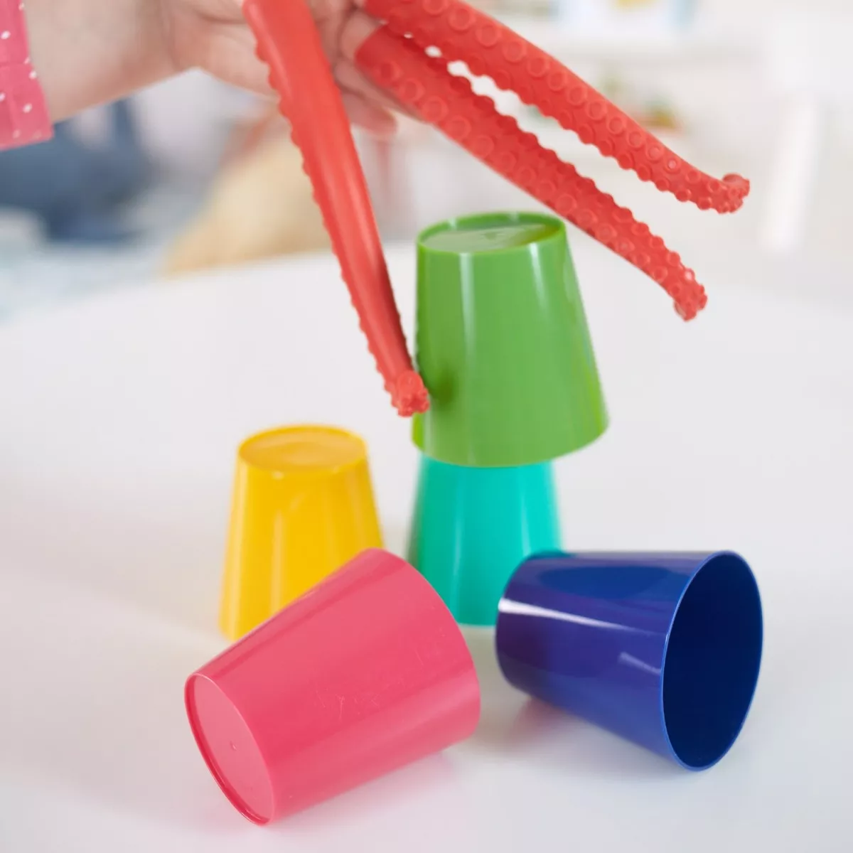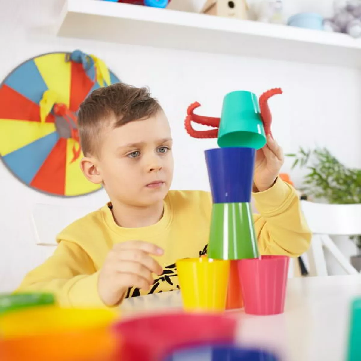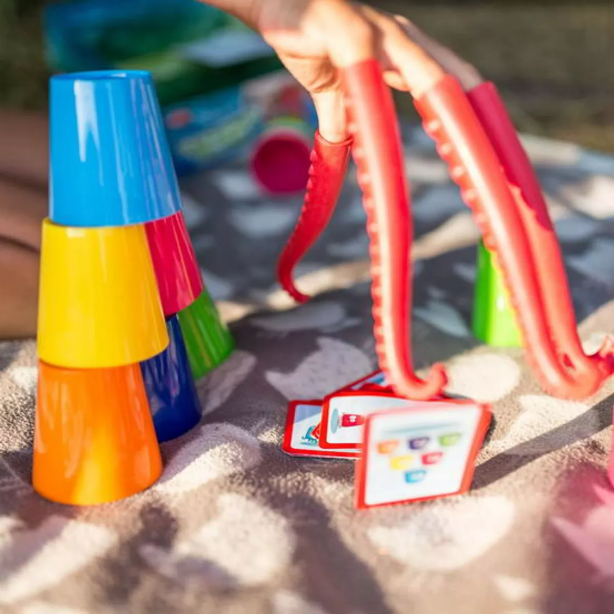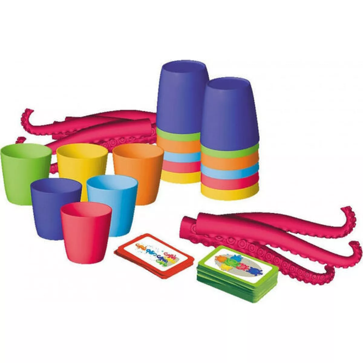 У коробці 18 чашок 6 різних кольорів, 9 щупалець восьминога, 27 карток із завданнями, інструкції
