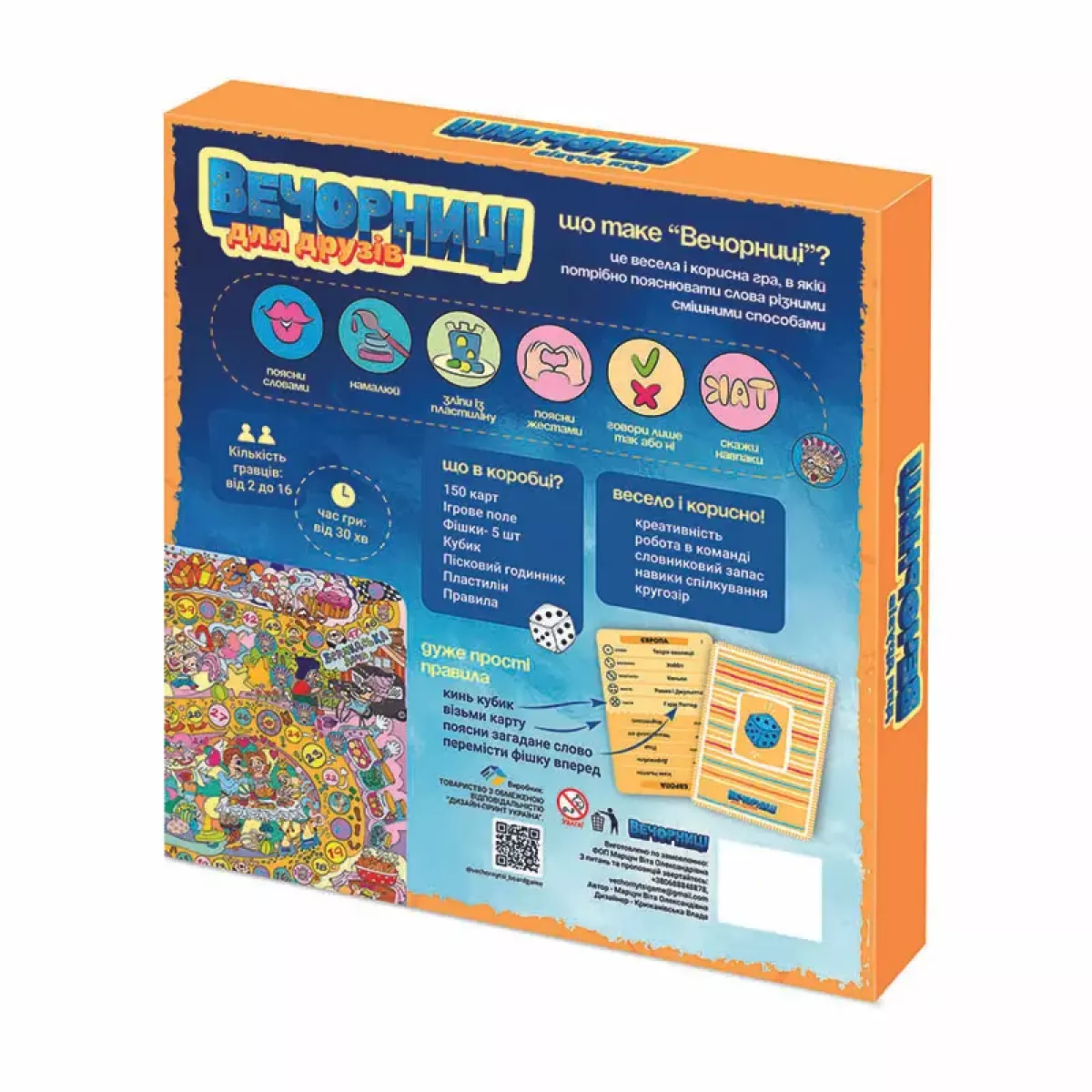 «Вечорниці для друзів» – це командна гра на пояснення слів різними способами. За 1 хвилину буде необхідно пояснити словами, жестами, малюнком, чи іншим вказаним способом, слова на картці.