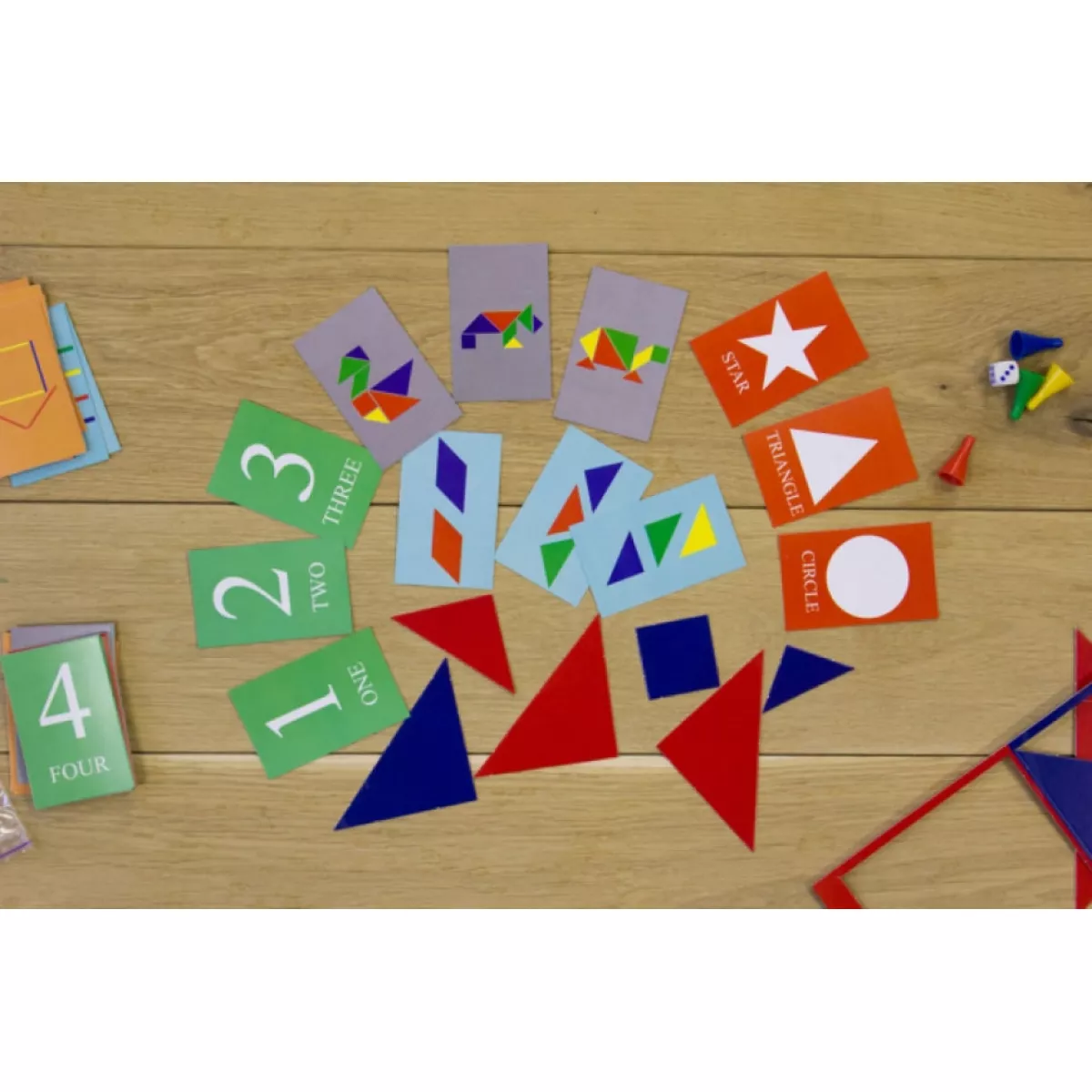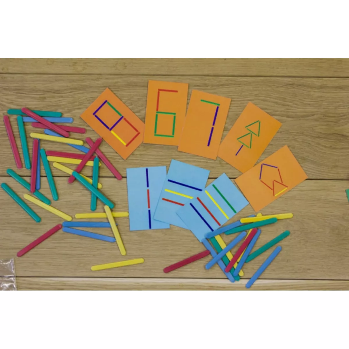 В наборі палички для рахування, які так подобаються дітям, адже за допомогою них можна легко рахувати або складати зображення чисел. Також в коробці є різноманітні фігури, які можна використовувати для складання танграмів.