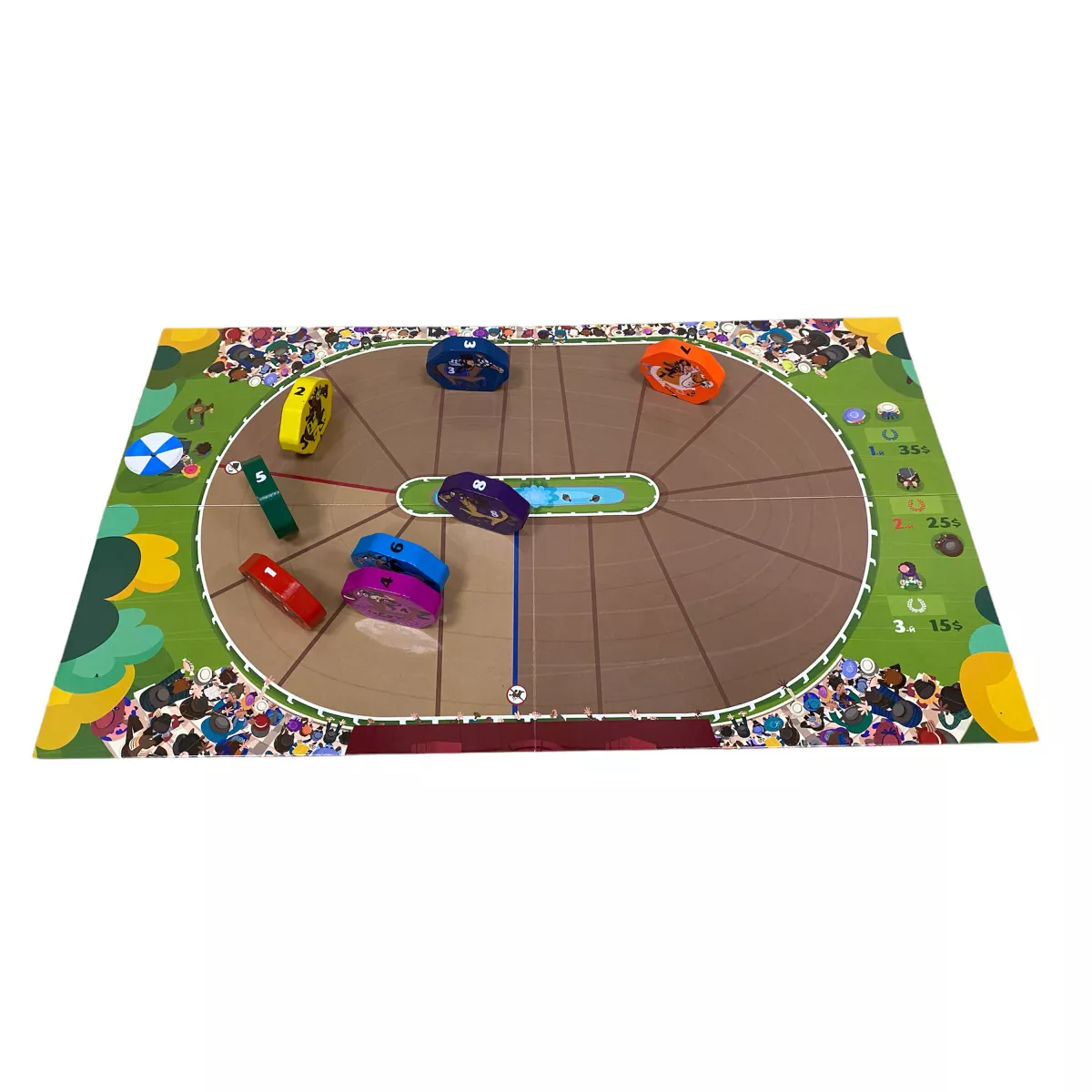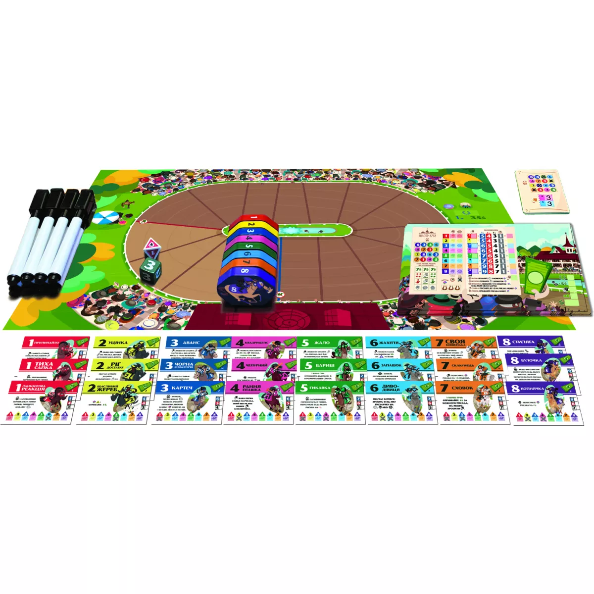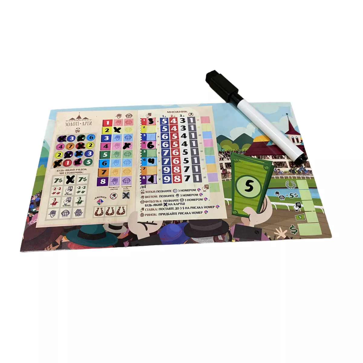 У коробці 1 дошка для гоночної траси , 8 аркушів гравця , 1 аркуш для соло гри, 32 карти , 8 стартових карт, 24 карти коней, 8 жетонів коней , 8 маркерів , 1 Кінський кубик , 1 кубик руху