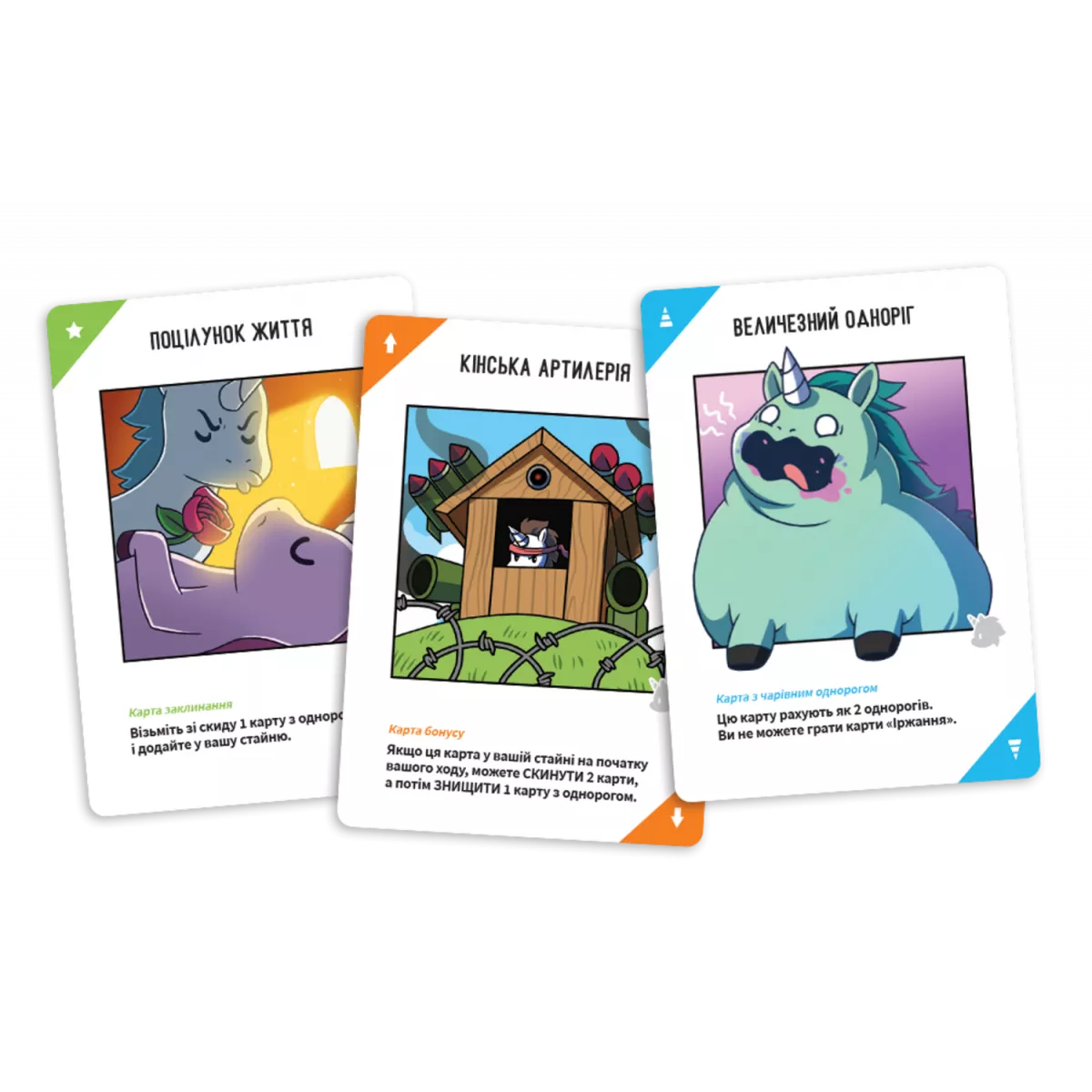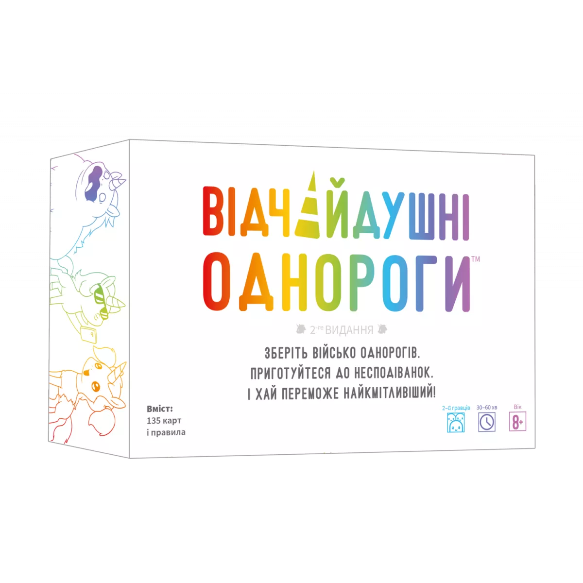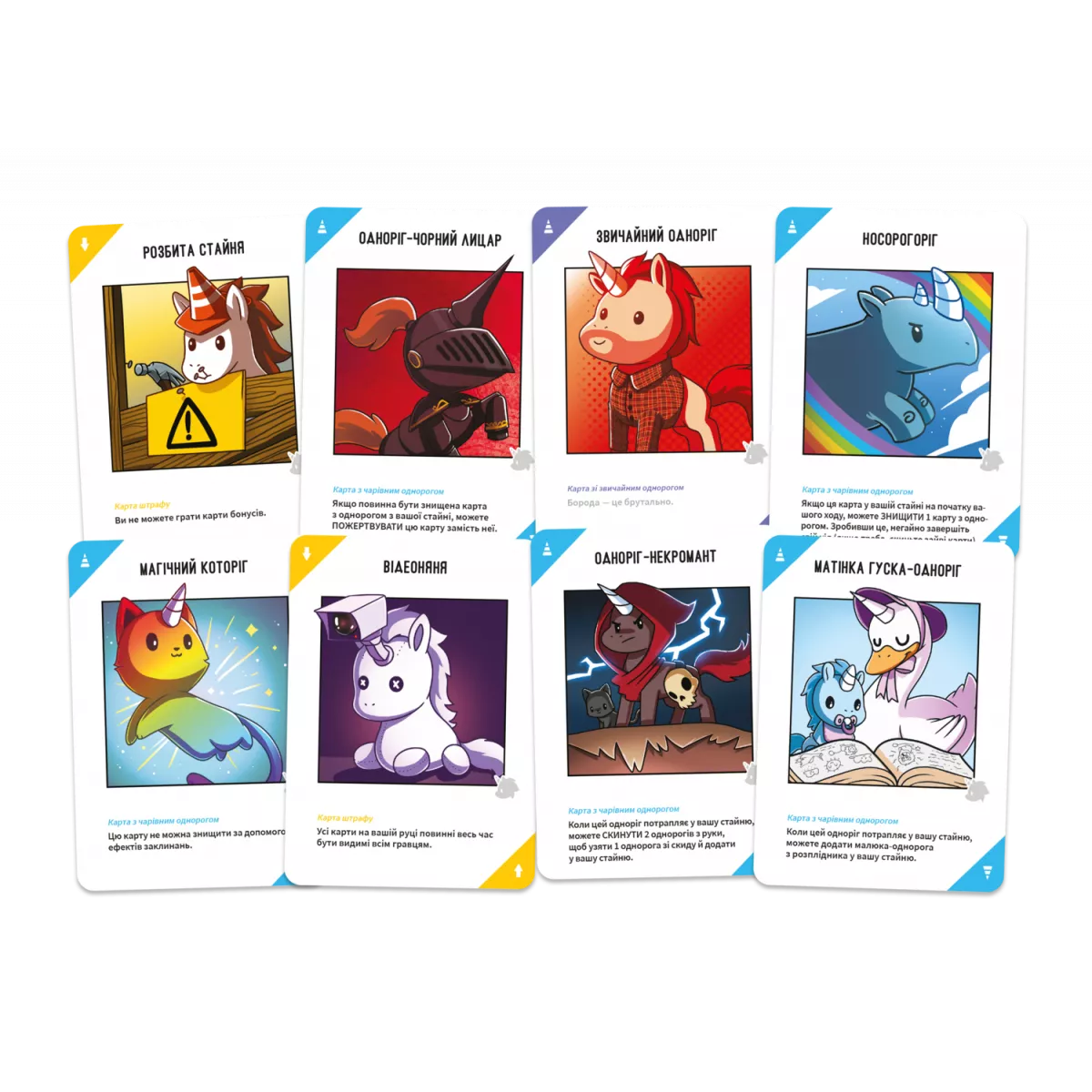 «Відчайдушні однороги» — це стратегічна карткова гра з механікою збирання сетів і привабливим барвистим оформленням. І, звісно, дрібкою гумору! Гра безперечно стане хітом будь-якої вечірки та гарантовано сподобається всім учасникам (незалежно від їхнього ставлення до однорогів і наявності морального компаса).