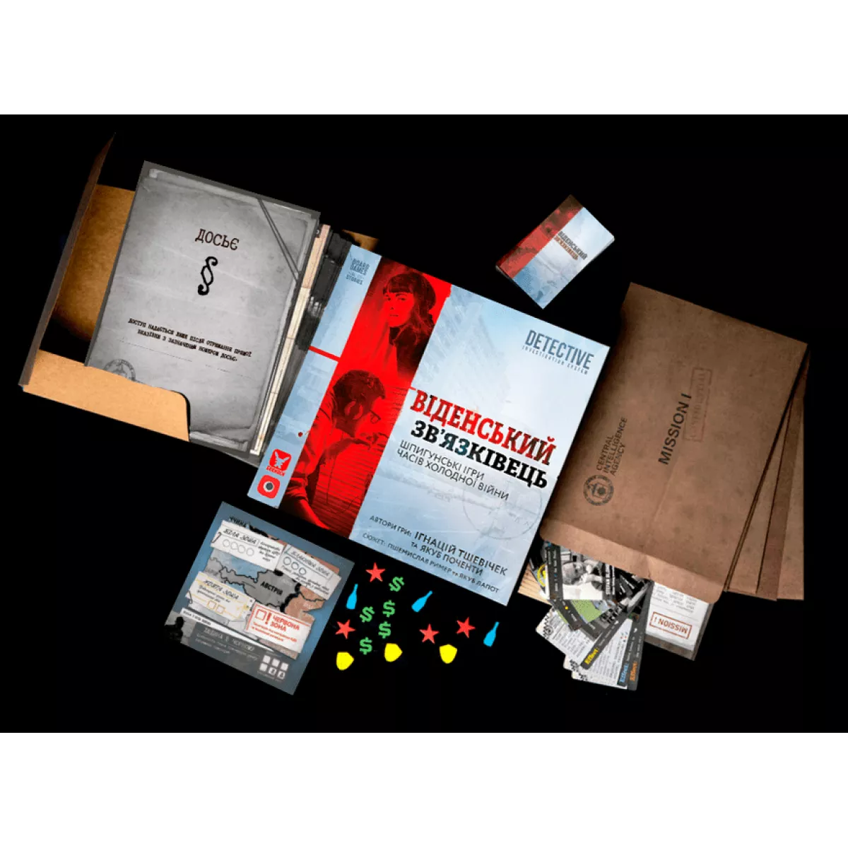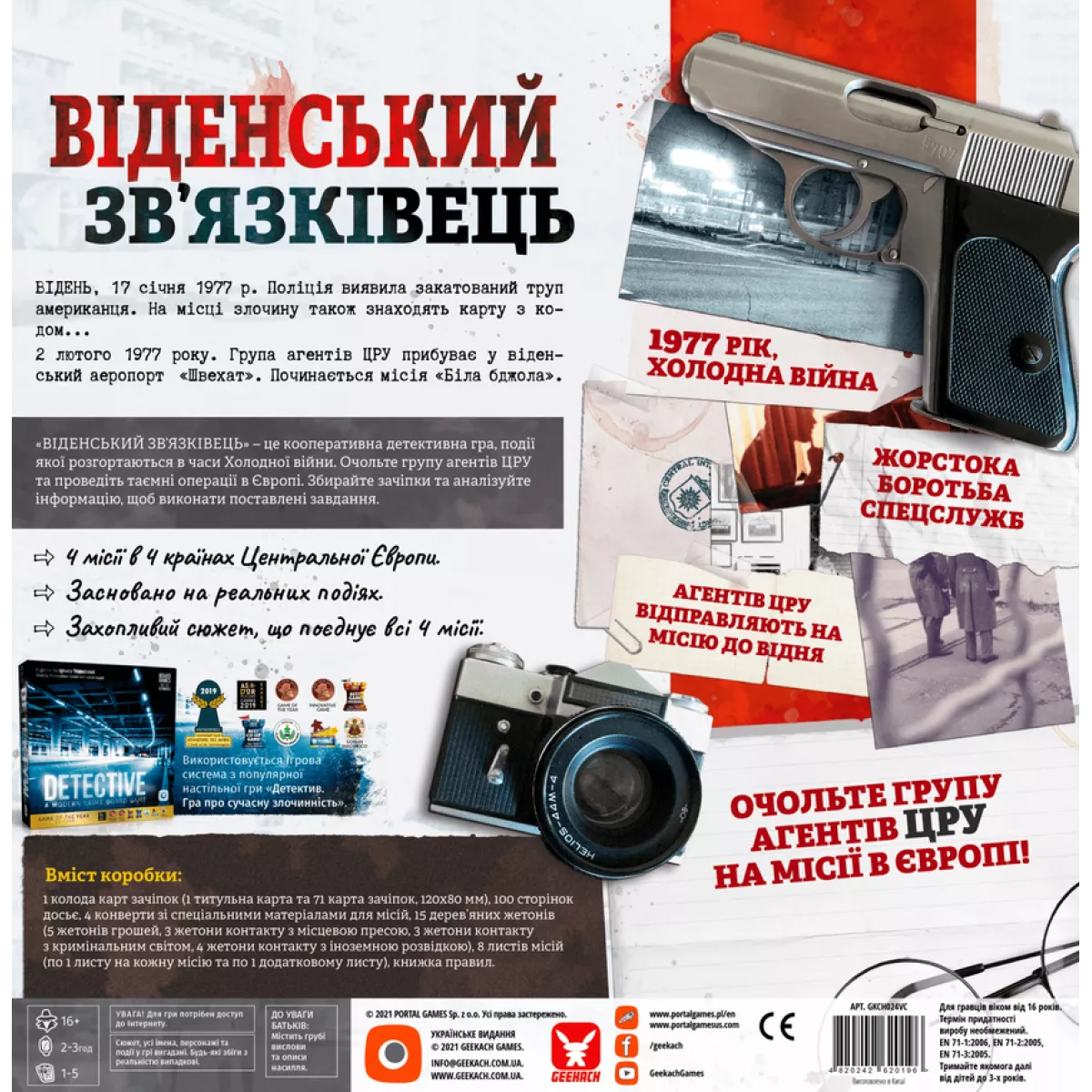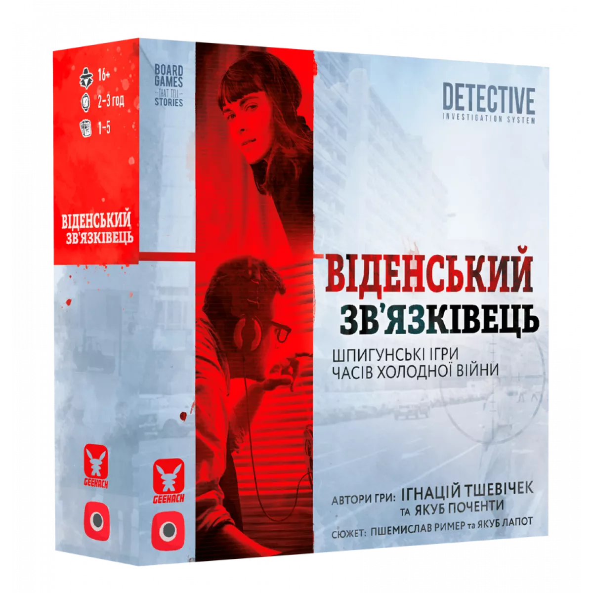 Настільна гра Віденський зв'язківець (Vienna Connection) - це кооперативна детективна гра, яка пропонує вам взяти на себе роль шпигунів часів холодної війни. Це ідеальний варіант для тих, хто любить ігри-оповідання, хороші детективні сюжети та шпигунську тематику. Пориньте в хитросплетіння фактів, домислів і теорій! Ви візьмете участь у чотирьох місіях під прикриттям, в ході яких потрібно буде подорожувати по Європі, шукати інформаторів, збирати зачіпки і протистояти задумам ворога. Вам належить спільно вирішувати, які зачіпки заслуговують на увагу, але будьте обережні: кожна ваша дія може привернути увагу іноземних спецслужб. Віденський зв'язковий заснований на механіці настільної гри Детектив: Гра про сучасне розслідування Ігнація Тшевічека, яка майже відразу після виходу підкорила тисячі гравців по всьому світу і завоювала півтора десятка нагород і номінацій. Увага! Після придбання гри не можна брати і читати картки та матеріали досьє, поки не отримаєте такої вказівки.