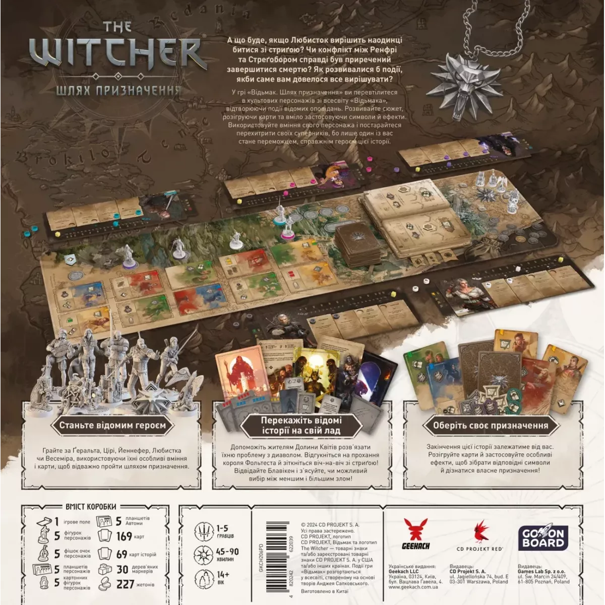 Перепишіть на свій лад культові історії про Відьмака, кожна з яких пропонує особливі правила, компоненти, сюжет та ігровий досвід, а також варіативність, завдяки якій кожну історію можна грати безліч разів. Кожен персонаж має свої особливі здібності, карти та побічні квести. Крім цього, одна з історій має правила соло-гри для того, хто не боїться кинути виклик долі самотужки.