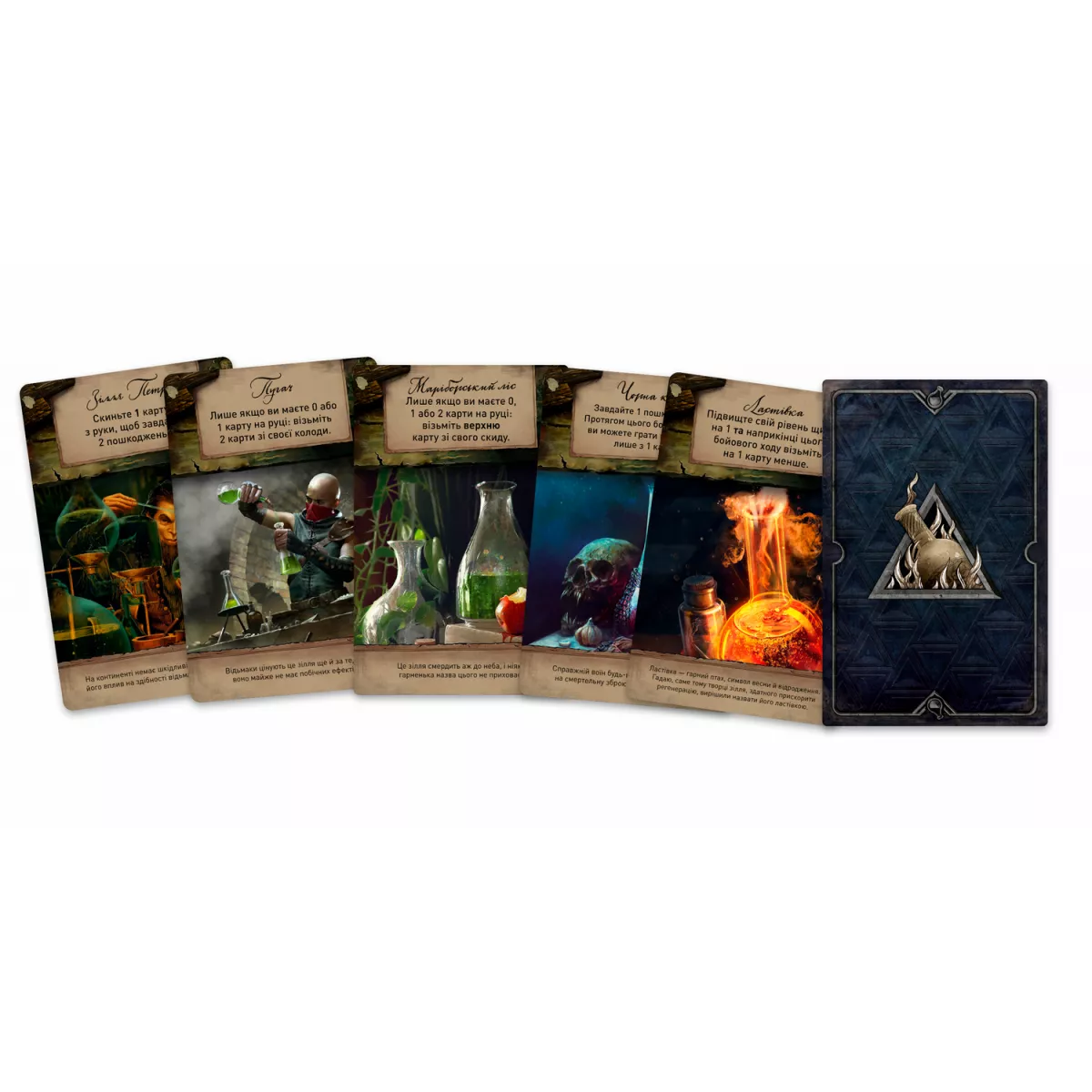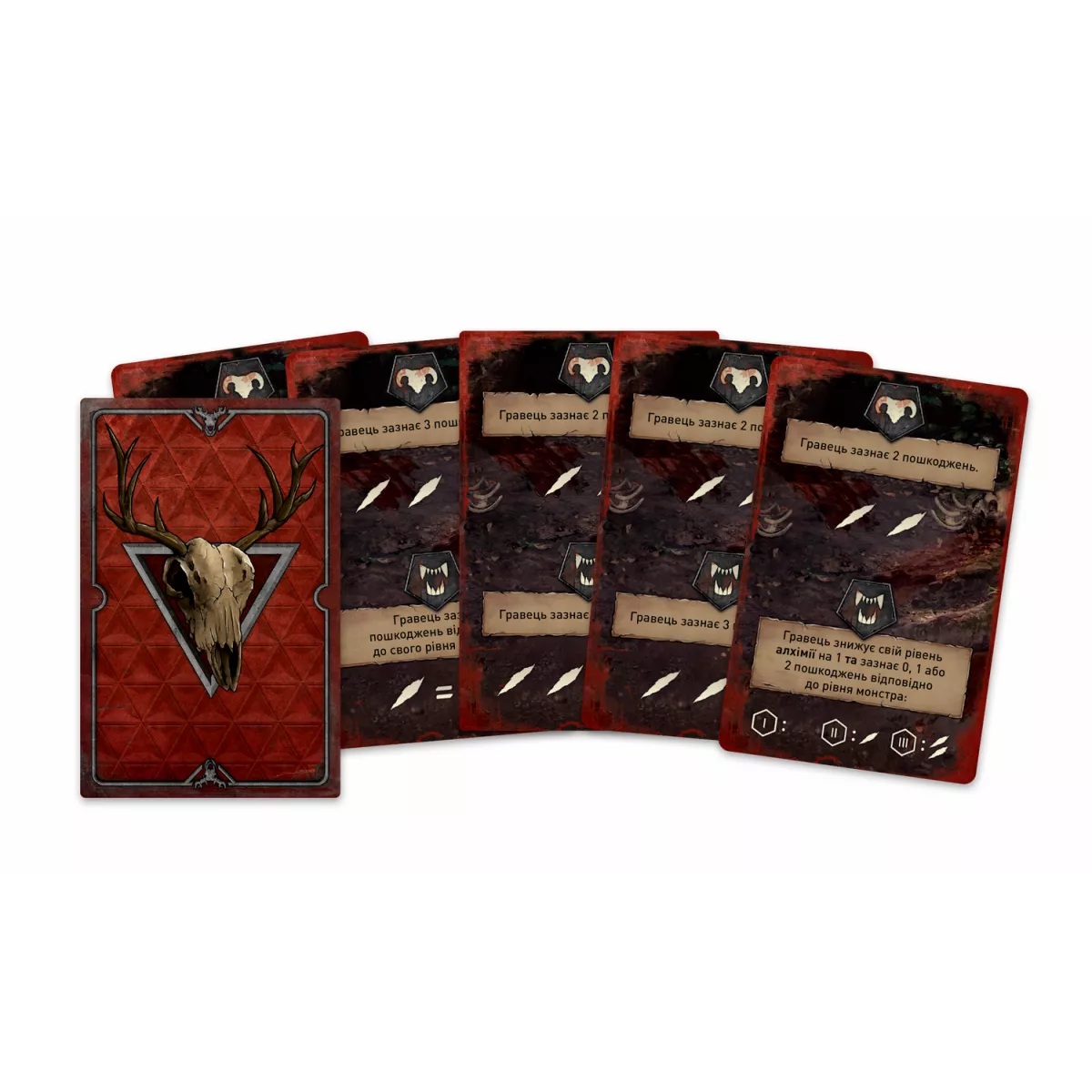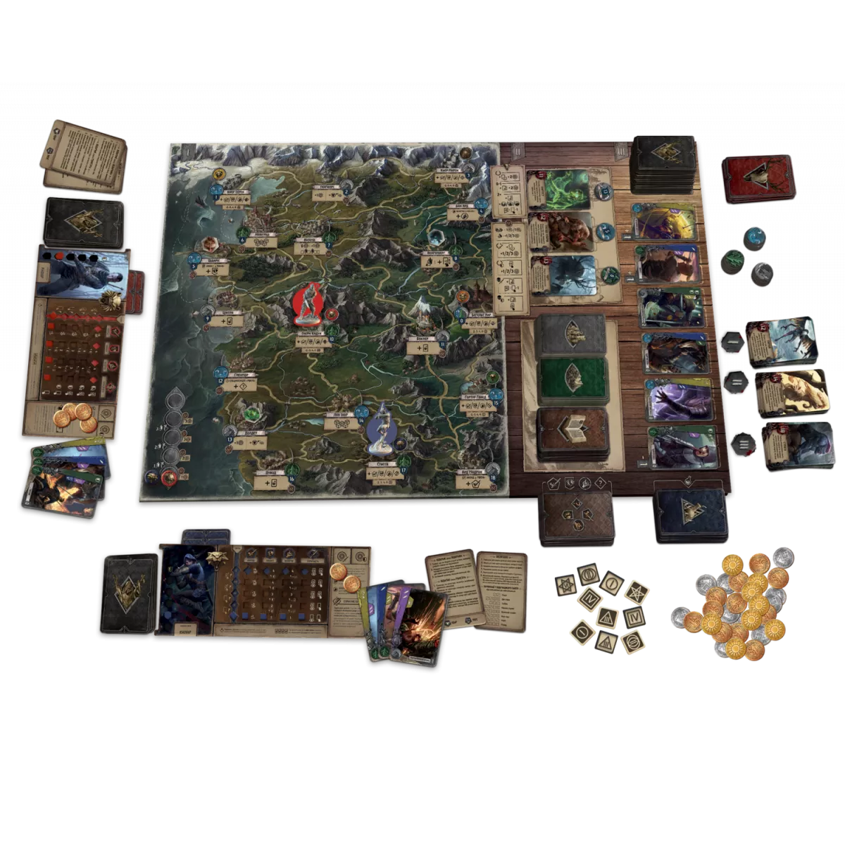 У коробці 1 ігрове поле, 5 фігурок відьмаків, 28 фігурок монстрів, 87 жетонів, 30 дерев'яних маркерів, 10 кубиків для відьмацького покеру, 383 карти, 5 планшетів гравців, правила