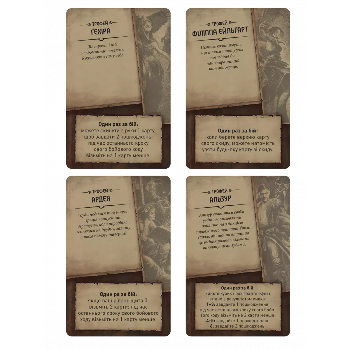 Використовуйте нові карти, щоб вивчити потужні заклинання й побудувати колоду, яка дозволить вийти переможцем із найнебезпечніших боїв. Полюйте на потвор і збирайте інгредієнти, потрібні для різного зілля. Здобувайте славу й поліпшуйте репутацію. Здійснюйте подвиги, які відьмакам і не снилися!