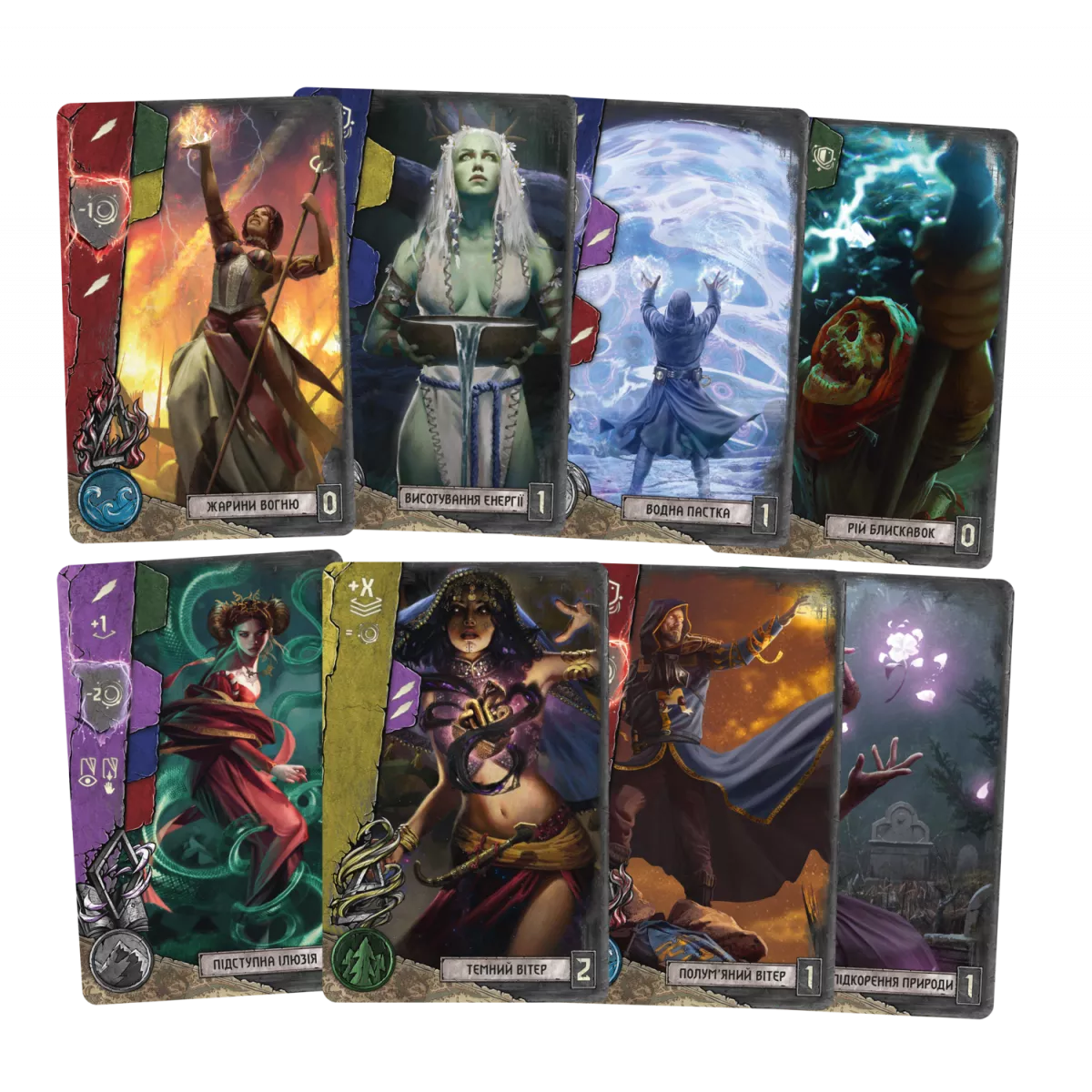 Кольори карт дій магів символізують заклинання різних напрямів: жовтий – повітря, синій – вода, зелений – земля, червоний – вогонь, пурпуровий – свідомість.