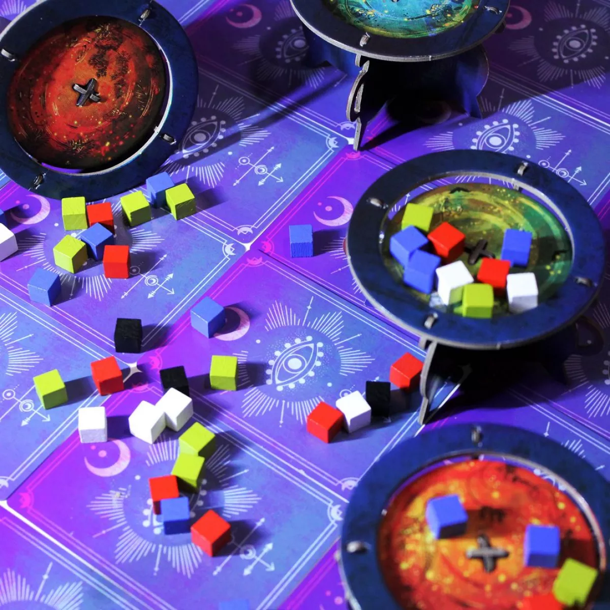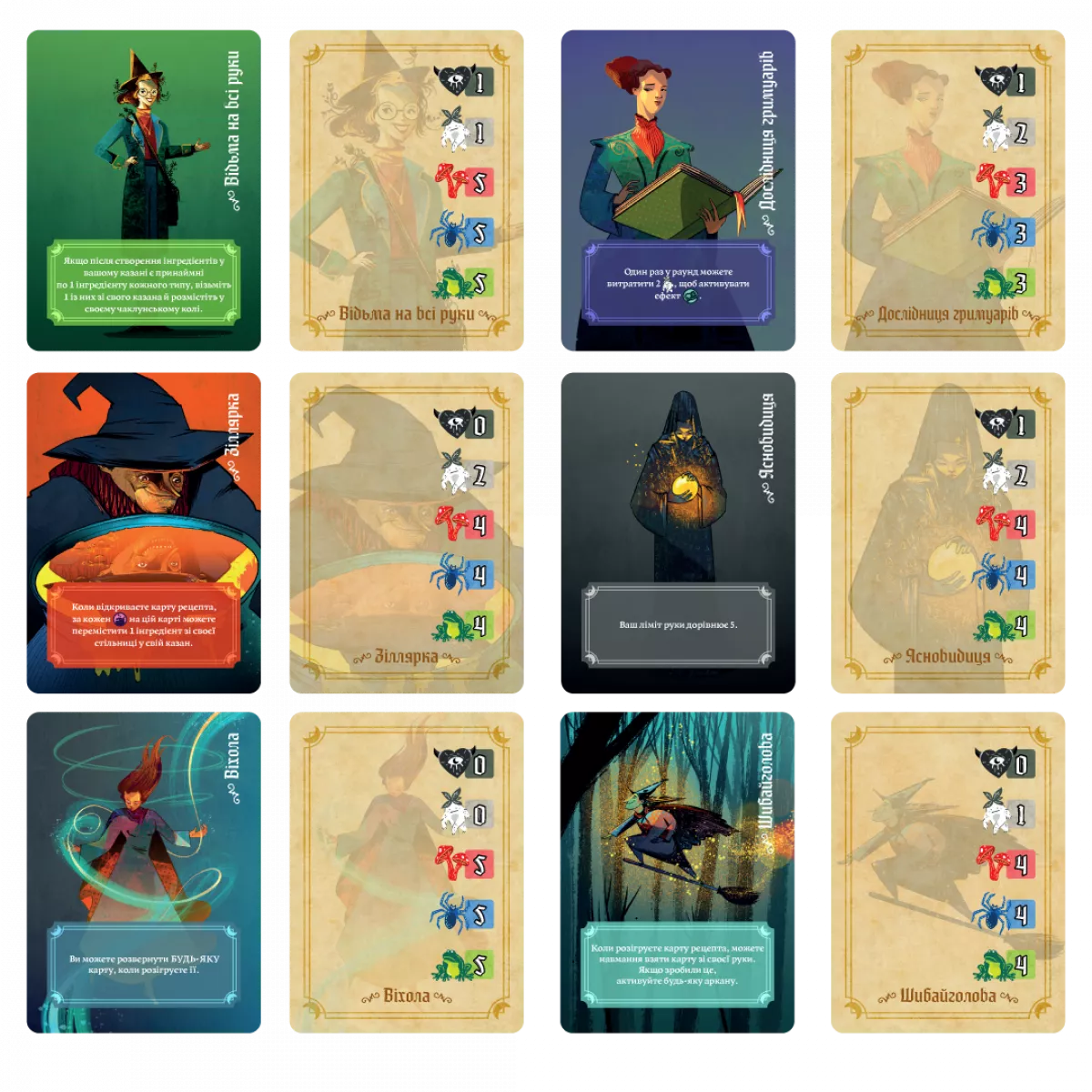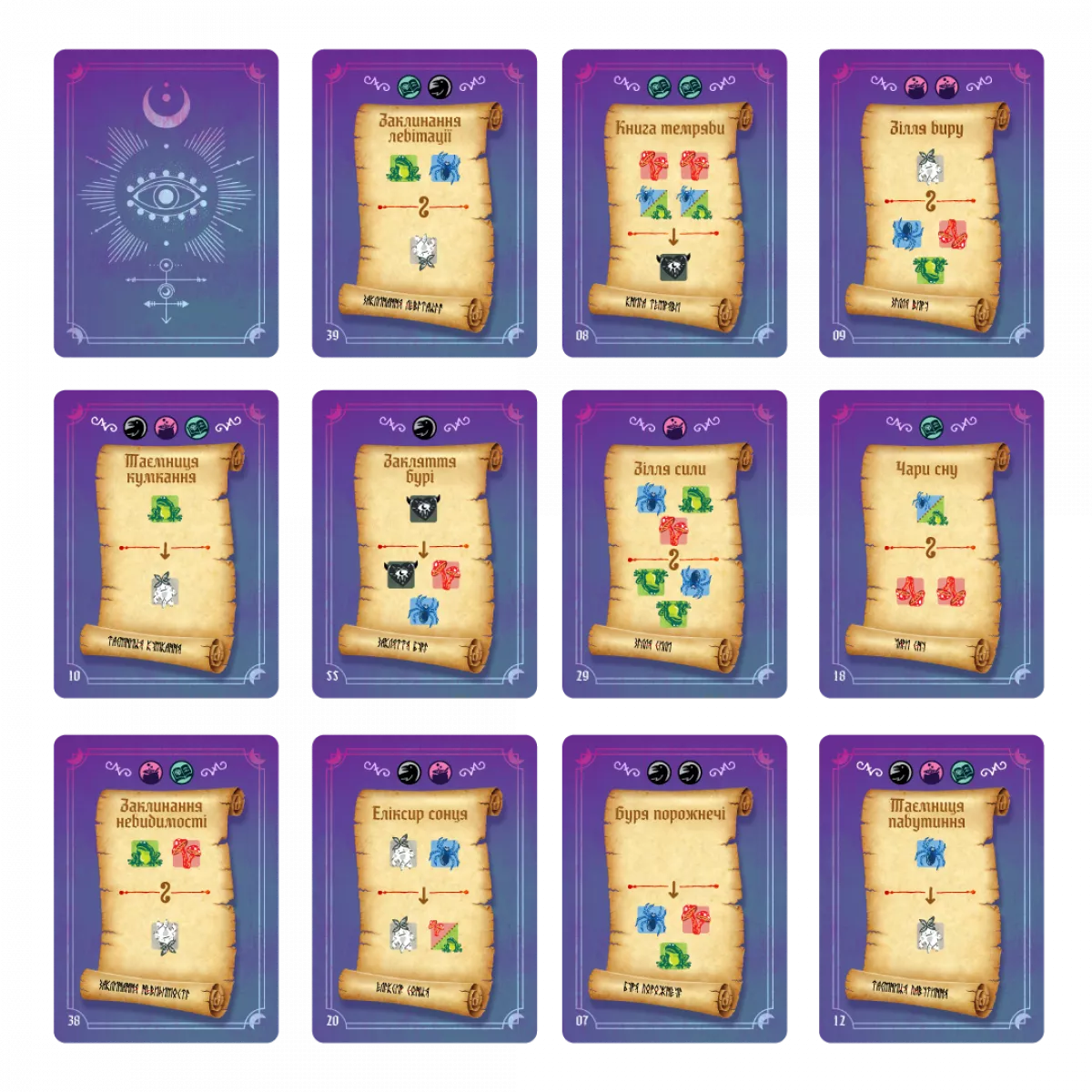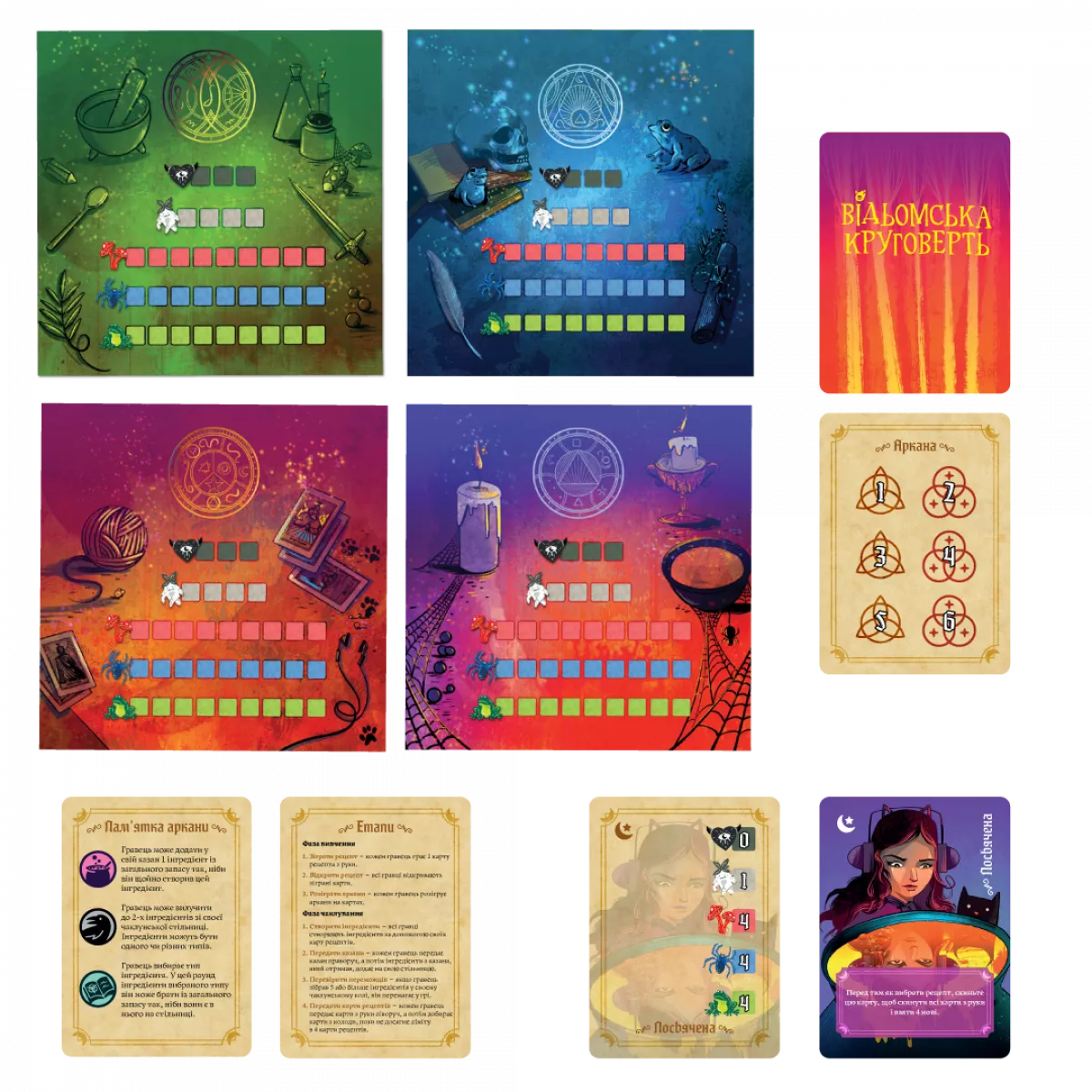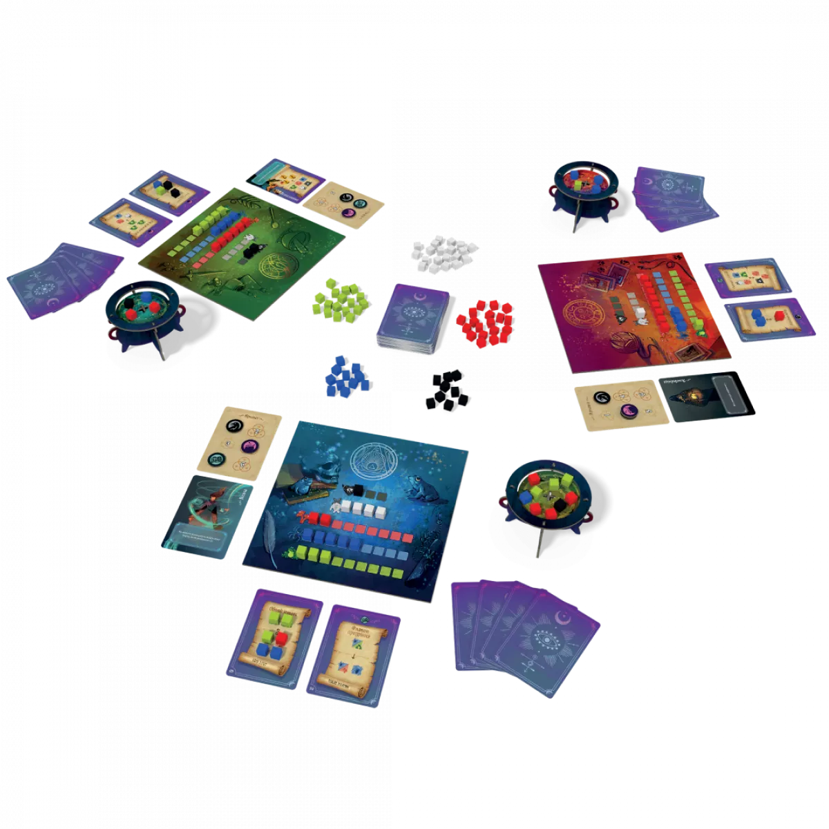 У коробці 1 ігрове поле, 5 планшетів гравців, 5 казанів, 15 жетонів Аркани, 5 довідок, 60 карт рецептів, 17 персональних карт, 170 кубів інгредієнтів, правила