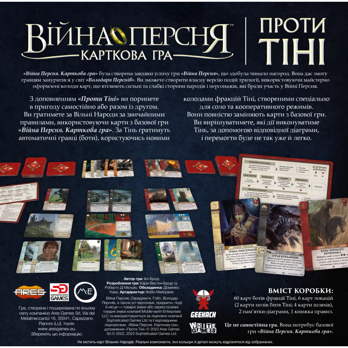 У коробці 60 карт ботів фракцій Тіні, 6 карт локацій, 2 пам'ятки, правила гри