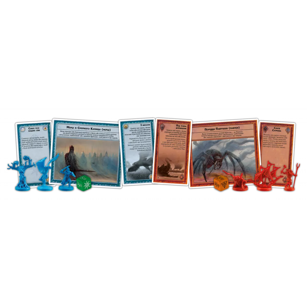 У коробці 1 особливий кубик фракцій для Вільних Народів (зелений);, 1 особливий кубик фракцій для Тіні (оранжевий);, 48 пластикових фігурок (по 8 на фракцію);, 6 карт-пам’яток фракцій;, 2 пам’ятки кубиків дій фракцій;, 62 ігрові карти;, Правила гри.