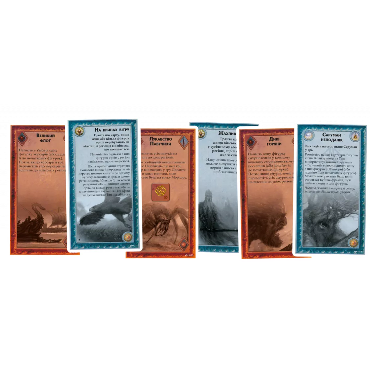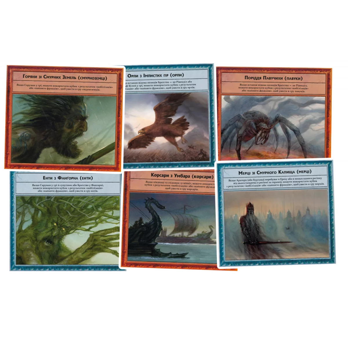 Ці нові фракції також дуже відрізняються від початкових сил, залучених у Війні за Кільце. Вони не просто збільшують силу армій (хоча іноді можуть), а також мають власні картки подій фракцій, які використовуються для введення їх у гру. Якщо у вас на дошці є Орли, але жодна з ваших карт не стосується Орлів, тоді ваші Орли нічого не можуть зробити. Ці картки подій фракції утворюють нову колоду, і кожен гравець має ліміт рук – чотири. Фракції також мають власні бойові карти, які можна використовувати замість звичайних бойових карт, і (це чудово!) зворотна сторона карт така ж, як і оригінальні картки з базової гри, тож ваш опонент не знає, який вид карта, яку ви зіграли. Ці карти також не вичерпуються, тому їх можна використовувати знову і знову, тобто вам не потрібно витрачати інші карти подій лише тому, що ваш опонент наполягає на використанні однієї, а ви хвилюєтеся, що він міг зіграти.