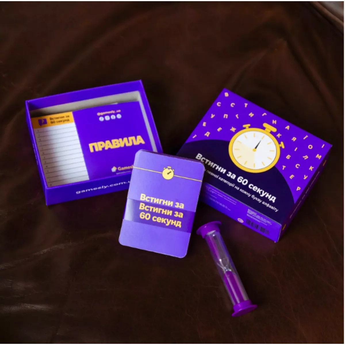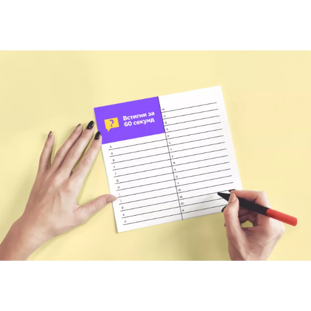 "Встигни за 60 секунд?" — це динамічна настільна гра для компанії, яка перевіряє вашу пам'ять, винахідливість та здатність швидко мислити під тиском часу. У грі вам доведеться за одну хвилину згадати слова з певної тематики на всі літери абетки і записати їх без жодної помилки!