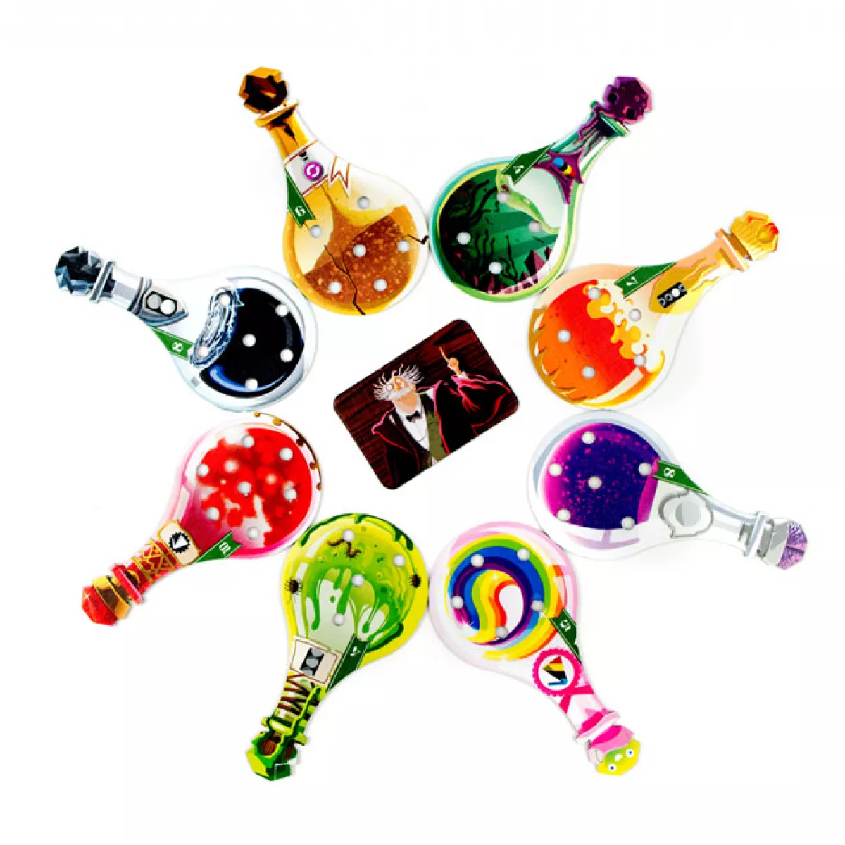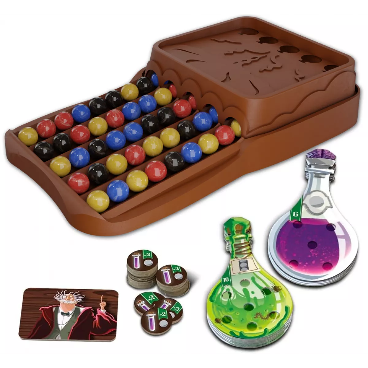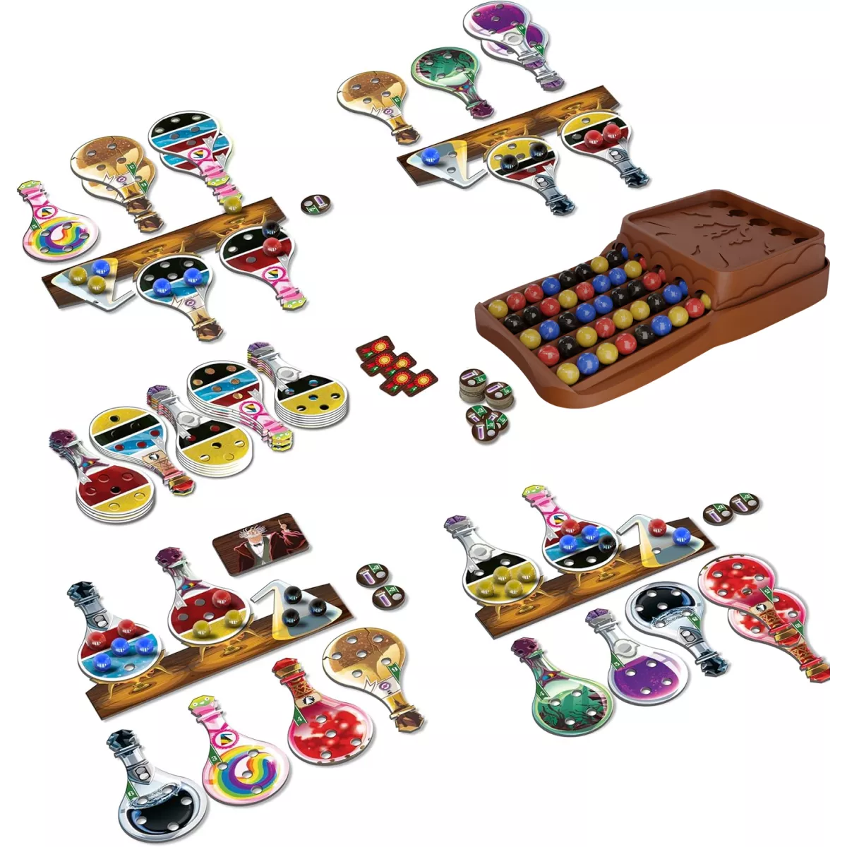 У коробці 1 розподільник;, 80 кульок інгредієнтів;, 64 плитки зілля 8 видів;, 15 відзнак майстерності;, 21 жетон підказок;, 4 планшети парт;, 1 жетон першого гравця;, правила гри.