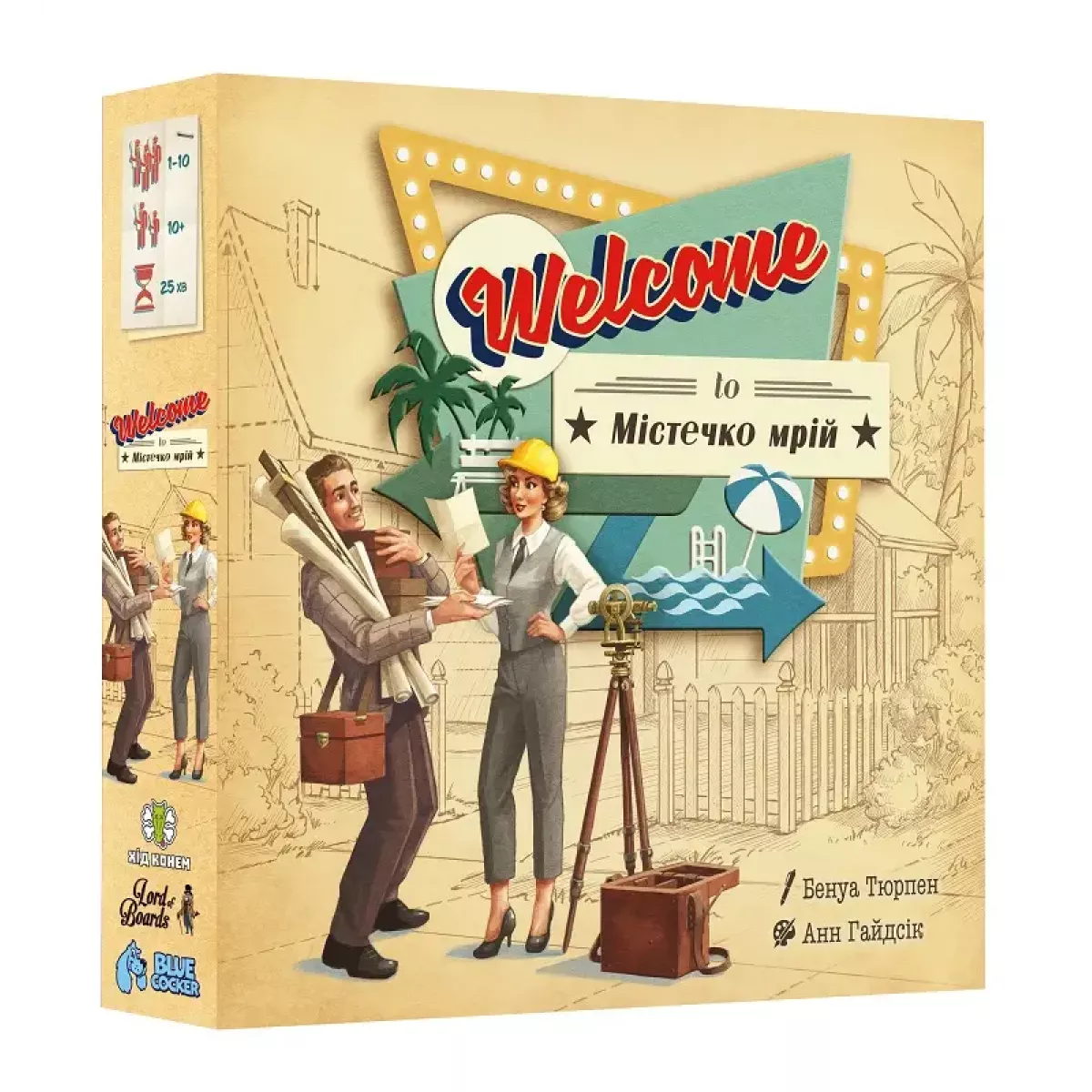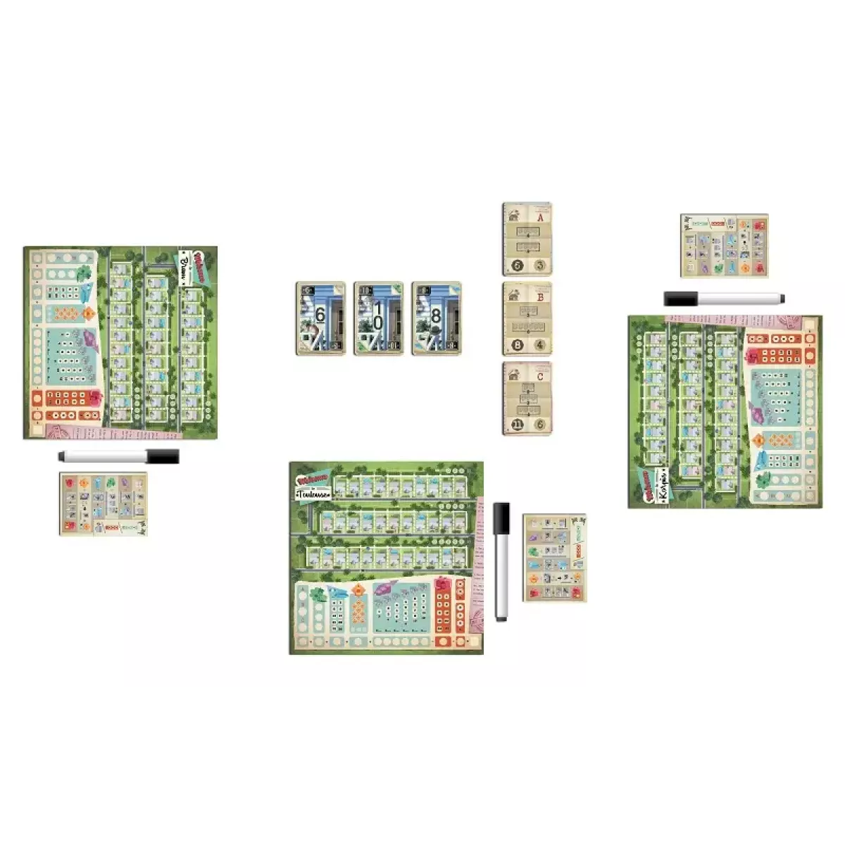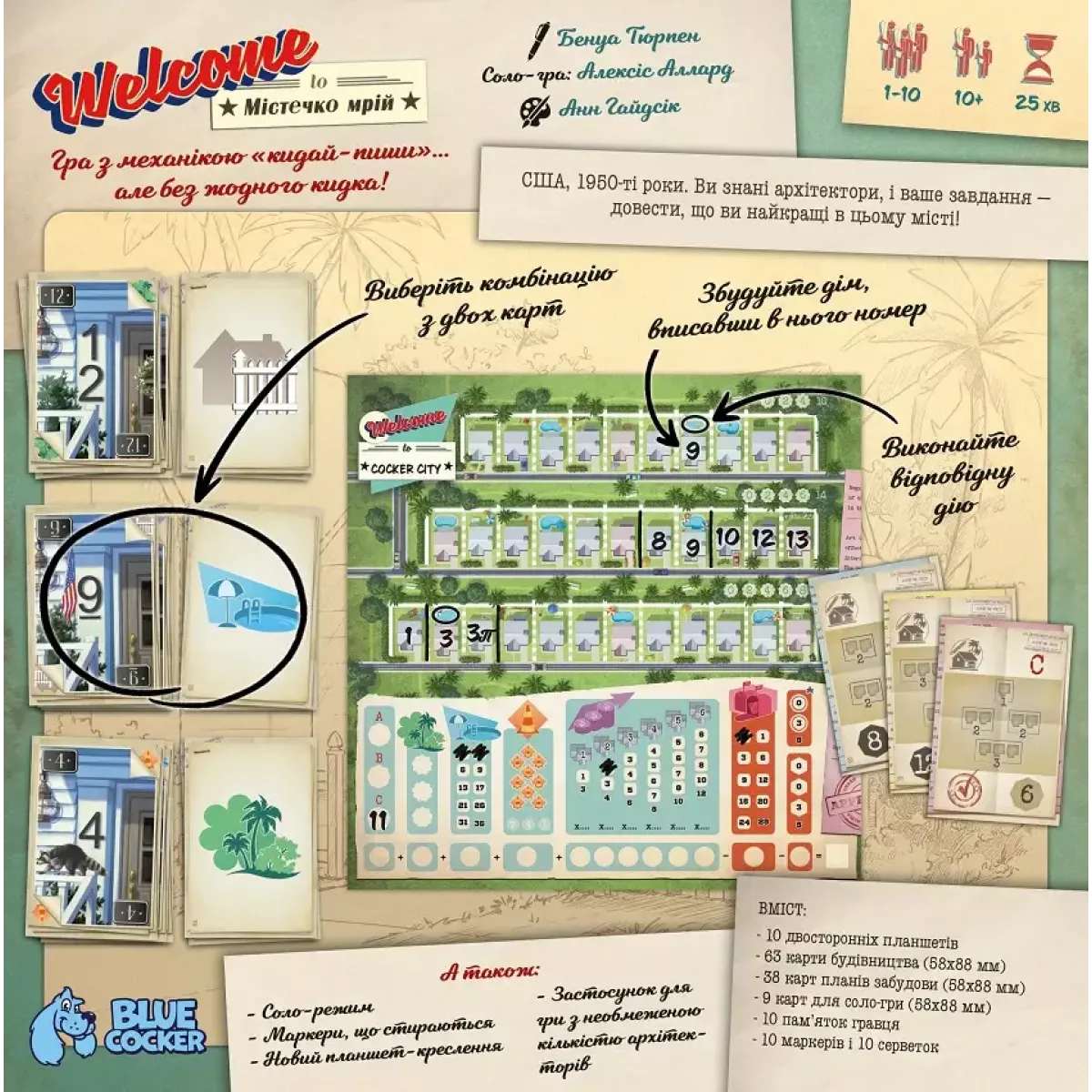 Американська мрія – маленькі затишні містечка із галявинами та басейном. У 50-х роках минулого сторіччя вони з’являлися наче гриби після літнього дощу! Проблема була лише одна, а саме: брак висококваліфікованих архітекторів! Та сьогодні ви маєте змогу стати одним із таких інженерів та побудувати своє Містечко мрій! Це гра із основною механікою roll-and-write, у якій треба ще й досить ретельно планувати, адже ігровий процес зовсім не такий простий, як може здатися спершу! Тож, що з себе представляє ігровий процес? Кожен гравець отримує власний план містечка, після чого на ігровому столі викладаються 3 колоди карток. На одному боці карти намальований ресурс, а на іншому – число. Нові карти викладаються таким чином, щоб число і ресурс лежали поруч (нащо вони треба ми ще розкажемо, хвилинку). Гравці можуть обирати одну з відкритих комбінацій карт, аби відобразити її на своїх планшетах (зауважимо, що перед вами видання гри, у якому замість паперових листочків із містечками передбачено багаторазові планшетки, на яких гравці будуть малювати маркерами!) А от яку саме комбінацію обрати – це головна математична задачка гри! Що ми маємо: Карта із числом Число на карті – це номер будинку. І, вочевидь, будиночки на вулиці повинні розміщуватись за зростанням номеру! Тож, обравши карту, потрібно записати номер на будинку, який гравець вважає найбільш доречним так пронумерувати (буває, що за будинком № 4 йде будинок № 6, але ніколи навпаки). Карта із малюнком Якщо із числами все більш менш просто, то от малюнки діляться на беееезліч типів. Пару слів про кожен окремо? Повірте, у нас не вистачить часу, так їх багато! Просто знайте, що за допомогою цих карт можна і будувати басейни, і зводити паркани, і насаджувати парки, і навіть трішки змінювати номер дому! І кожна успішно виконана дія приноситиме відповідному містечку переможні очки. Також архітектори мають виконати план із розбудови, зазначений перед початком партії. Перший, хто це зробить – буде винагороджений! Другий також, але вже менше. Хоча навіть невеличка винагорода - це приємно! Ба більше, якщо виконати три таких плани, то гра закінчується і всі гравці підраховують переможні очки. Також кінець гри настане, коли один з гравців тричі не зможе побудувати будинок ніде у своєму містечку, або у одному із міст будуть побудовані всі можливі будиночки. І, як результат, ми маємо неймовірно комплексну гру, у якій не вийде просто малювати будиночки аби-де, а треба прораховувати свої ходи, пам’ятати, які номери будинків ще залишились, а головне – яким чином зробити своє містечко найбільш привабливим для містян! А ще - у грі є соло режим, до того ж зовсім не простий та неймовірно цікавий. І все це гра Welcome To Містечко мрій (Welcome To...), яке насправді займе одне з провідних місць не лише у вашій колекції, а й у серденьку! Якщо ж ви хотіли б менш напруженого ігрового процесу, але при тому - змішати малювання шляхів із механіками збору покерних комбінацій – варто звернути увагу на гру Pioneer Rails.