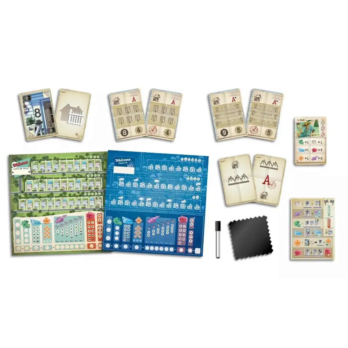 У коробці 63 карти будівництва, 21 карта стандартних планів забудови, 17 карт складних планів забудови, 10 двосторонніх ігрових планшетів, 10 пам’яток гравця, 10 маркерів, 10 серветок, 3 карти затвердження, 6 карт конкурента, Правила