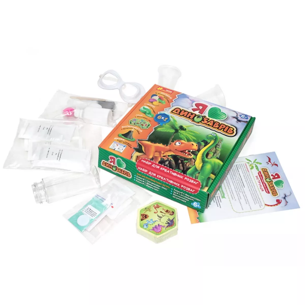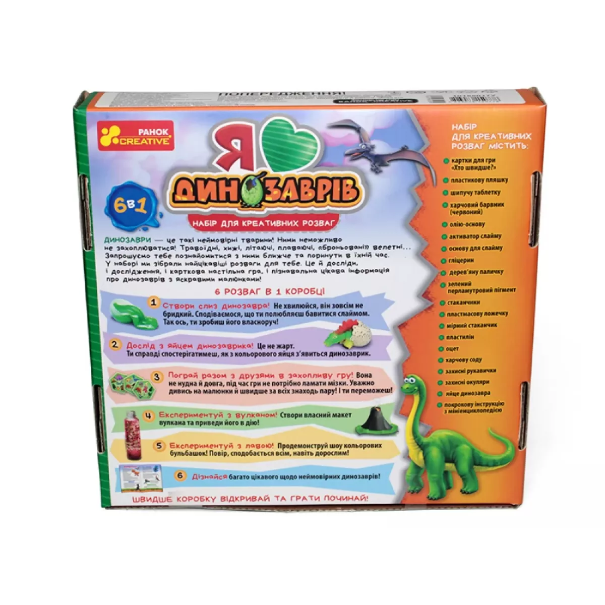 Розваги не на один вечір На думку Joyа, це найкорисніший подарунок для всіх, хто цікавиться динозаврами. Міні-енциклопедія забезпечить малюків новими знаннями, а шість забав в комплекті принесуть купу нових вражень.  Що в наборі? Це і досліди (вулкан та інші), і весела карткова настільна гра на швидкість реакції, і улюблений усіма дітьми слиз, з яким ще довго можна гратися. Цей подарунковий набір створений компанією Ranok Creative, яка співпрацює з дитячими педагогами та психологами.