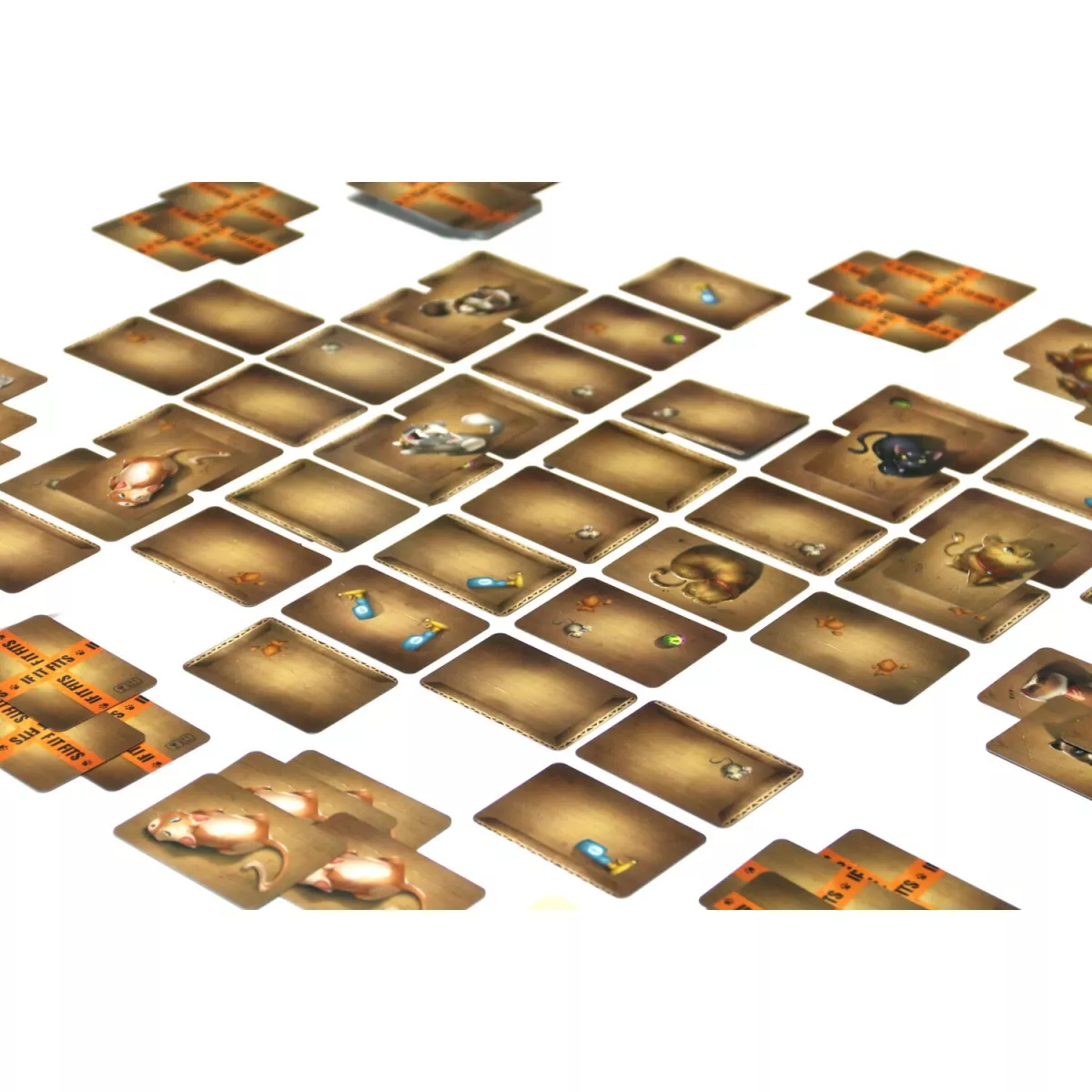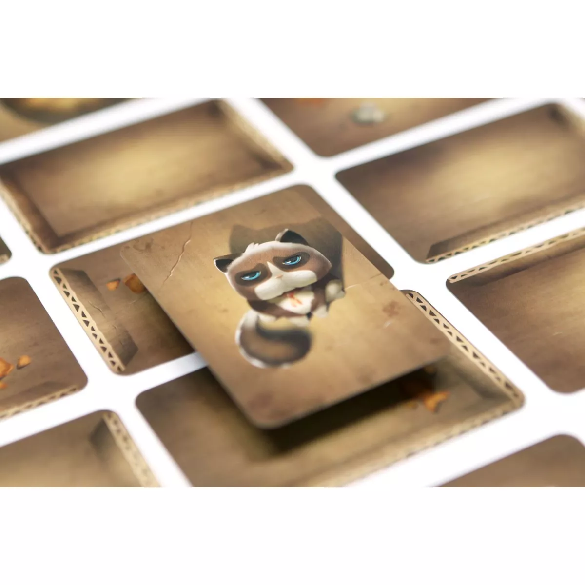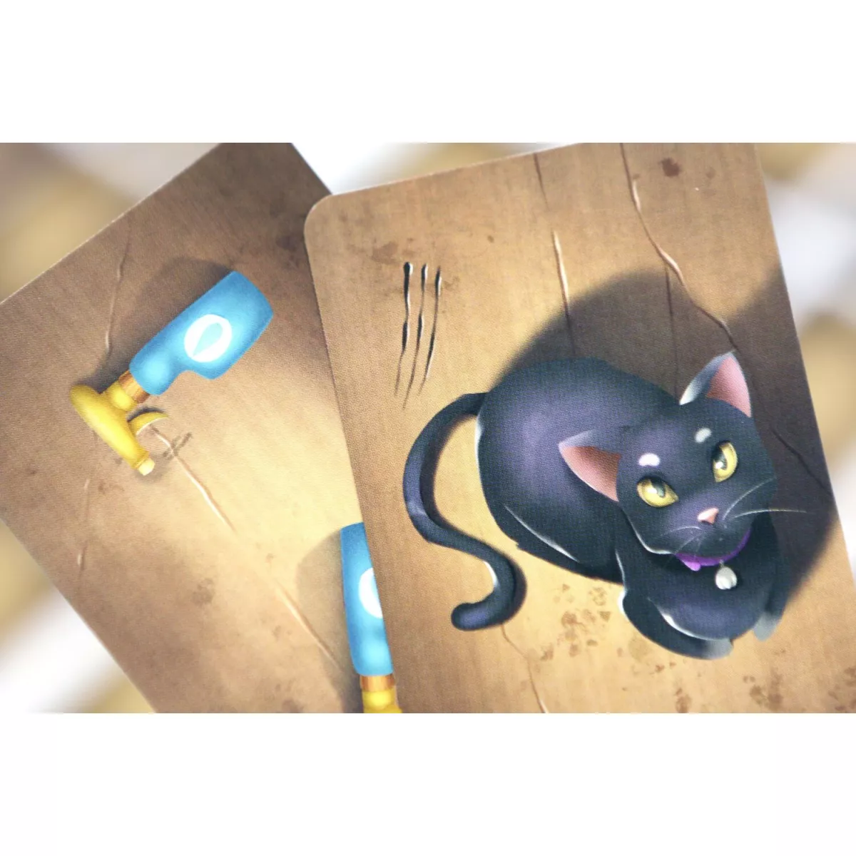 У коробці 25 двобічних карток котів, 5 карток чорної кішки - Принцеса, 5 стартових карток коробок, 3 спеціальні картки іграшок, 72 картки коробок, правила гри
