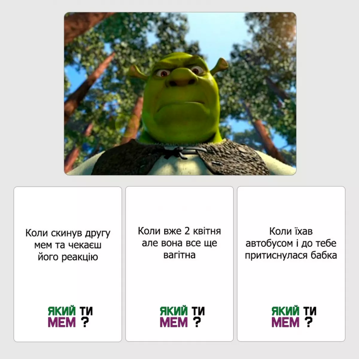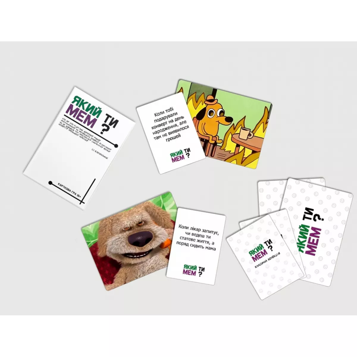 «Який ти МЕМ?» – це візуальна скарбниця інтернет-гумору останніх років, що пропонує гравцям кумедно та вигадливо поєднувати зображення із підписами. Переможе той, хто обере найвлучніший варіант!