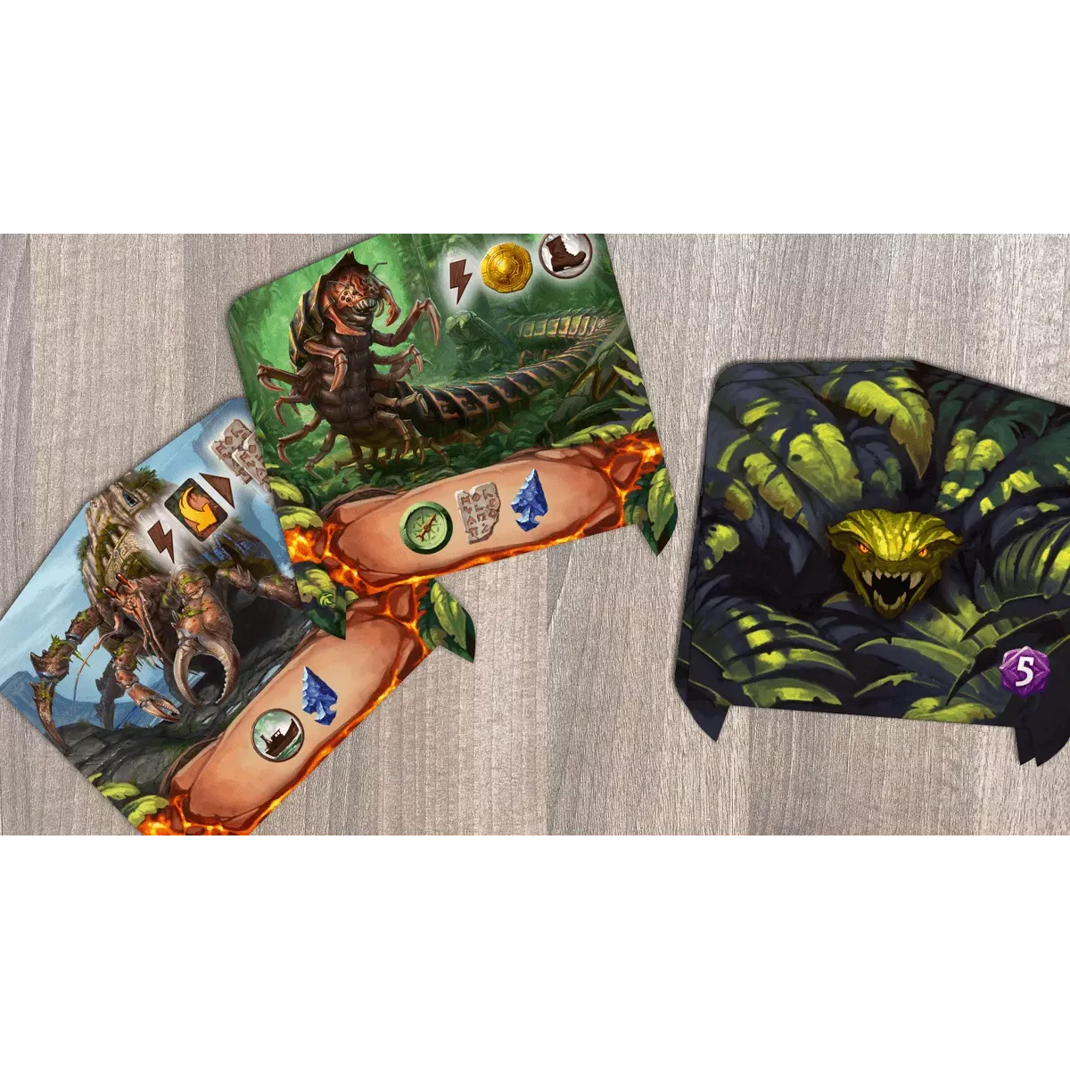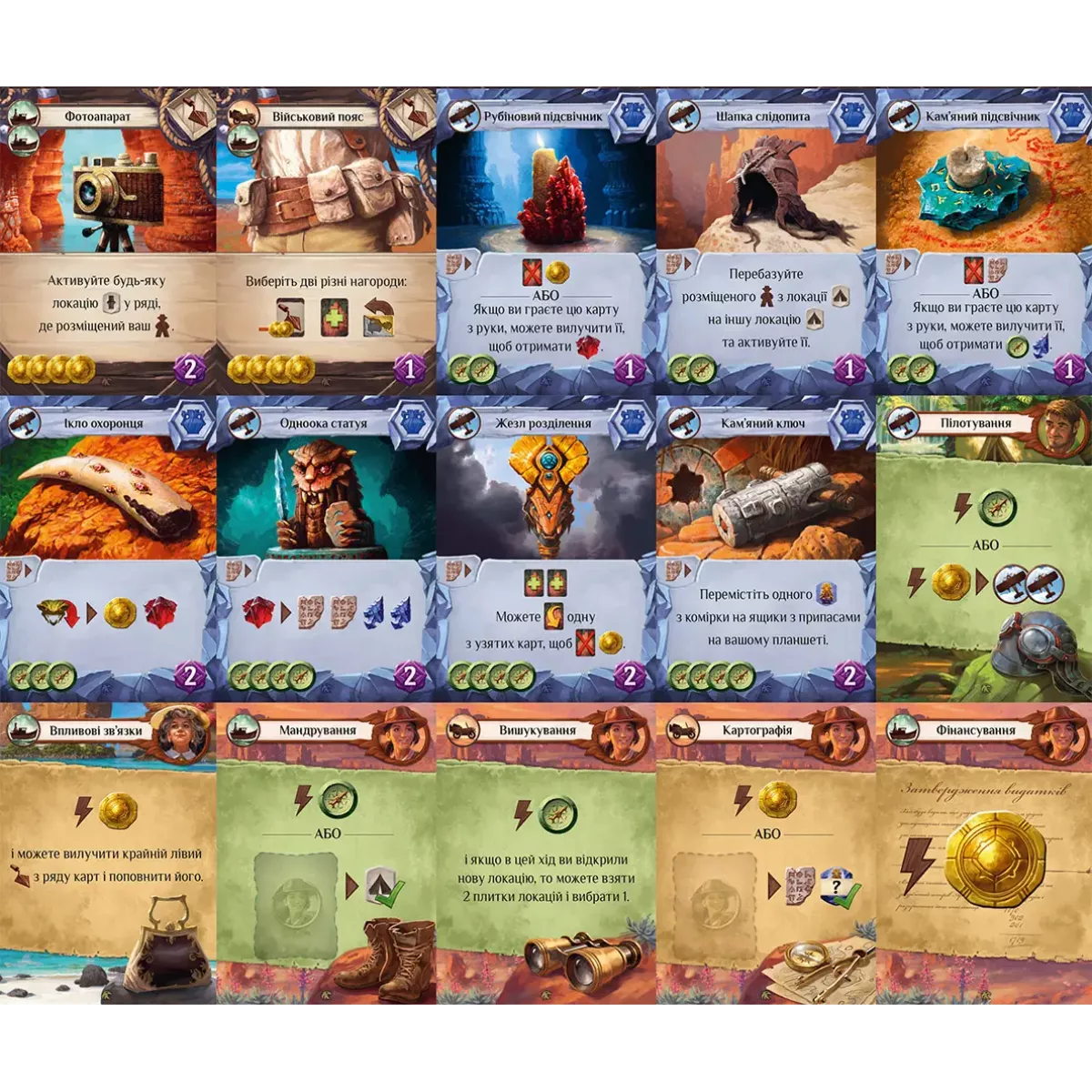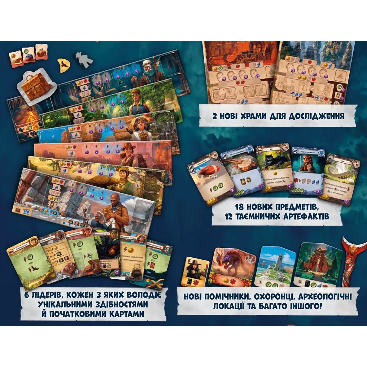 У коробці 6 планшетів лідерів;, 24 картки лідерів (по 4 на лідера);, двосторонній трек дослідження;, 18 карток предметів;, 12 карток артефактів;, 4 тайли 1 рівня;, 3 тайли 2 рівня;, 3 тайли помічників;, 4 тайли ідола;, 5 тайлів захисників;, посох червоного Місяця;, 6 жетонів випадкових ролей;, 4 тайли наметів;, правила гри;, компоненти лідера -, сіра фішка археолога,, тайл із зображенням орла,, тайл валізи,, 3 жетони закуски.