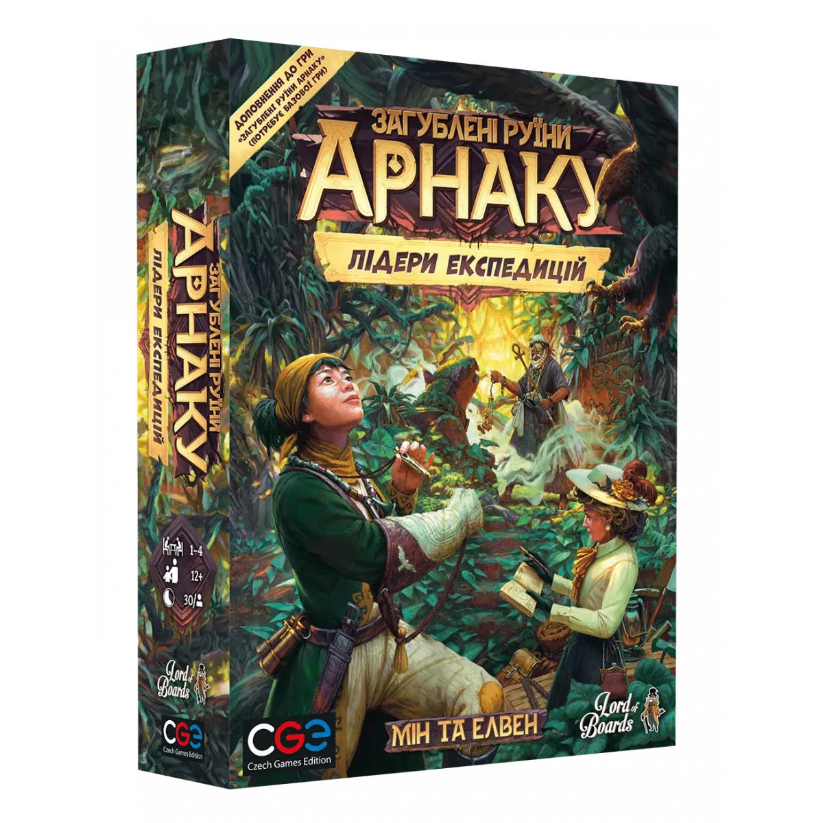 Увага! Для гри потрібна базова гра Загублені руїни Арнаку.   Тепер розкриються секрети. Тепер відчиняться всі двері... Ми знову прибули на Арнак, але наші методи дослідження не схожі на методи жодної з попередніх експедицій. Поверніться на таємничий острів Арнак разом із доповненням до гри Загублені руїни Арнаку: Лідери експедицій! Додайте своїй експедиції гостроти відчутів, вибравши одного з шести унікальних лідерів, кожен з яких має різні здібності, навички та стартові колоди, які пропонують різні стратегії та стилі гри. На додаток до здібностей лідера, які привносять у гру новий елемент асиметрії, це доповнення містить альтернативні дослідницькі шляхи, що означає ще більше різноманітності та більше завдань, нові предмети та карти артефактів для створення нових комбінацій та синергії, а також більше охоронців та помічників.   Загублені руїни Арнаку — це відзначена найвищими нагородами атмосферна настільна гра, яка пропонує унікальну комбінацію розміщення робітників та створення колоди, в той час як кожен гравець намагається розкрити таємниці втраченого острова. Що нового дає доповнення: 1.  Лідери експедицій Кожен гравець бере на себе роль лідера експедиції, який володіє особливими здібностями та власними стратегіями дослідження острову Арнак. Гравці можуть обирати собі лідерів у будь-який зручний спосіб. Якщо бажаєте розподілити лідерів навмання, то долілиць перемішайте планшети ролей і роздайте кожному гравцеві по одному. За деяких лідерів грати доволі легко, а деякі - вимагають певного досвіду, аби ви могли якомога ефективніше використовувати їх можливості. Нижче подано перелік усіх лідерів, починаючи від простіших до складніших; для гравців, що вперше гратимуть у Загублені руїни Арнаку, радимо вибирати лідерів з верхньої частини списку. КАПІТАН: військовий, чия мужність надихає його велику команду, має 3 археологів. МИСЛИВИЦЯ: жінка, яка знає все про птахів і тварин, має орла, якого може послати за корисними дрібничками. БАРОНЕСА: пристрасна поціновувачка мистецтва, але також і прониклива інвесторка, яка знає чимало способів, як діставати потрібні для експедиції предмети. ПРОФЕСОР: науковець, що вивчає мови й культури зниклих цивілізацій, знайомства в академічних колах дають йому доступ до більшого вибору артефактів. ДОСЛІДНИЦЯ: жінка, яка воліє досліджувати острів самотужки, має лише одного археолога, але може з ним відвідувати кілька локацій. МІСТИК: найзагадковіший лідер з усіх, адже знає багато способів, як отримати й позбутися карт страху, які він може використати для проведення таємних ритуалів.   2.  Нові треки дослідження Щоб грати з одним з нових треків дослідження, просто покладіть нове поле досліджень зверху тієї чи іншої сторони ігрового поля з базової коробки гри. Радимо використовувати сторону храму Змії, адже його локації мають цікавішу вартість подорожей. Досліджуючи храм Мавпи чи храм Ящірки, ви можете знайти цікаві предмети з історії Арнаку ще до того, як дійдете до кінця шляху. Можна вивчати плитки храму замість того, щоб просуватися треком, якщо ваша лупа досить близько до самого храму. 3.  Варіант гри з червоним місячним посохом Для того, щоб під час гри мати більший вибір предметів і артефактів, гравці можуть погодитися грати з червоним місячним посохом. Наприкінці раунду червони