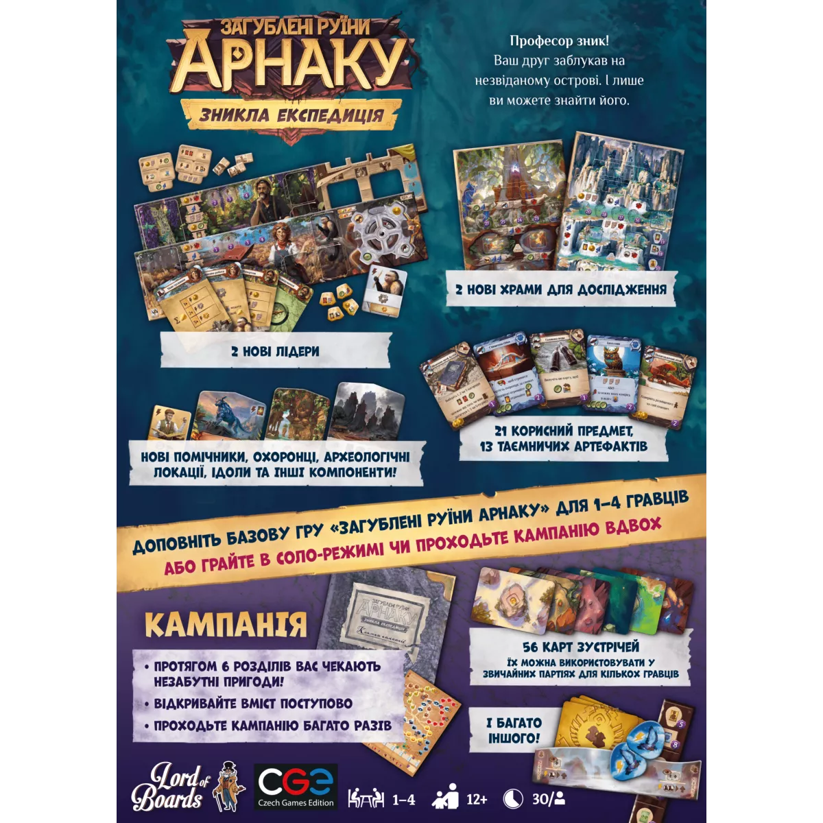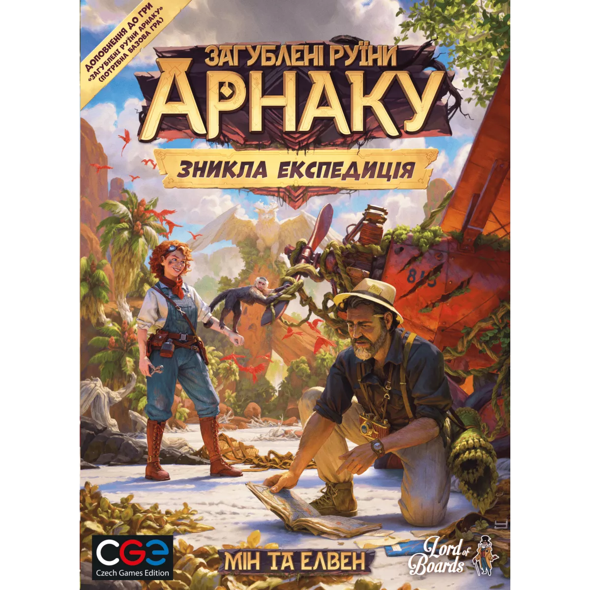 Увага! Це доповнення. Для гри потрібна базова гра Загублені руїни Арнаку.   Серед джунглів прокричав сполоханий птах, чогось злякавшись промайнув сполоханий звір, а ось - якісь зламані гілки. Невже окрім нас на цьому острові є ще хтось?.. Не може бути, це ж загублена експедиція! Загублені руїни Арнаку: Зникла експедиція (Lost Ruins of Arnak: The Missing Expedition) - це досить велике доповнення до базової гри Загублені руїни Арнаку, яке додасть до гри ще цілий оберемок різноманіття! До прикладу, ви отримаєте вже знайому по доповненню Лідери експедицій механіку із двома унікальними дослідниками – механіком та репортером,  нові стародавні артефакти, спорядження, чудовиська із самих глибин джунглів, а також два нових незвіданих дослідницьких маршрути (це якщо старий храм ви вже вивчили до останнього камінчика), кожен з яких обіцяє нові скарби та стратегії отримання переможних очок. Ви готові дізнатися про долю загублених дослідників острову та поринути у ще більш різноманітні пригоди острова Арнак? Тоді не баріться, замовляйте коробочку із доповненням Загублені руїни Арнаку: The Missing Expedition та приєднуйтеся до захоплюючих подорожей! Також пам’ятайте, якщо ви бажаєте додати до гри Загублені руїни Арнаку ще більше дослідників із унікальними особливостями, механіками та власним ігроладом – вам варто придбати коробочку із доповненням Загублені руїни Арнаку: Лідери експедицій.