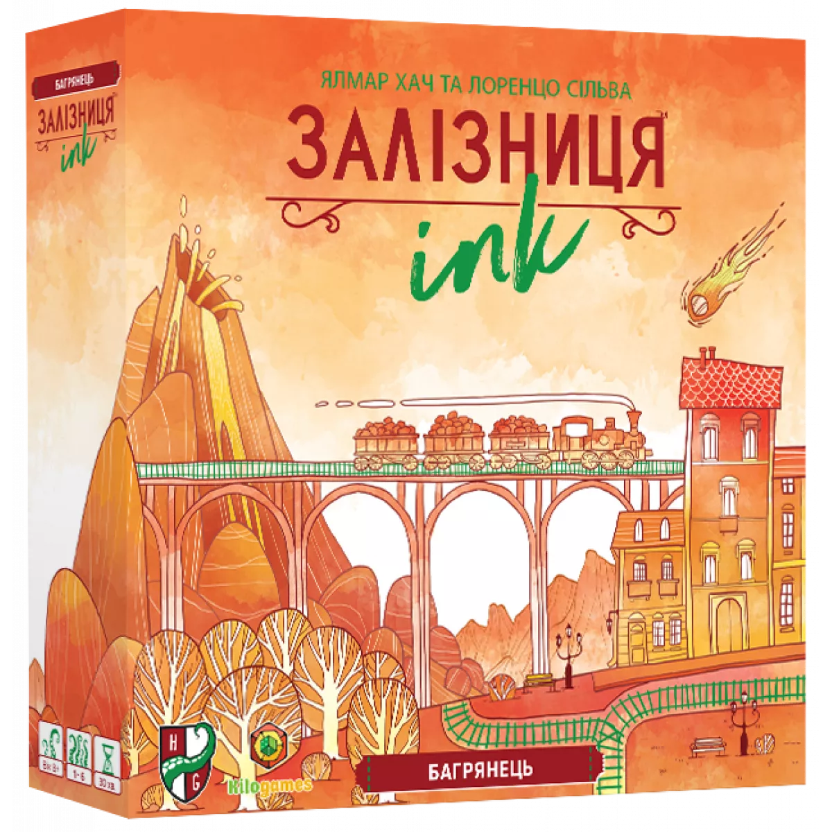 Залізниця Ink. Багрянець (Railroad Inc Red Edition) - це захоплююча логічна гра, в якій вам треба з'єднати дорогами якнайбільше міст. Все просто: кидаєте кубики, і вам випадає випадковий набір залізниць, автомобільних шосе, перехресть, а також річок з озерами. Замалюйте їх на своєму планшеті так, щоб ви отримали карту доріг. Чим більше і краще ви збудуєте через сім таких ходів, тим ближче будете до перемоги. У вас є планшет, на якому ви малюєте дороги. Почніть із одного з виходів і ведіть дорогу до наступного. Окрім кубиків, у вас є ще 6 спеціальних шляхів на планшеті. Вони одноразові, тому краще їх притримати. Вони стануть у нагоді, якщо ви раптом заплутаєтесь у дорожній мережі. Метеорити та лава – це додаткові кубики. Можете грати з ними, а можете без. Вони роблять гру цікавішою, але водночас складнішою. Метеорити падають у випадкові місця та руйнують ваші дороги. Лава розтікається та знищує все, що ви збудували. Але це можна використати! Направляйте дороги в кратери від метеоритів - дістанете корисних копалин і заробите очків. А лаву спробуйте обмежити і зупинити – також плюс до ваших очків.