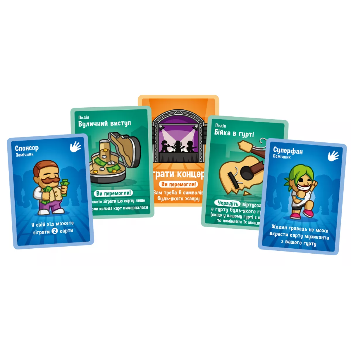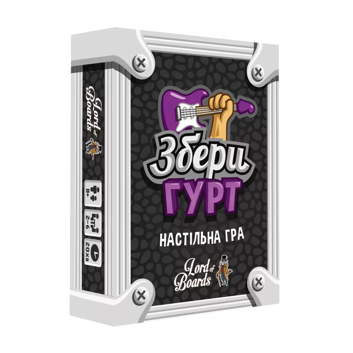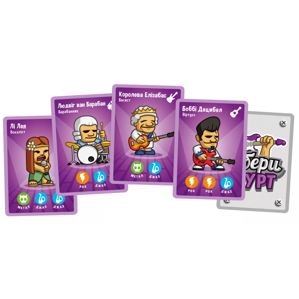 Багато хто з нас колись мріяв освоїти музичний інструмент і виступати в гурті, створюючи справжнє мистецтво. Збери Гурт (Grab Band) наблизить гравців до світу великої музики та дозволить весело провести вечір у гарній компанії. Учасникам доведеться шукати кращих музикантів, щоб об'єднати їх разом та створити легендарний гурт, ім’я якого буде вписане в історію. У картковій стратегії можуть брати участь до шести гравців, яким динамічні партії точно не залишать часу для нудьги. Хоча гра й має прості правила і зрозумілу структуру ходу, при цьому вона залишає достатньо можливостей для планування, втілення в життя різних стратегій, напруженого протистояння, підступних інтриг і може похизуватися високою реграбельністю. Творіть історію музики власноруч Збери Гурт – захоплююча сімейна гра, яка відмінно підійде і навіть об'єднає гравців різного віку, для веселих компаній, затятих «настільників» або новачків. Вона одночасно весела та запекло змагальна. У коробці на вас чекає 72 карти із зображеними на них музикантами. Більшість із них грають у різних стилях, тому навряд чи зможуть ужитися разом і створювати по-справжньому хорошу музику. Щоб зібрати власний гурт, гравцям необхідно об'єднати разом прихильників одного стилю та сприяти тому, аби вони почали грати свої пісні. Для справжнього колективу доведеться добренько пошукати барабанщика, басиста, віртуоза та інших майстрів своєї справи в залежності від обраного стилю. Звичайно ж, гурт не обійдеться і без вокаліста. Є кілька основних типів карток: - Карти музикантів, які грають у різних стилях. - Картки «Події», які дозволяють красти музикантів у суперників, влаштовувати бійки в групі, заважати іншим учасникам здобути перемогу і не тільки. - Картки «Помічників», які відкривають унікальні можливості, наприклад, дозволяють зіграти дві карти за хід або перешкодити опонентам вкрасти у вас карту з музикантом. Зіграйте свій перший концерт! Просто зібрати учасників разом недостатньо, оскільки це було б занадто просто. На кожній карті музиканта є спеціальні символи, які також називають значками жанру. Для перемоги гравець має зробити так, щоби гурт зіграв свій перший концерт. Як тільки колектив збере шість однакових символів жанру, він отримає можливість розіграти концертну карту, здобувши першість у напружених перегонах. Одна партія може займати від 15 до 45 хвилин і підійде навіть для двох гравців, але досвід гри в компанії обіцяє бути веселішим. Хоча гра здається максимально простою, а розібратися з правилами можна в процесі, вона забезпечує унікальний ігровий досвід під час кожної нової партії. Завдання полягає не лише в тому, щоб зібрати гурт і змусити його зіграти концерт для шанувальників. Важливо зробити так, щоб суперники не встигли досягти визначних результатів першими. А для цього доведеться думати наперед, прораховувати можливі дії опонентів, грамотно і вчасно розігрувати карти. Незважаючи на планування і стратегію, деякі речі все одно не можна контролювати, тож доведеться довіритися рандому. Беріть у руки колоду, знайомтеся ближче із кумедними персонажами та обирайте улюблений стиль музики, аби створити свою ідеальну групу. Приготуйтеся до веселощів, підступних витівок опонентів і до того, як непомітно пролітає час за кожною новою партією.